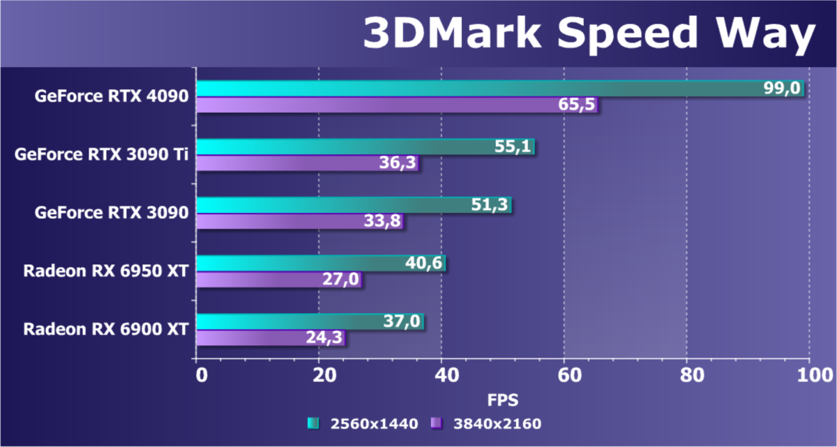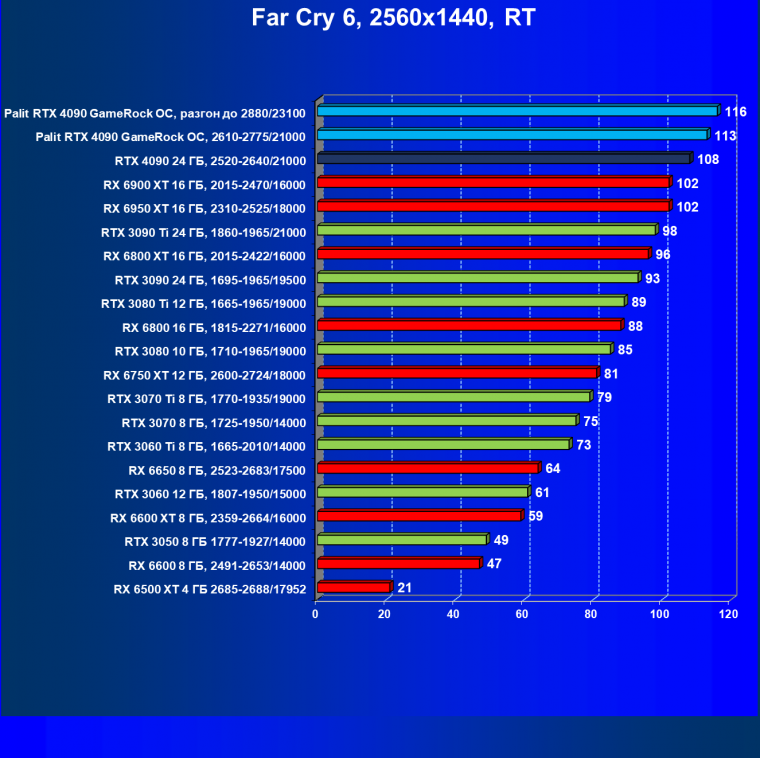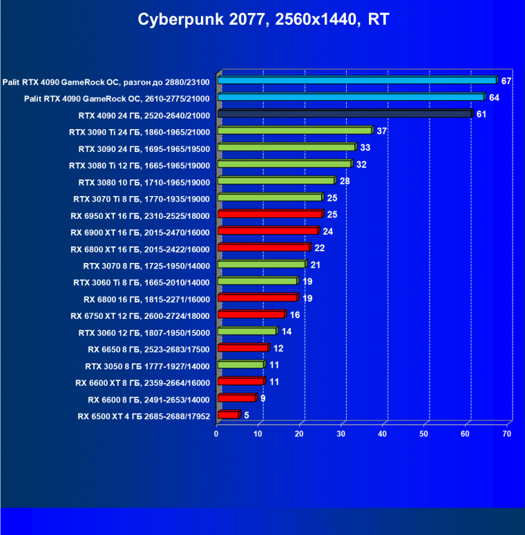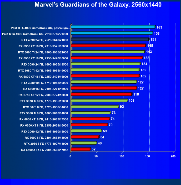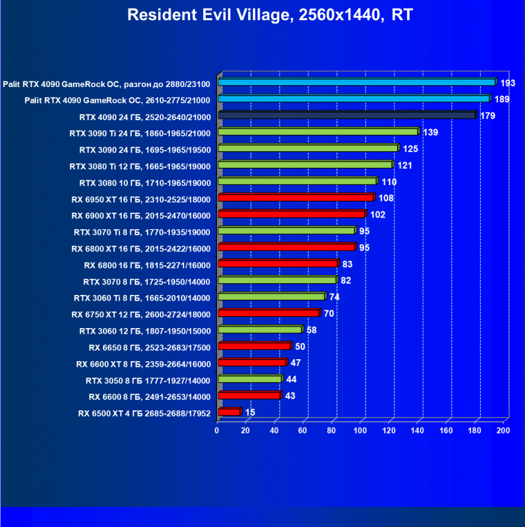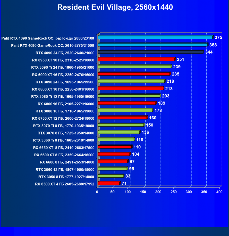 Полагаем, что комментарии излишни: лидерство RTX 4090 очевидно, средний прирост производительности относительно RTX 3090 Ti и RX 6950 XT по всем разрешениям составляет 27%, а в разрешении 4К — и вовсе 47%. Карта Palit за счет фабричного разгона быстрее еще на 4,5%.