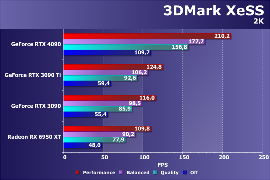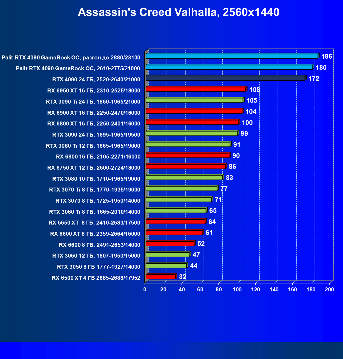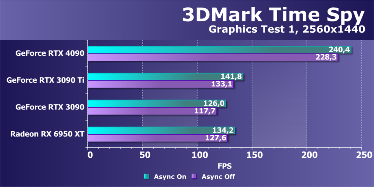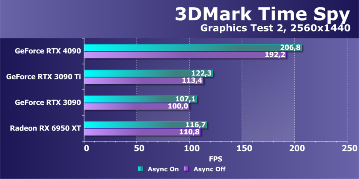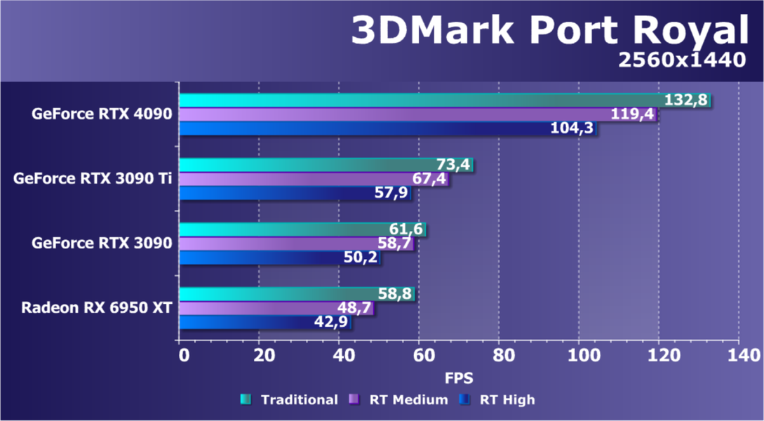 Полагаем, что комментарии излишни: лидерство RTX 4090 очевидно, средний прирост производительности относительно RTX 3090 Ti и RX 6950 XT по всем разрешениям составляет 27%, а в разрешении 4К — и вовсе 47%. Карта Palit за счет фабричного разгона быстрее еще на 4,5%.