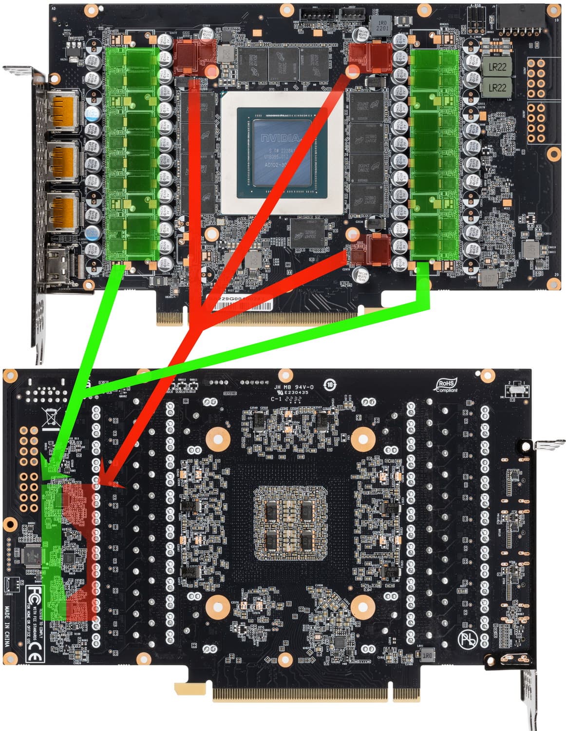 Зеленым цветом отмечена схема питания ядра, красным — памяти. Следует еще заметить, что, в отличие от референс карты GeForce RTX 4090 FE и Palit GeForce RTX 3090 Ti GameRock, где применены очень качественные элементы VRM производителя Monolithic Power Systems (DrMOS на 70 А, многофазный ШИМ-контроллер), здесь элементная база выбрана попроще, подешевле.
