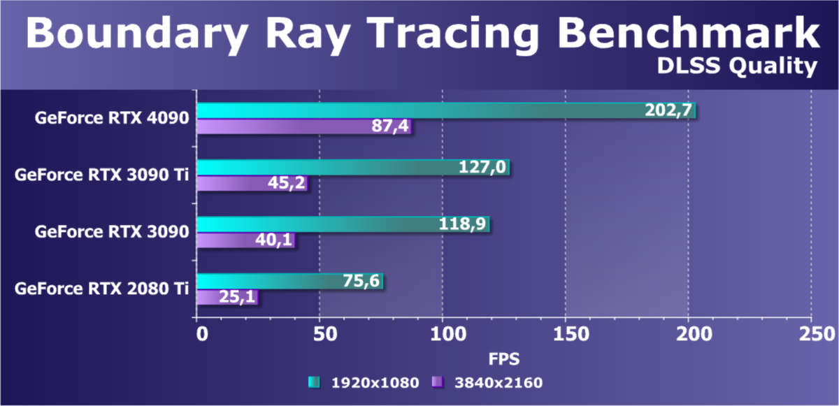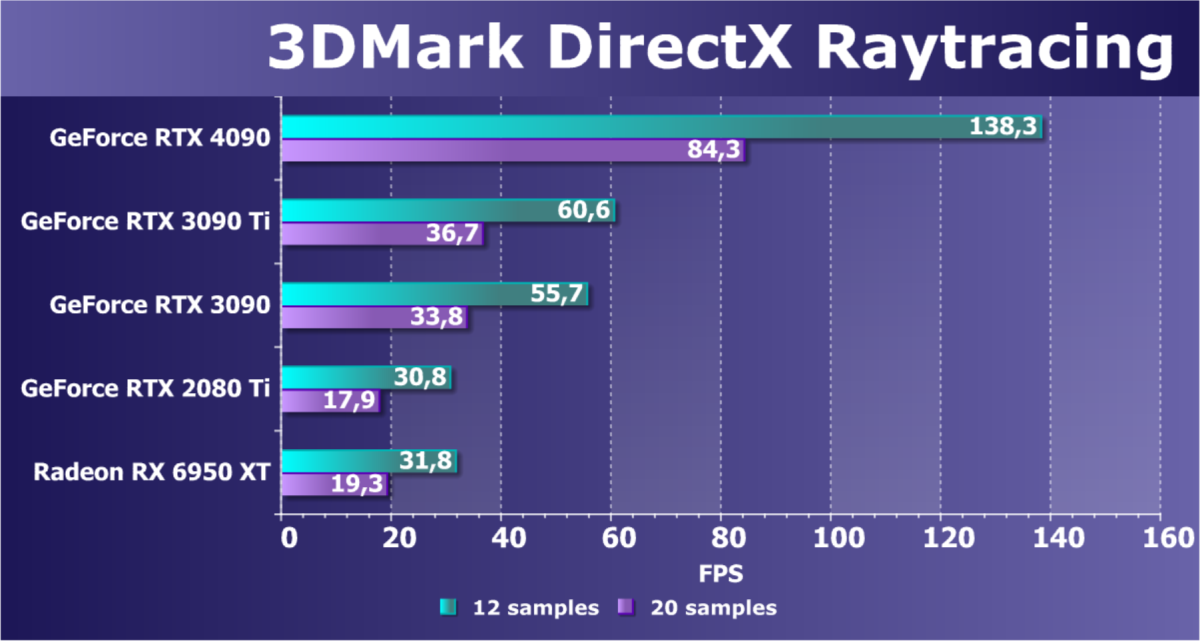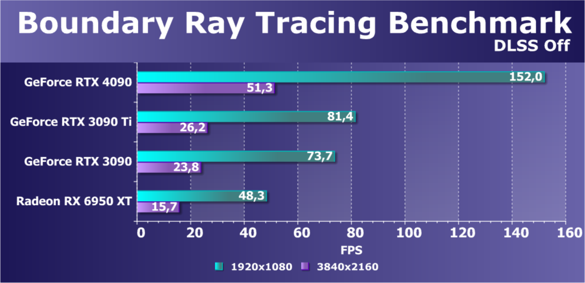 Конечно, некоторое падение производительности при активации в играх трассировки лучей имеется, но мы знаем, что появляется все больше и больше игр с поддержкой Nvidia DLSS, а эта технология «умного» антиалиасинга позволяет резко поднять производительность, в том числе компенсируя падение от включения RT, а иногда DLSS поднимает производительность даже выше уровня, который выдают карты семейства RTX без трассировки лучей (когда массово начнет внедряться DLSS 3, можно будет вообще забыть о том, чтобы отключать трассировку в играх). Также становится всё больше игр с поддержкой AMD FSR (еще одна технология умного масштабирования картинки), а она работает и на картах Nvidia. Всё это говорит о том, что в целом выводы не меняются: RTX 4090 и в играх с RT способен обеспечить полный комфорт на максимальных настройках графики в разрешении 4К. Про 8К пока умолчим, этому вопросу будет посвящена отдельная статья.
