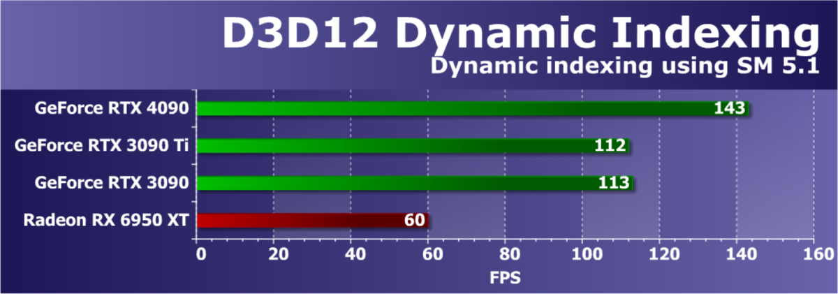 Возможности исполнительных блоков в новой архитектуре Ada Lovelace были серьезно улучшены, особенно это касается аппаратной трассировки лучей. Само определение пересечений луча и треугольника в третьем поколении RT-ядер было ускорено вдвое, но еще интереснее дополнительные аппаратные блоки в RT-ядрах: Opacity Micromap Engine, ускоряющий обработку полупрозрачных объектов, вроде языков пламени и листьев, и Displaced Micro-Mesh Engine, способный снизить время построения структур BVH и сократить требования к объему геометрических данных для очень сложных объектов. Еще одна важная новая возможность — переупорядочивание выполнения шейдеров при трассировке лучей — Shader Execution Reordering. Специальный планировщик способен на лету оптимизировать загрузку вычислительных блоков мультипроцессора SM, что потенциально может обеспечить двух-трехкратное ускорение для многих алгоритмов трассировки лучей.