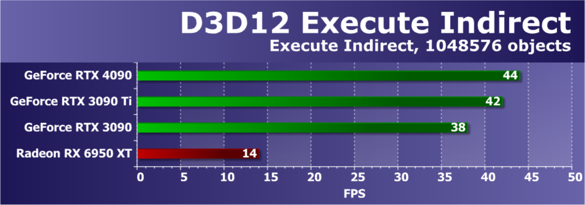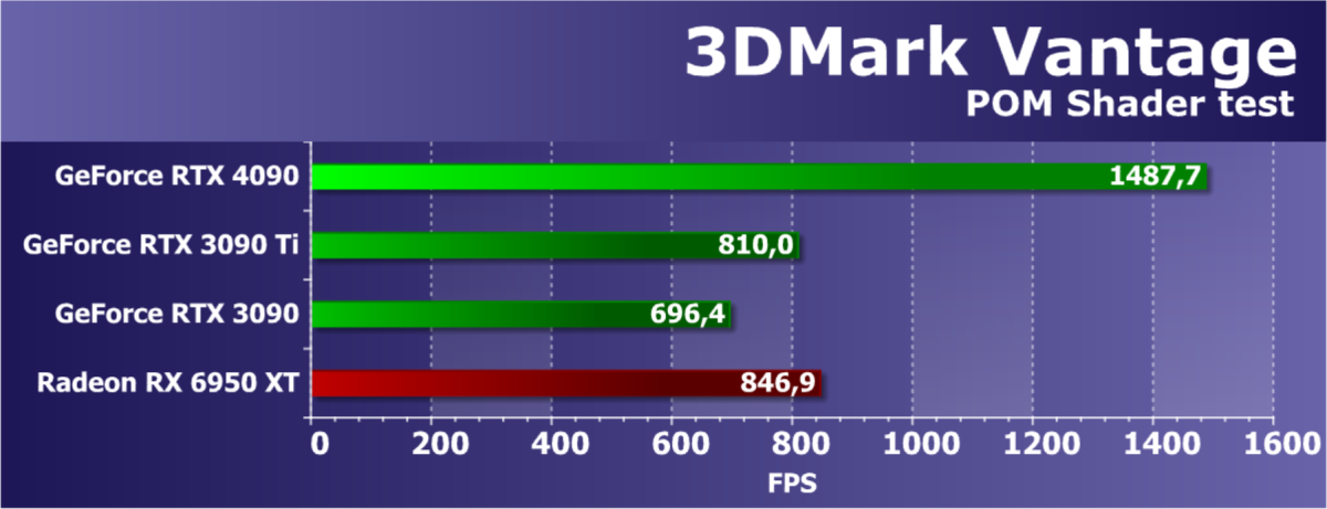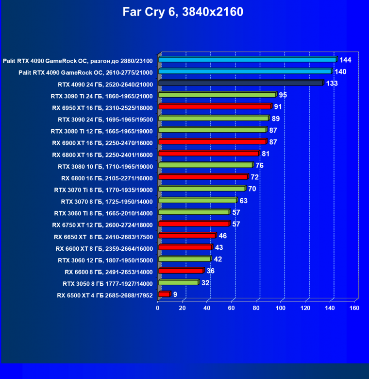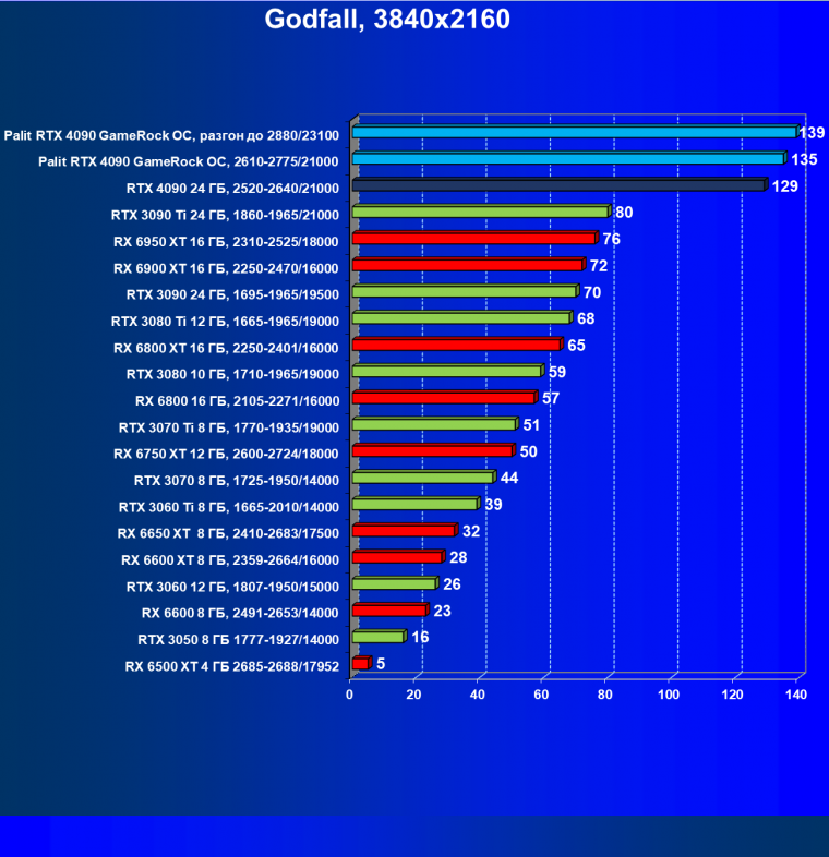 В данном случае лидерство RTX 4090 выражено еще более ярко относительно флагманов AMD вследствие большего падения производительности у тех при включении RT. В среднем прирост производительности относительно RTX 3090 Ti по всем разрешениям составляет 26%, а в разрешении 4К — 43%. Карта Palit за счет фабричного разгона опять же еще немного быстрее. Разница же в производительности с RX 6950 XT в данном случае составляет 48% по всем разрешениям и аж 91%(!) в 4К.