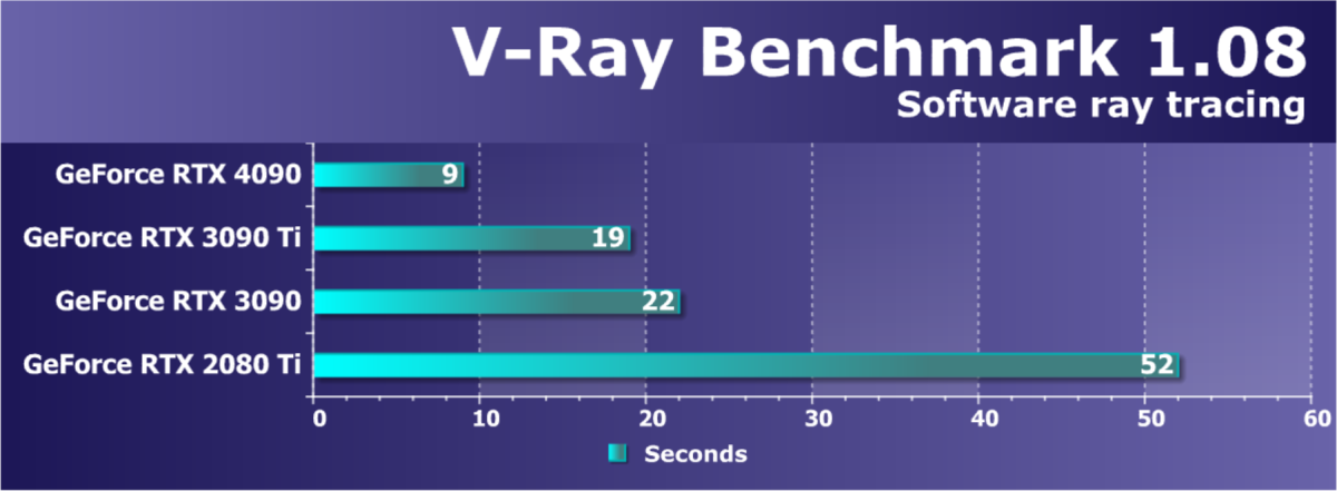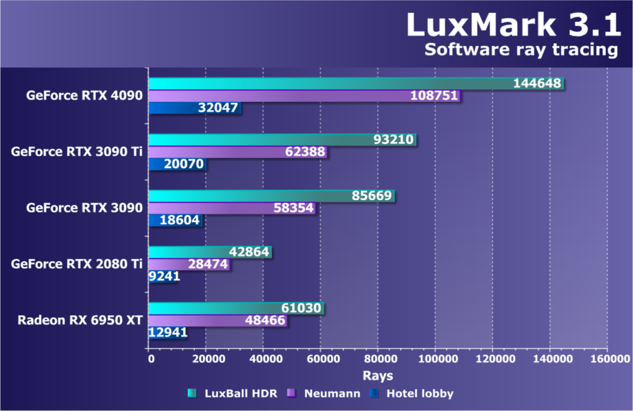 Также мы помним, что GeForce RTX 4090 (как и GeForce RTX 3090/Ti) нацелен не только на игровой сегмент, но и на использование в профессиональной сфере — например, для 3D-моделирования. И еще тестируя GeForce RTX 3090, мы убедились, что объем памяти в 24 ГБ позволяет этому ускорителю легко работать с высококачественными, очень сложными моделями, тогда как на GeForce RTX 3080/Ti реализация тех же сценариев может приводить к падению программы или вызывать ошибку нехватки памяти. Так что GeForce RTX 4090 — это одновременно и самое быстрое на сегодня игровое решение, и очень мощное полупрофессиональное.