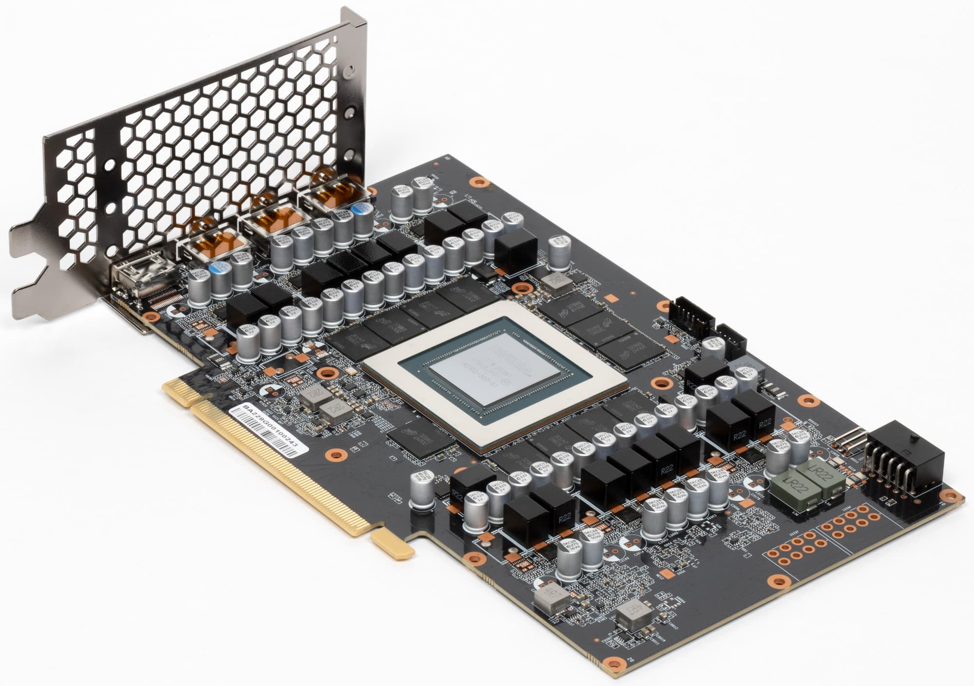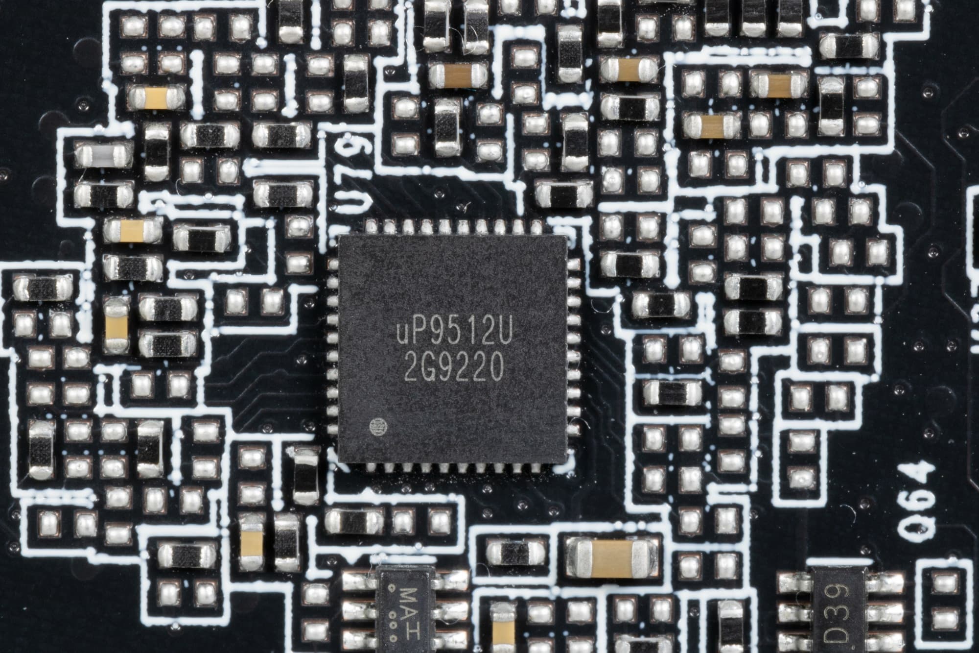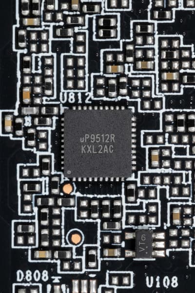 Все контроллеры расположены на оборотной стороне PCB. Фазами питания ядра и микросхем памяти управляет тандем из двух ШИМ-контроллеров uPI Semi — uP9512U (максимум 12 фаз) и uP9512R (максимум 8 фаз). Возможно, именно ограничение по количеству фаз питания до 20 заставило разработчиков отказаться от установки всех возможных фаз питания GPU.
