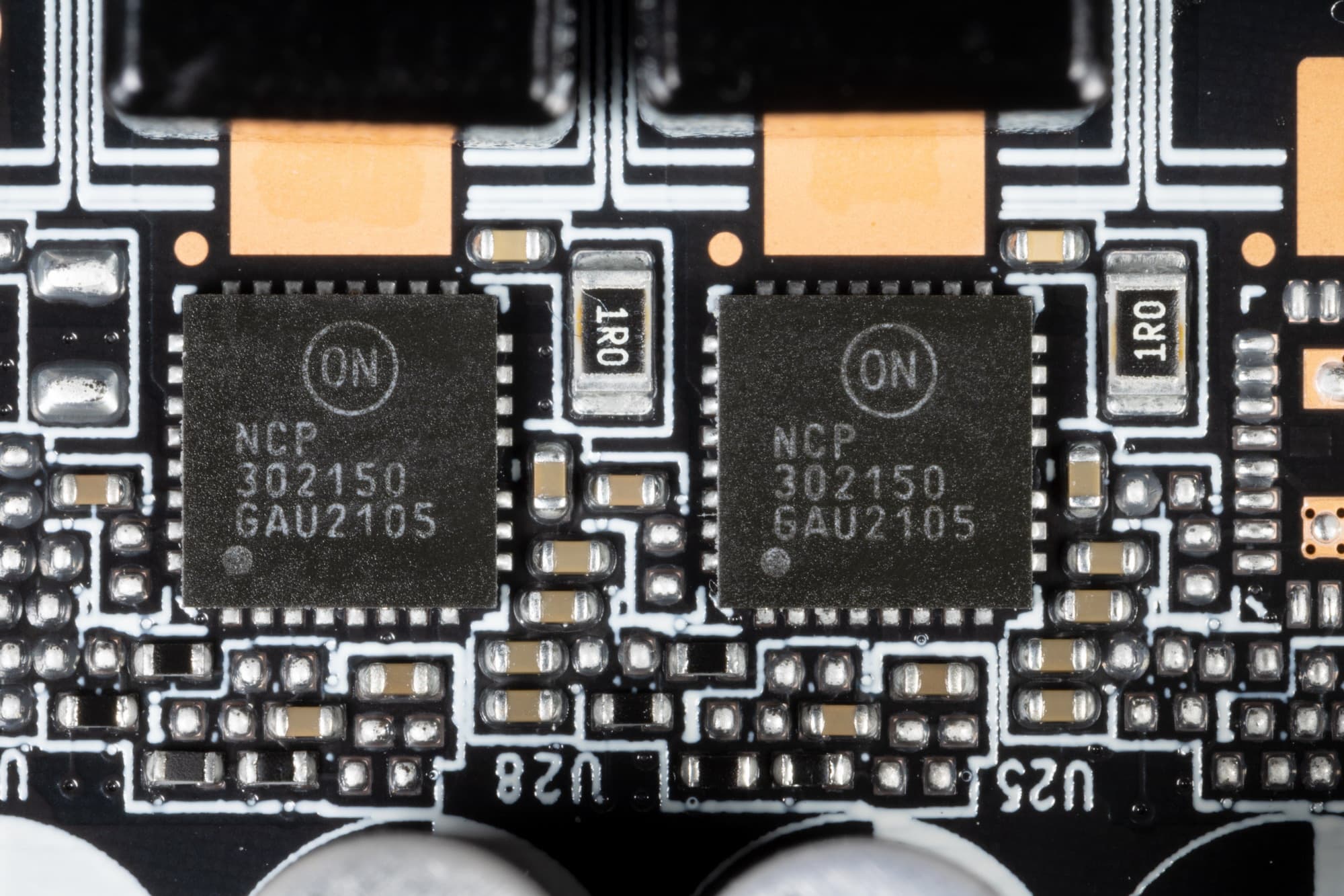 В преобразователе питания, традиционно для всех видеокарт Nvidia, используются транзисторные сборки DrMOS — в данном случае NCP302150 (On Semiconductor), каждая из которых рассчитана максимально на 50 А.