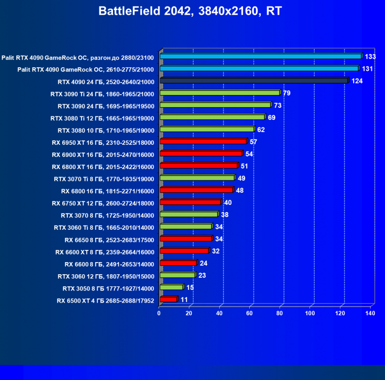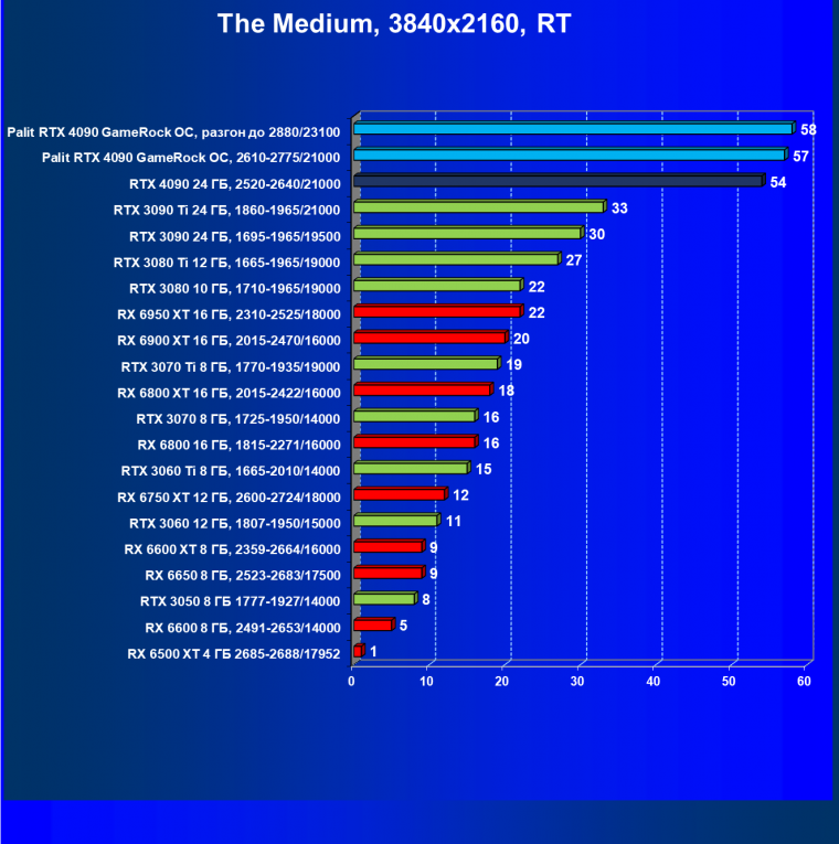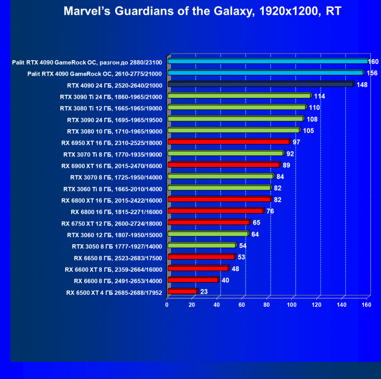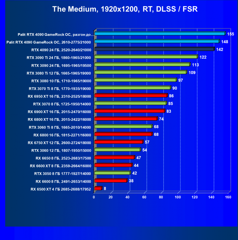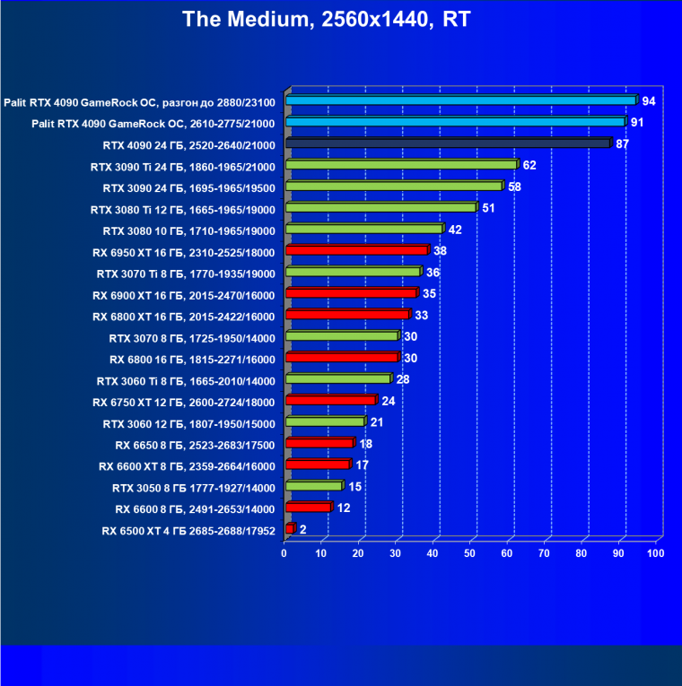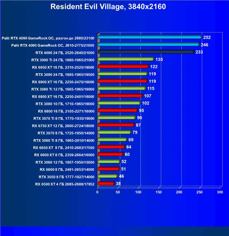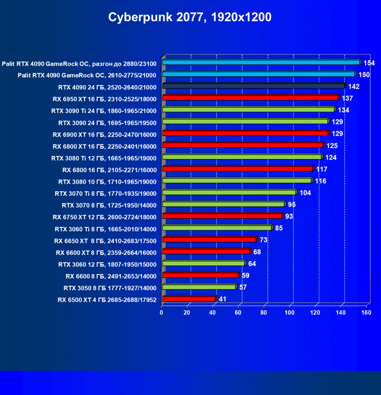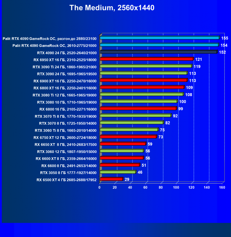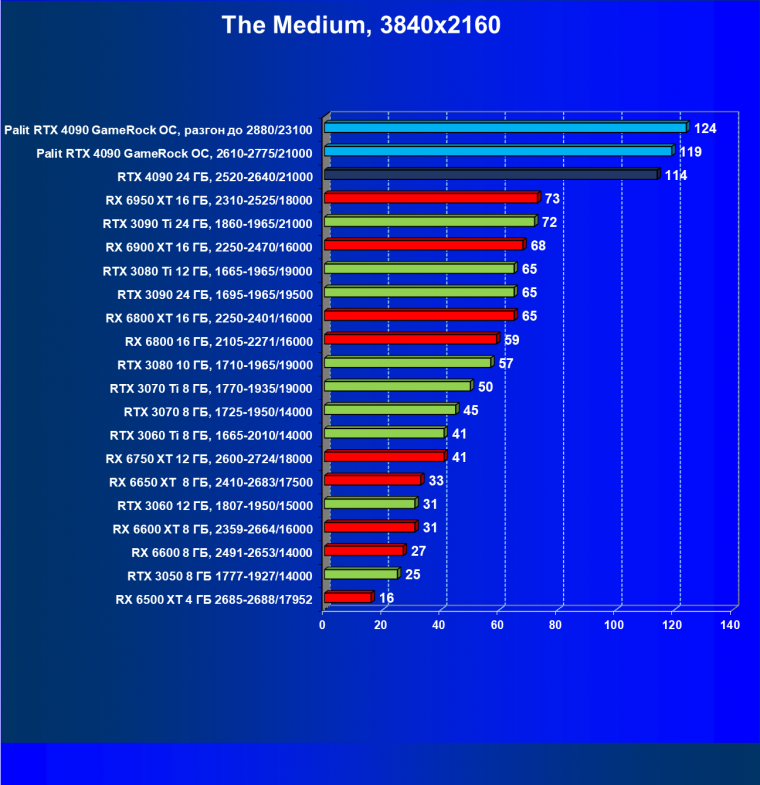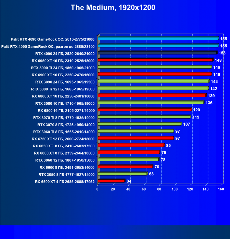 Полагаем, что долгих комментариев не требуется — и так понятно, что RTX 4090 лидер, во всех трех разрешениях его значок наверху. Что касается карты Palit, то она еще чуть быстрее референс-аналога.