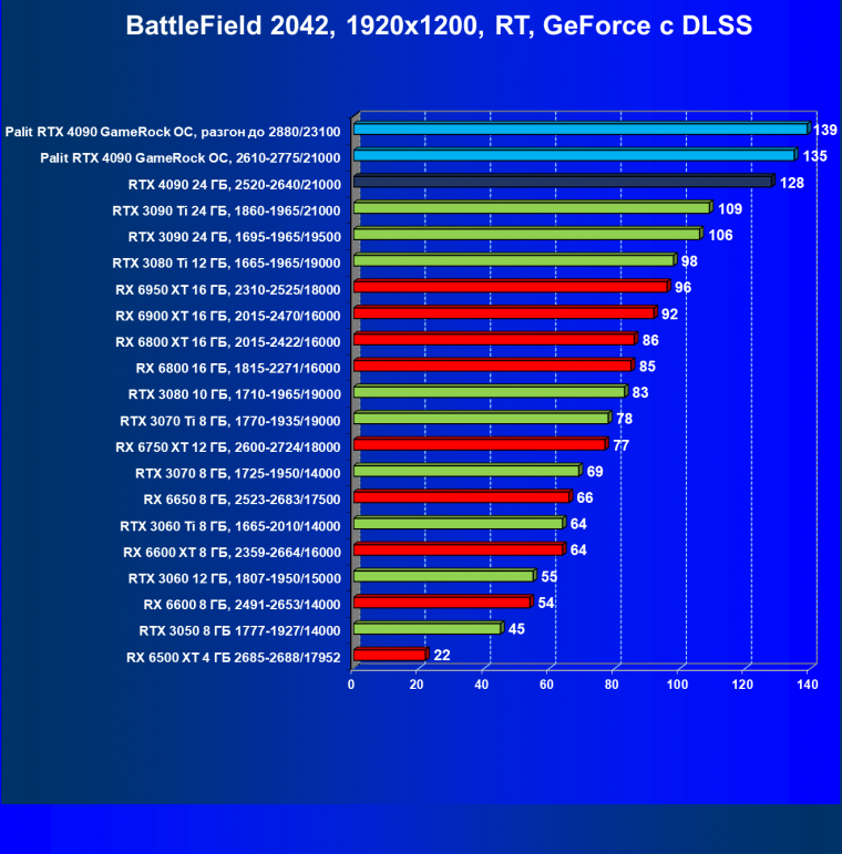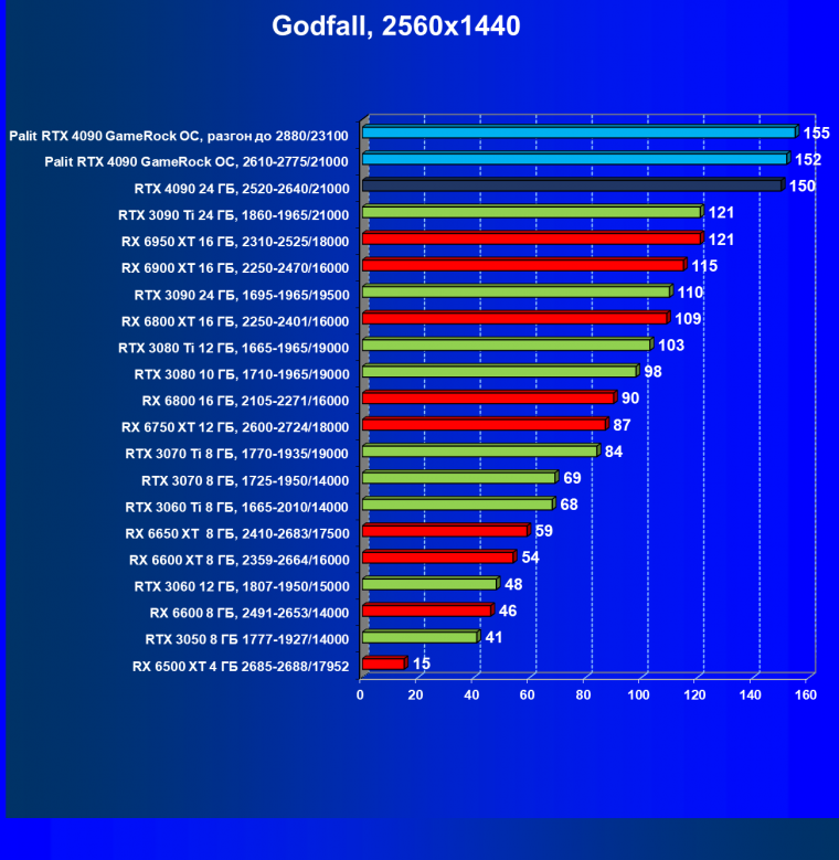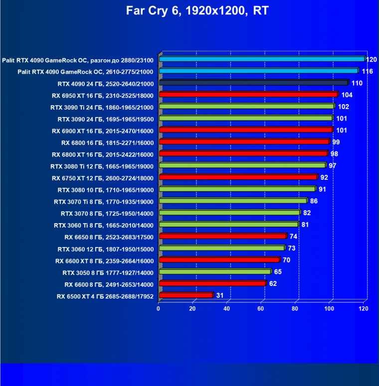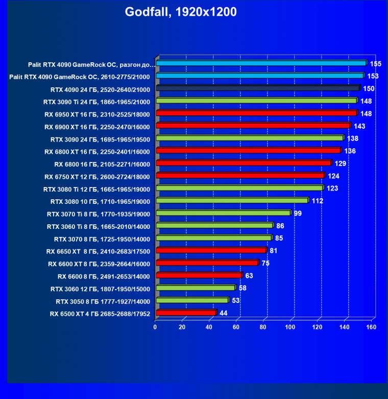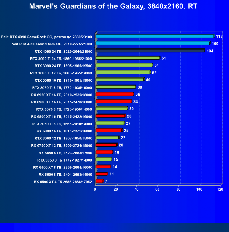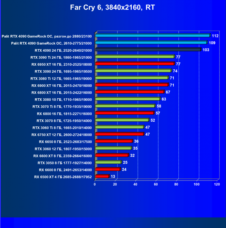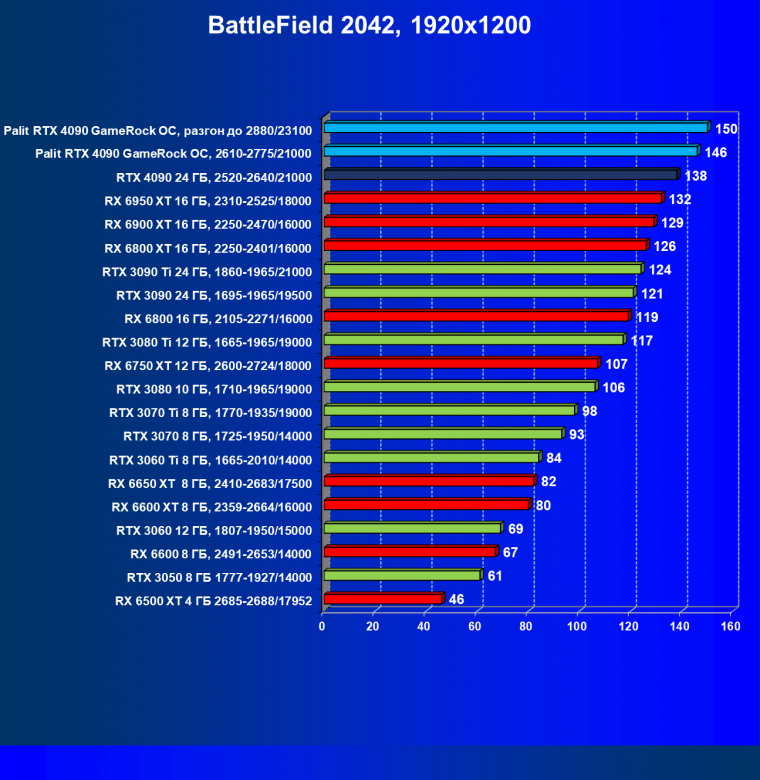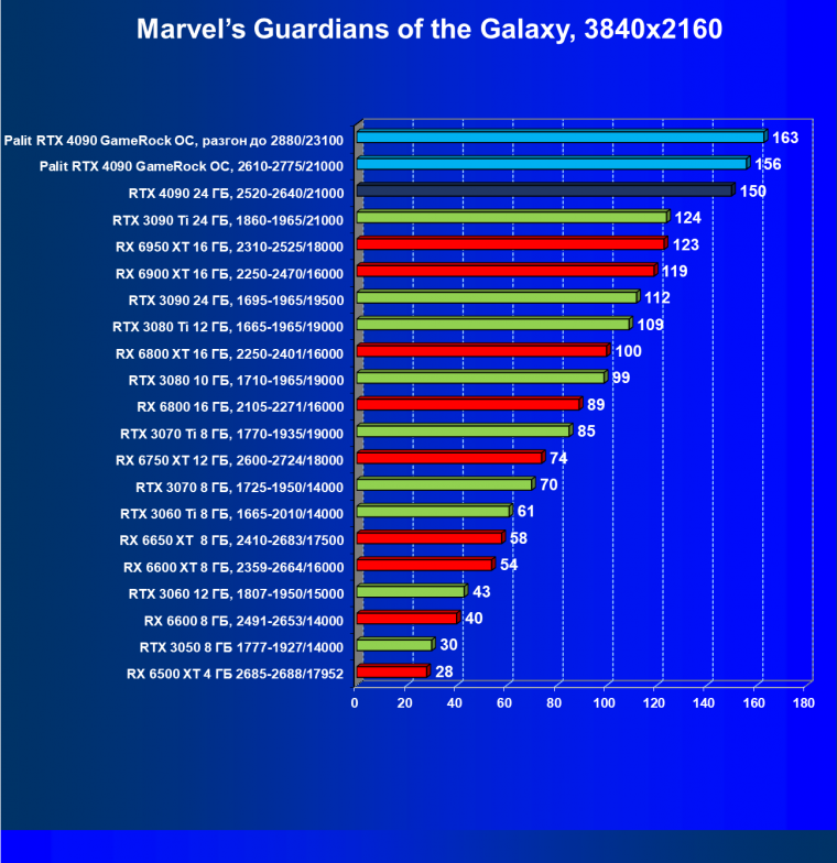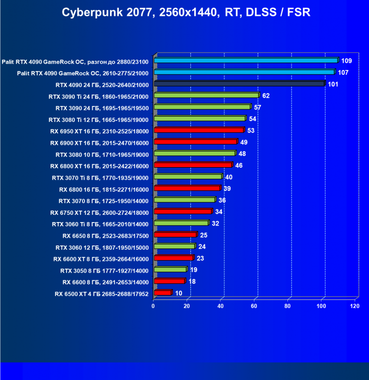 Полагаем, что долгих комментариев не требуется — и так понятно, что RTX 4090 лидер, во всех трех разрешениях его значок наверху. Что касается карты Palit, то она еще чуть быстрее референс-аналога.
