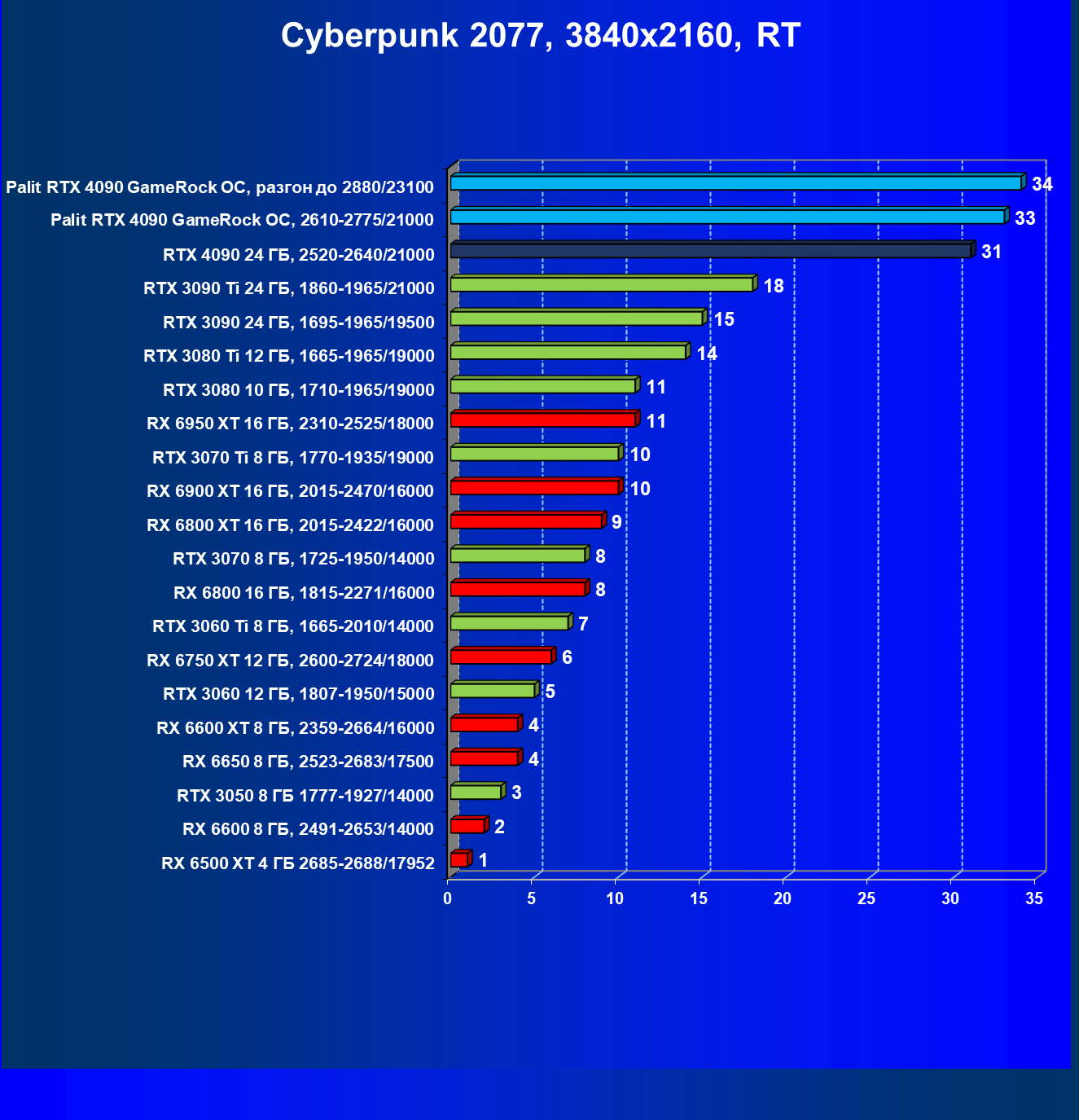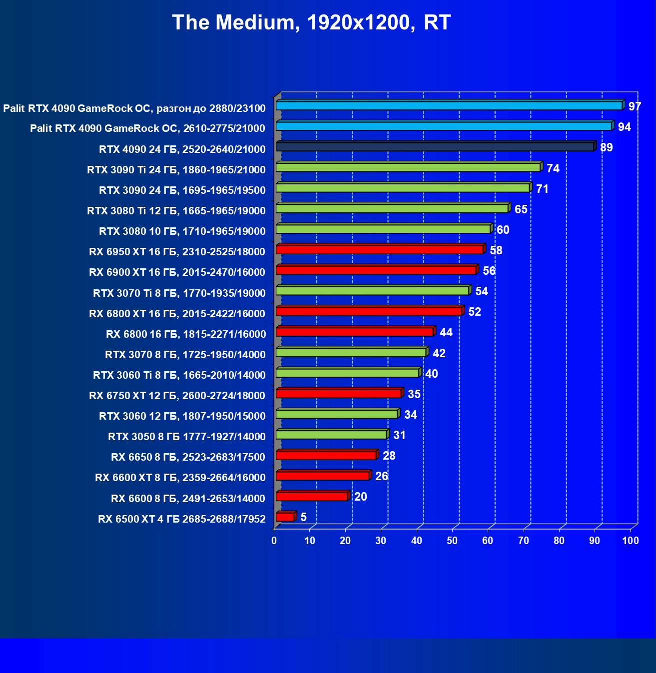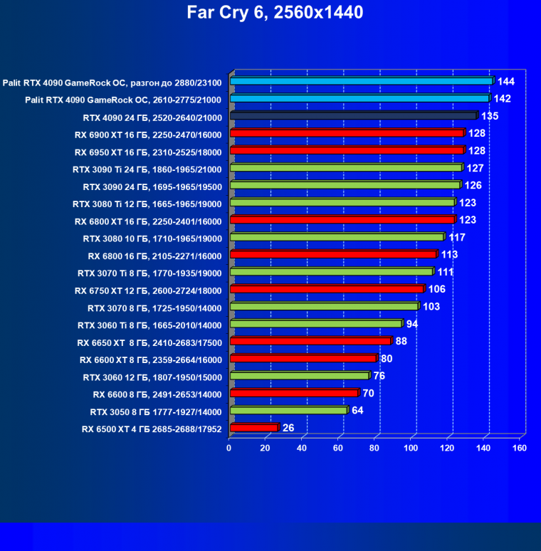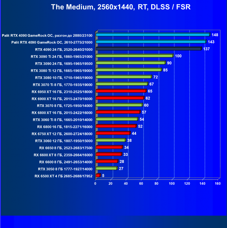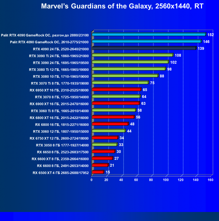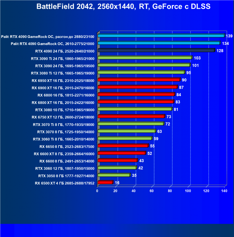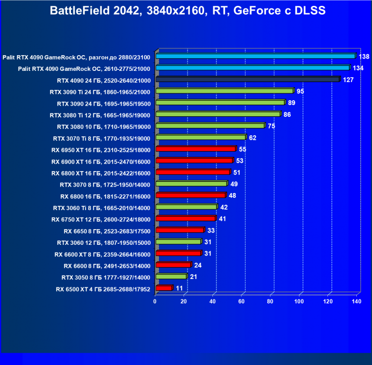 Полагаем, что долгих комментариев не требуется — и так понятно, что RTX 4090 лидер, во всех трех разрешениях его значок наверху. Что касается карты Palit, то она еще чуть быстрее референс-аналога.