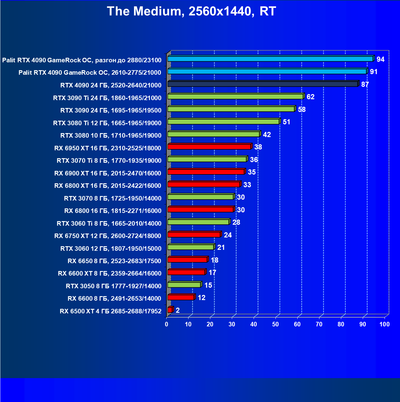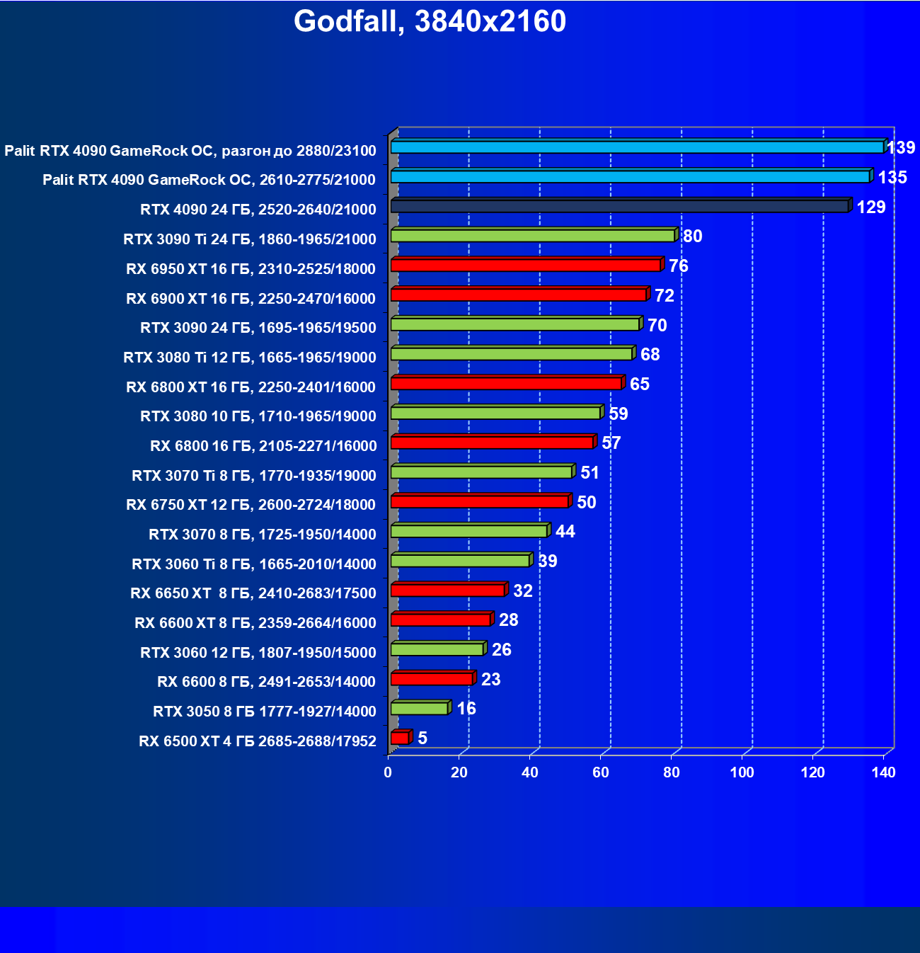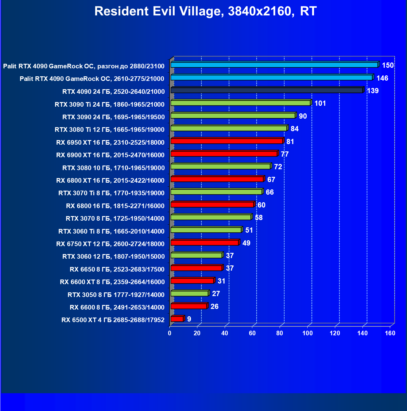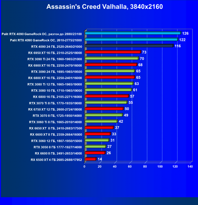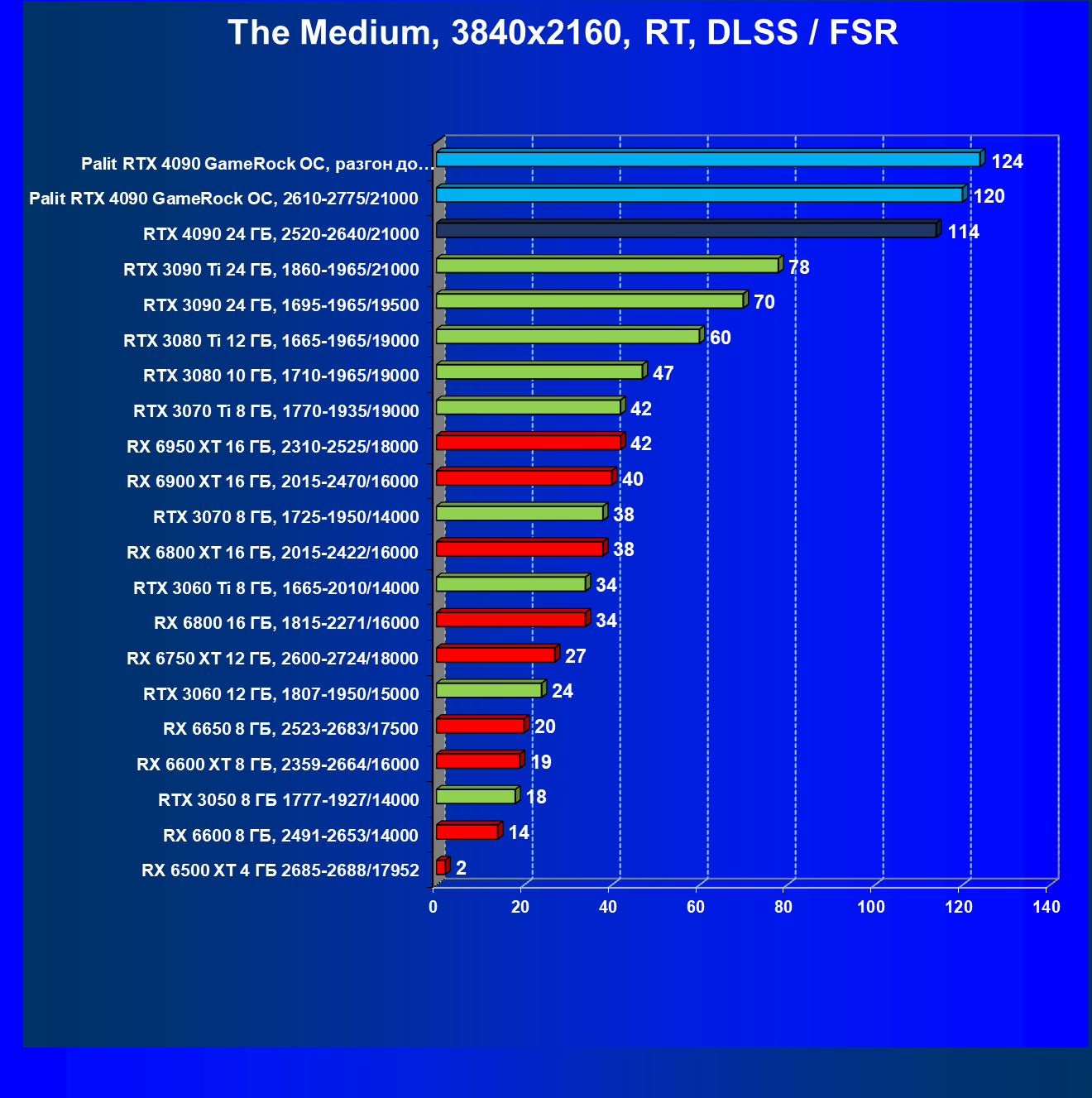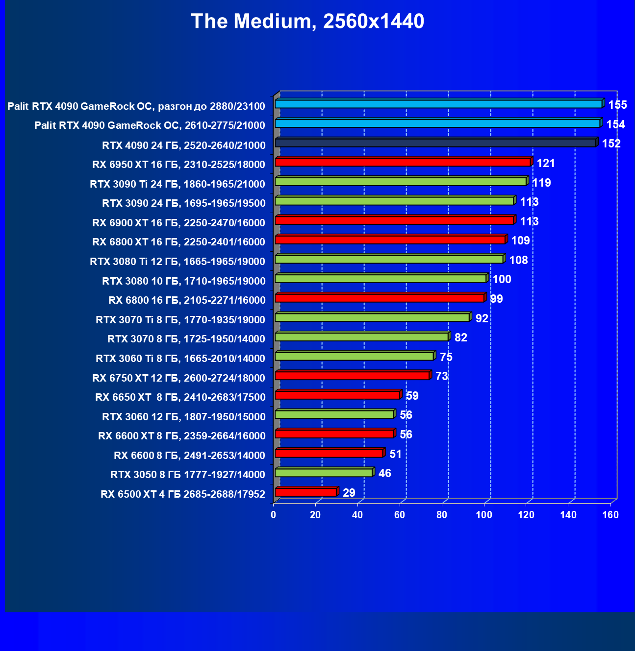 Полагаем, что долгих комментариев не требуется — и так понятно, что RTX 4090 лидер, во всех трех разрешениях его значок наверху. Что касается карты Palit, то она еще чуть быстрее референс-аналога.
