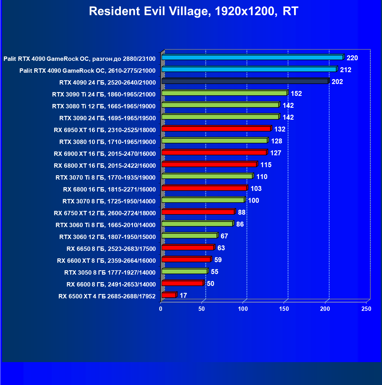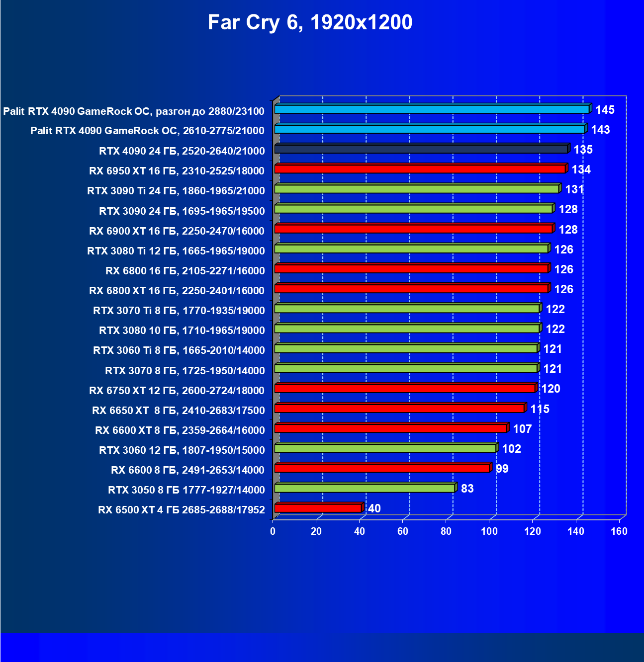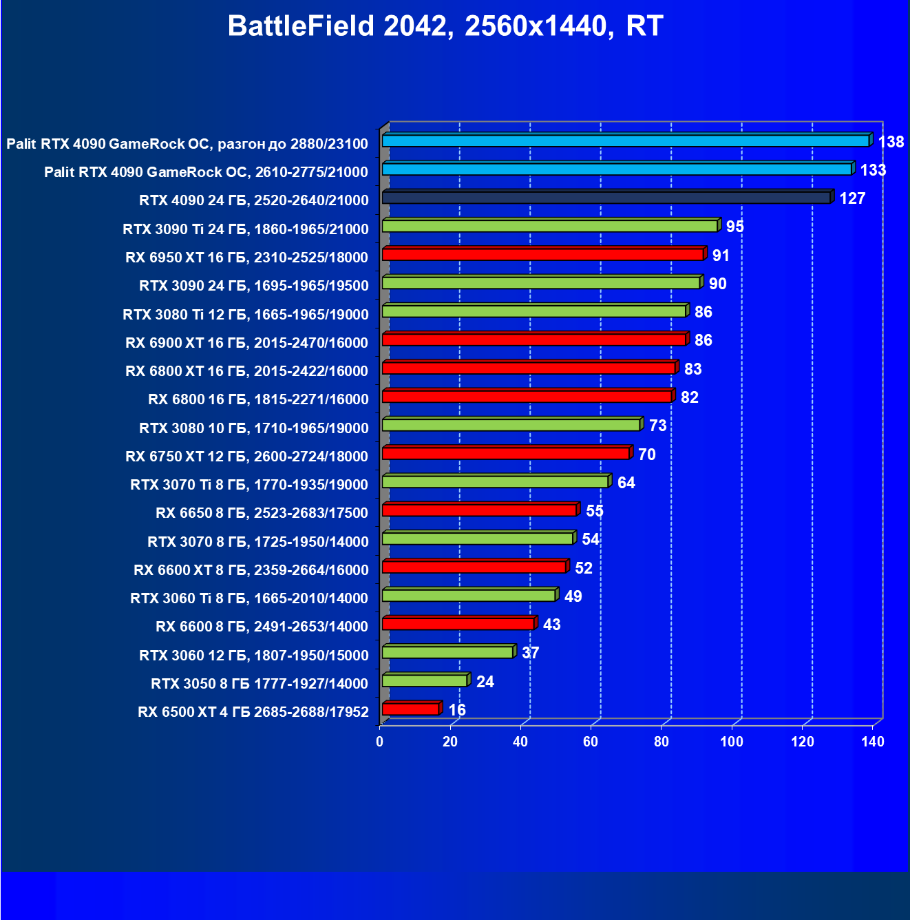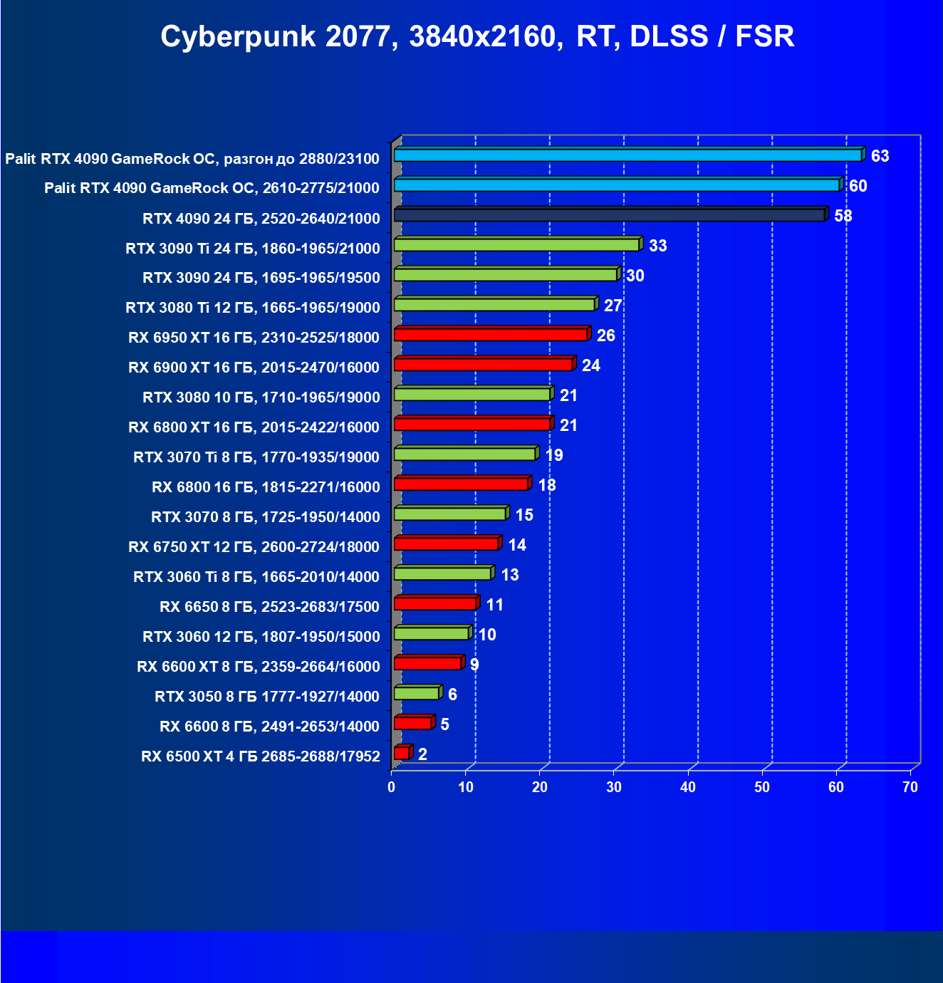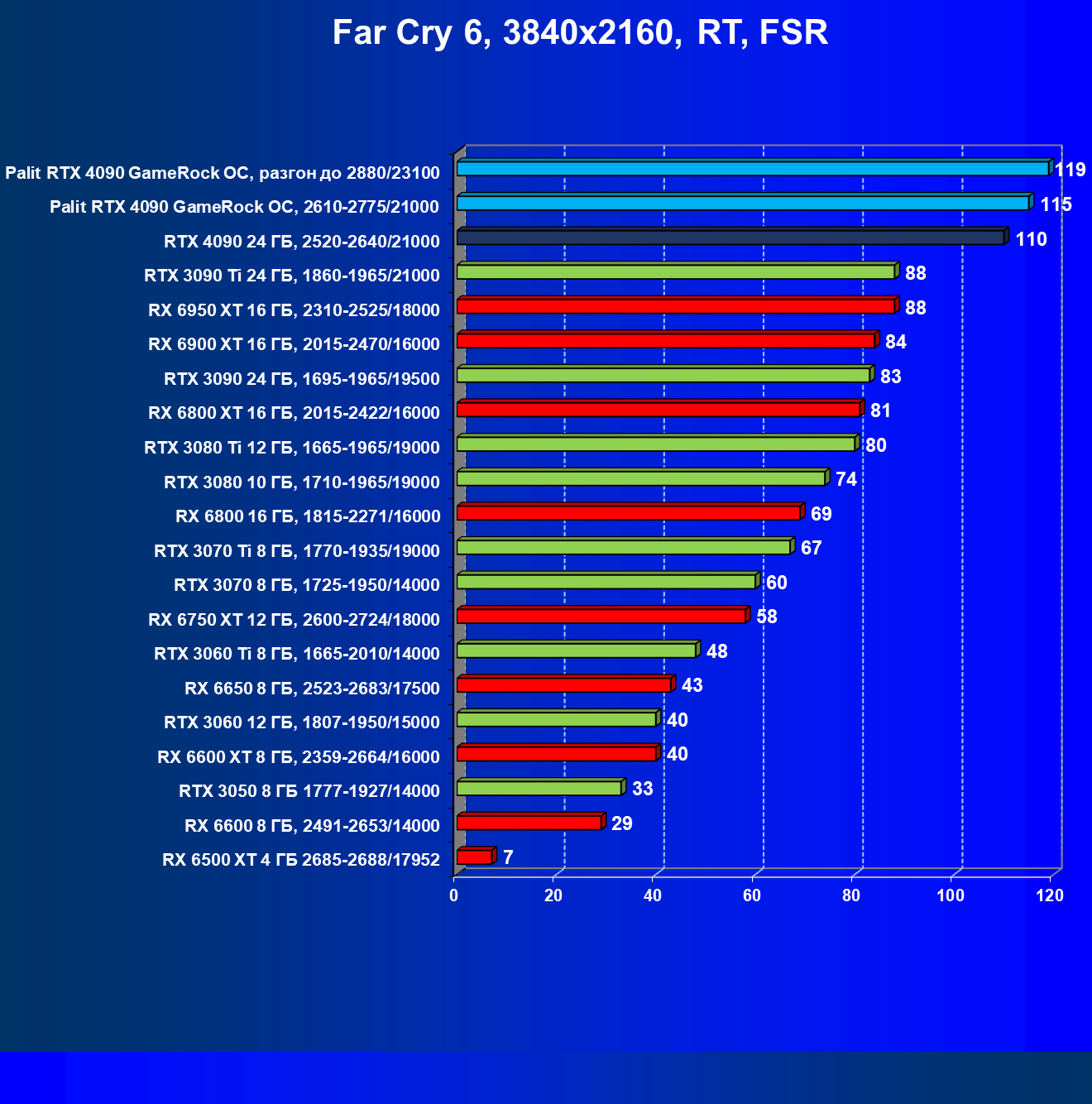 Полагаем, что долгих комментариев не требуется — и так понятно, что RTX 4090 лидер, во всех трех разрешениях его значок наверху. Что касается карты Palit, то она еще чуть быстрее референс-аналога.