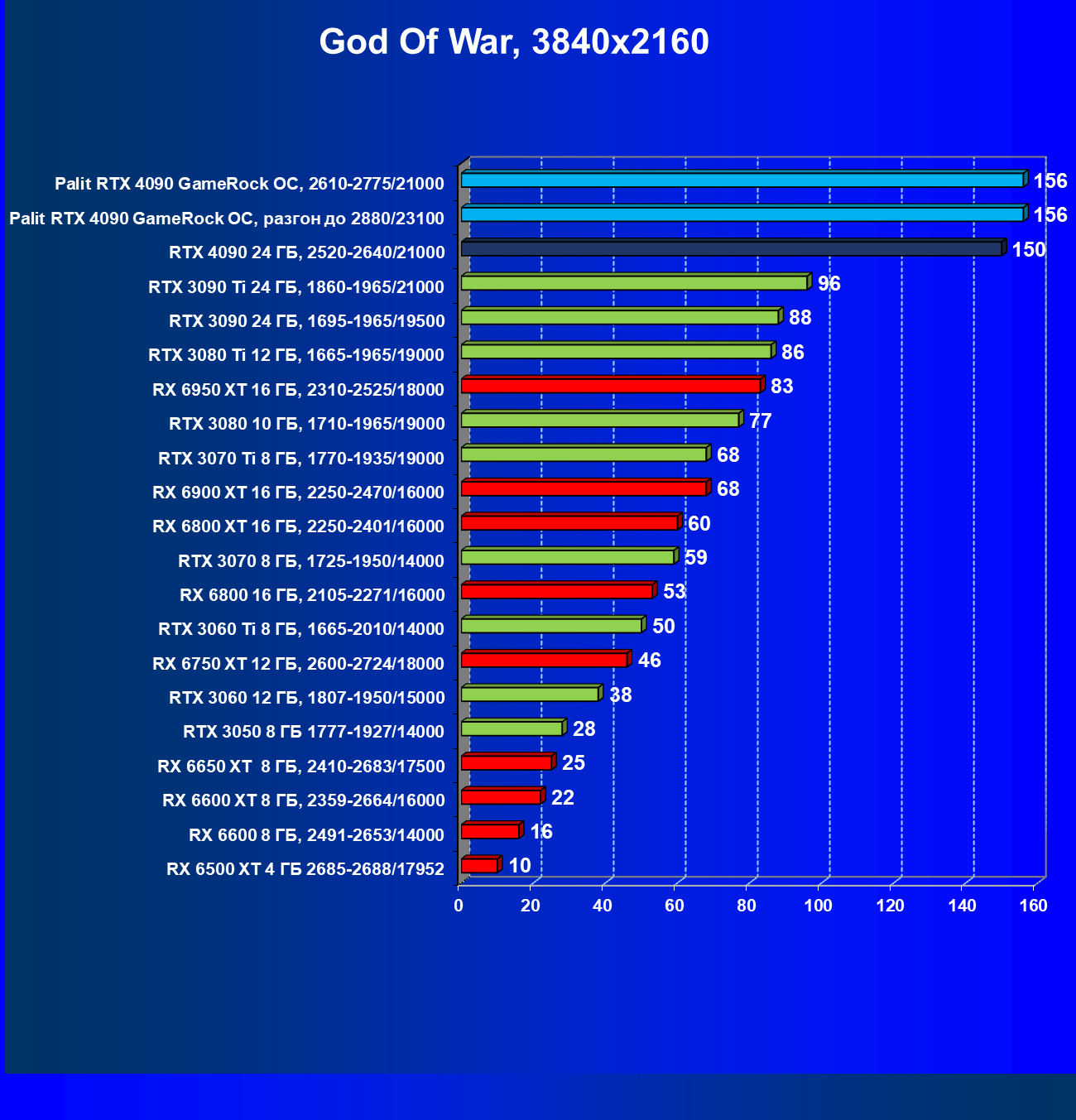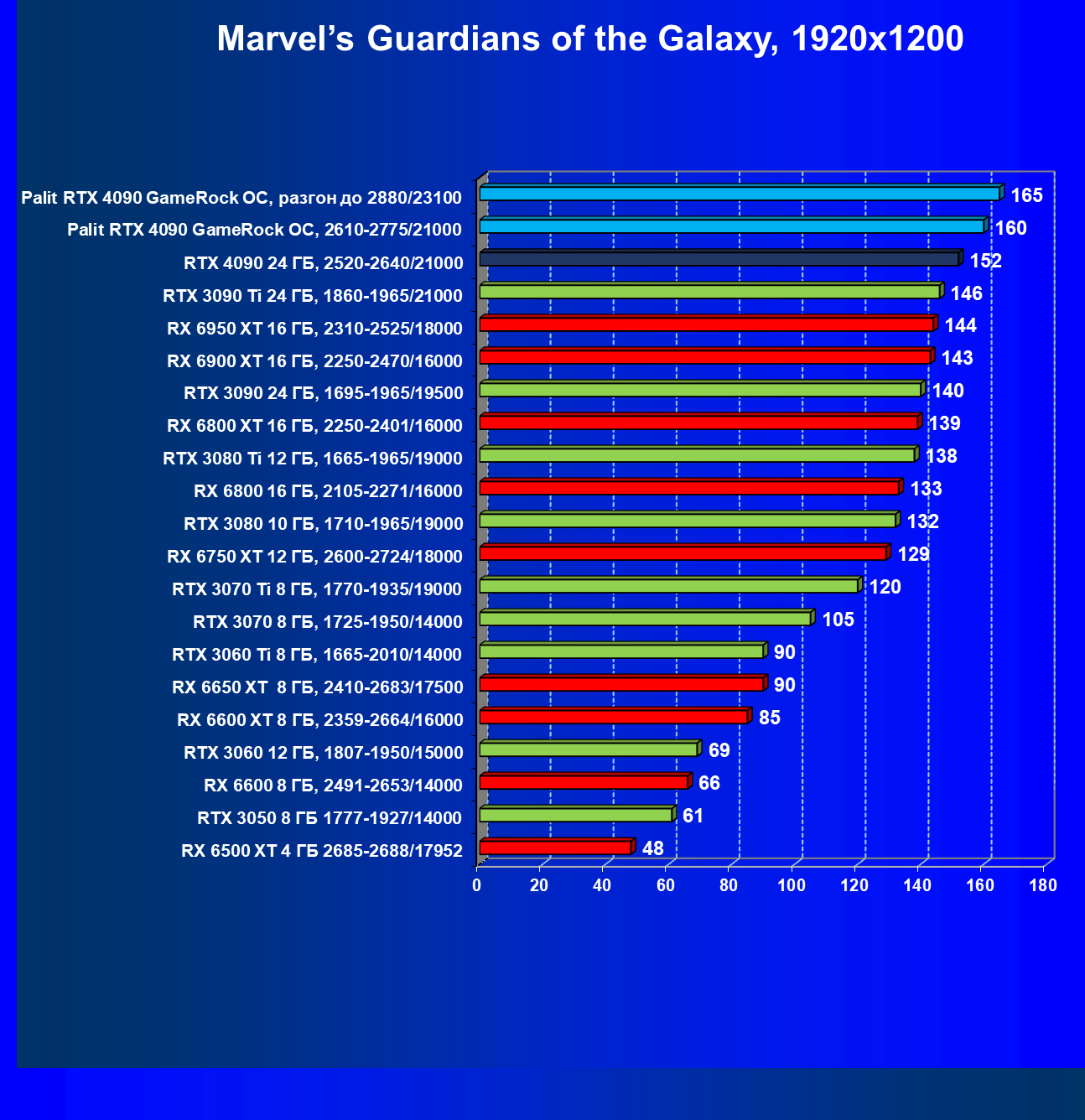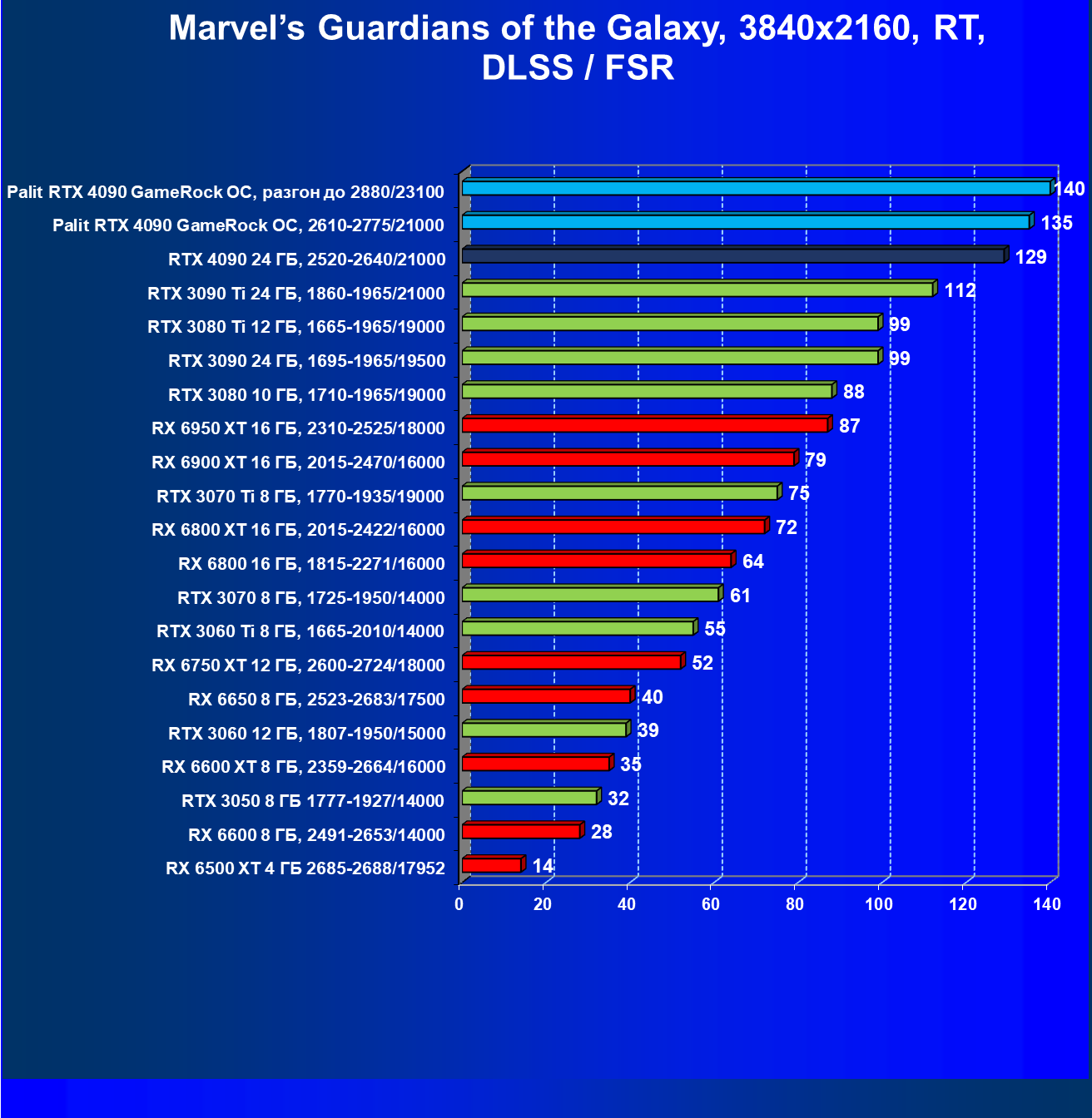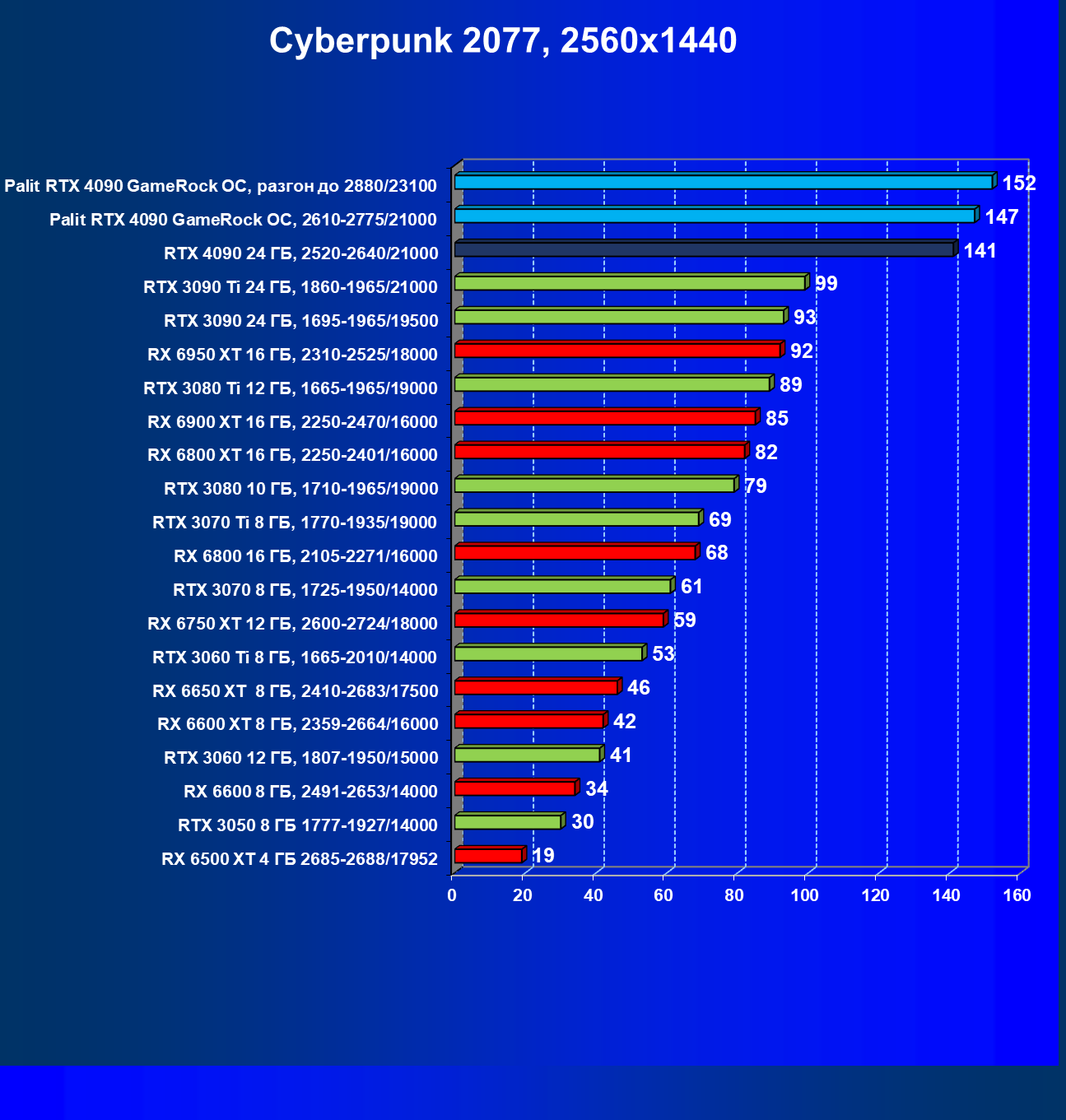 Полагаем, что долгих комментариев не требуется — и так понятно, что RTX 4090 лидер, во всех трех разрешениях его значок наверху. Что касается карты Palit, то она еще чуть быстрее референс-аналога.