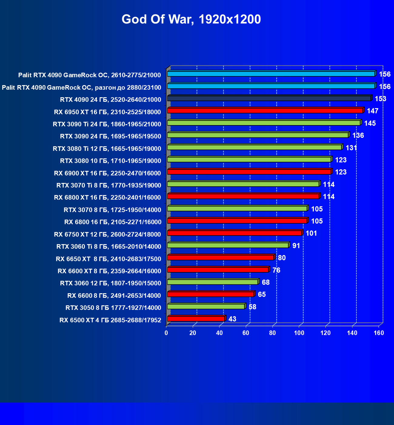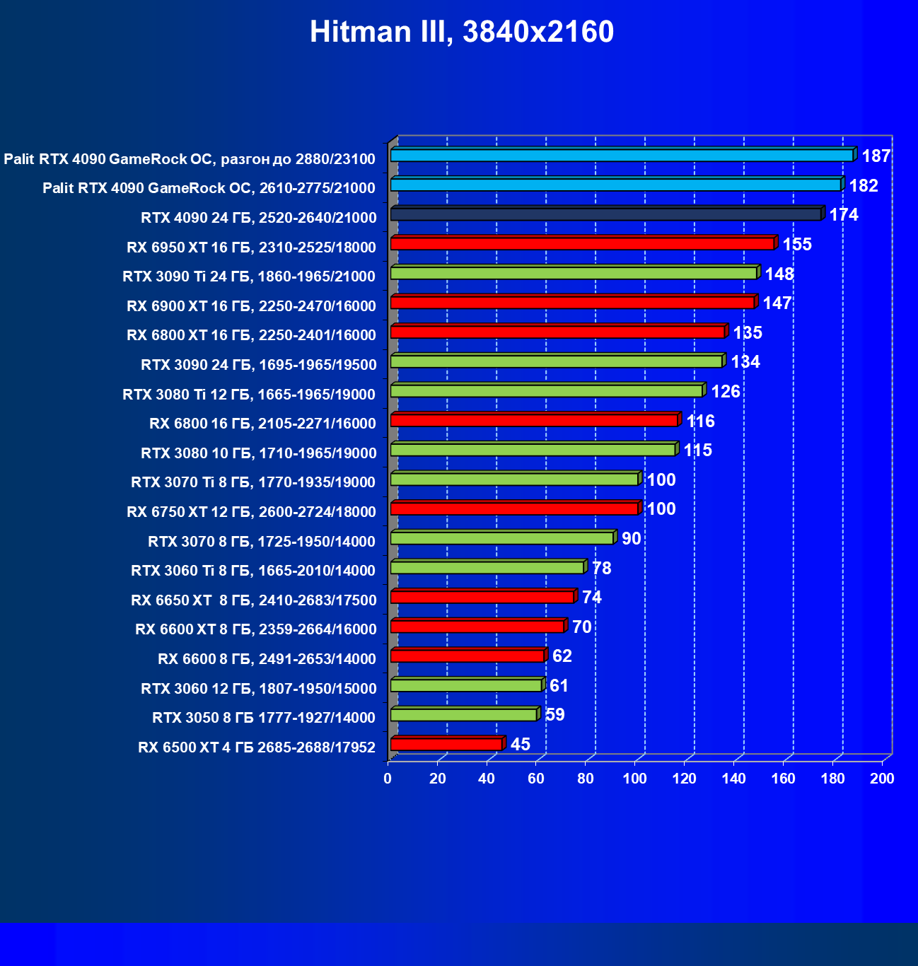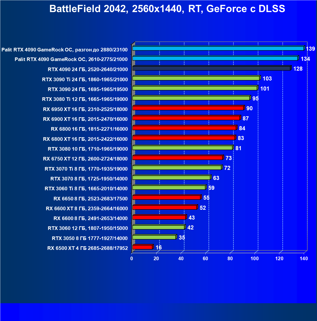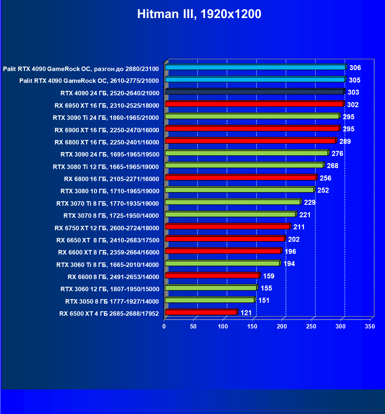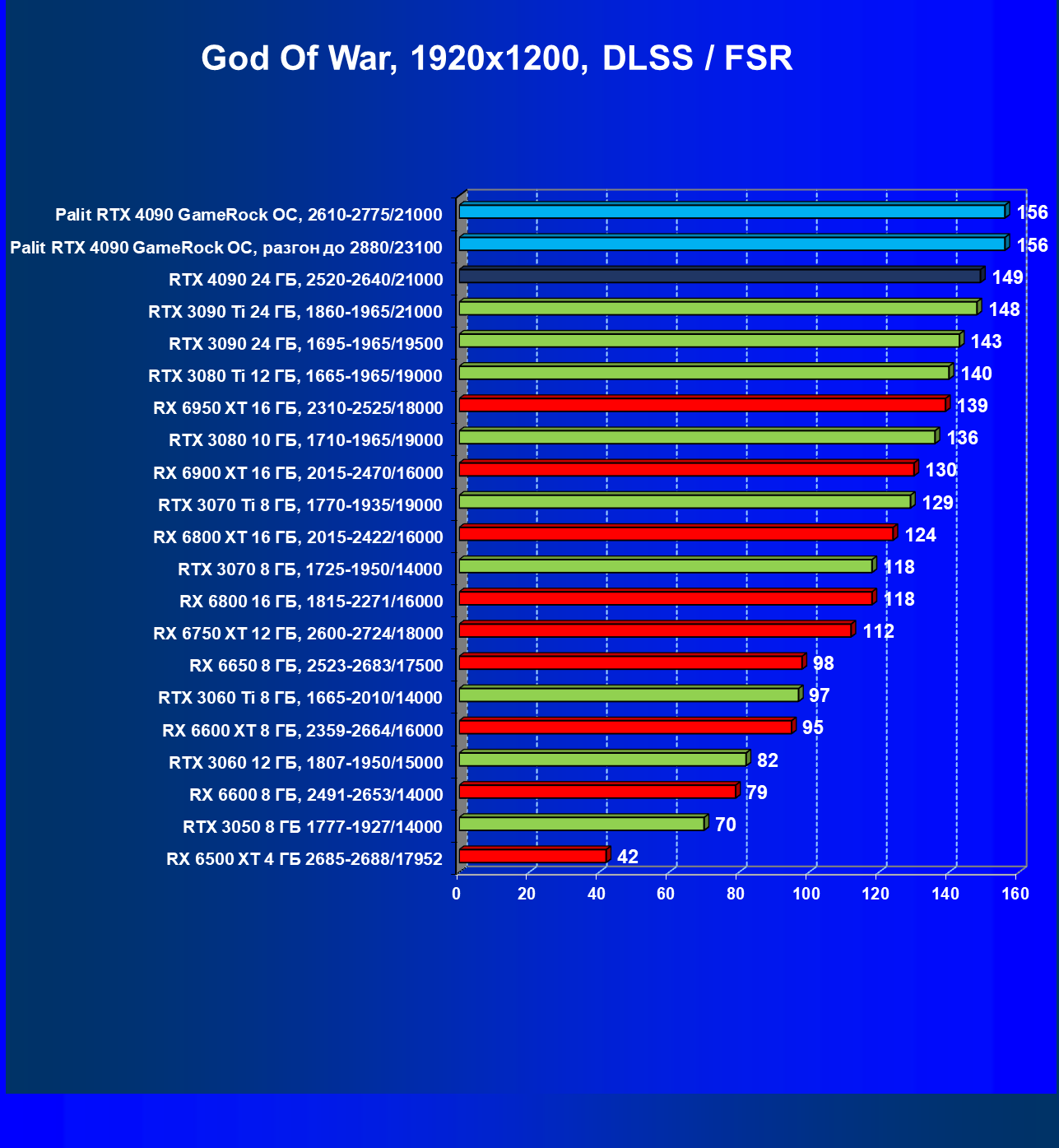 Полагаем, что долгих комментариев не требуется — и так понятно, что RTX 4090 лидер, во всех трех разрешениях его значок наверху. Что касается карты Palit, то она еще чуть быстрее референс-аналога.