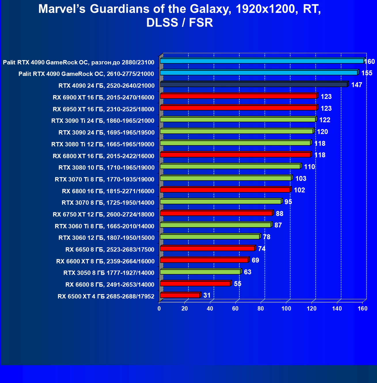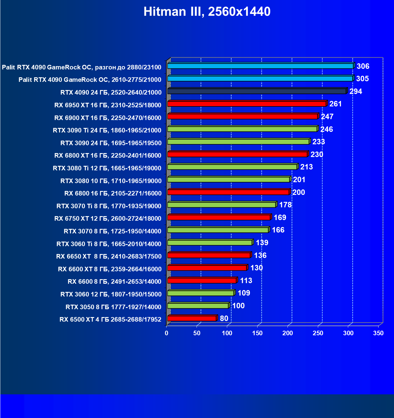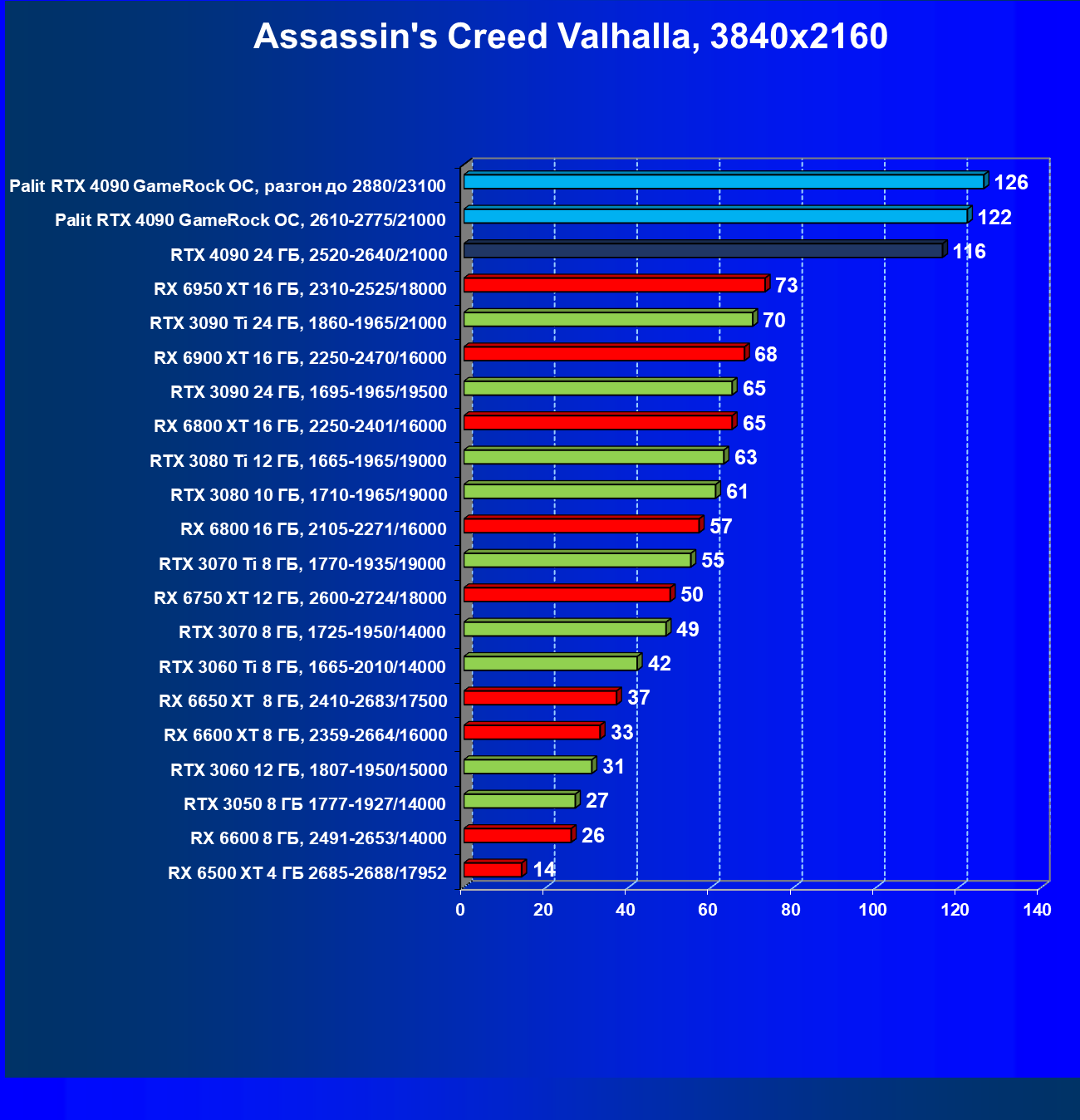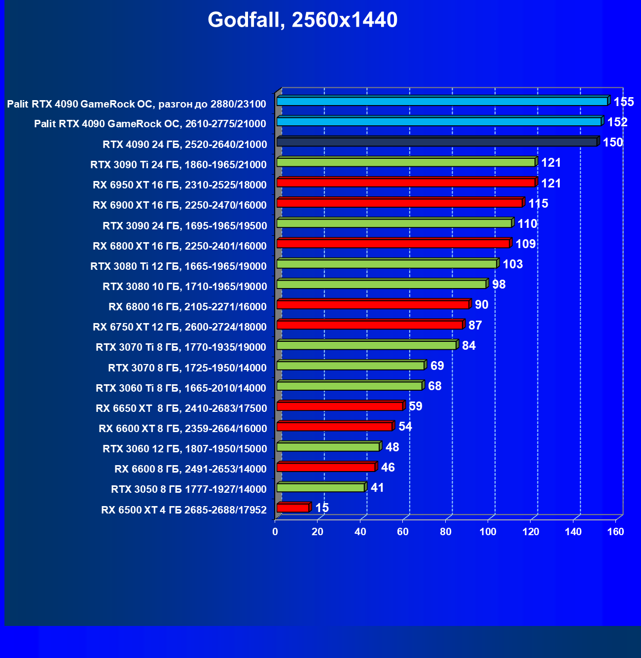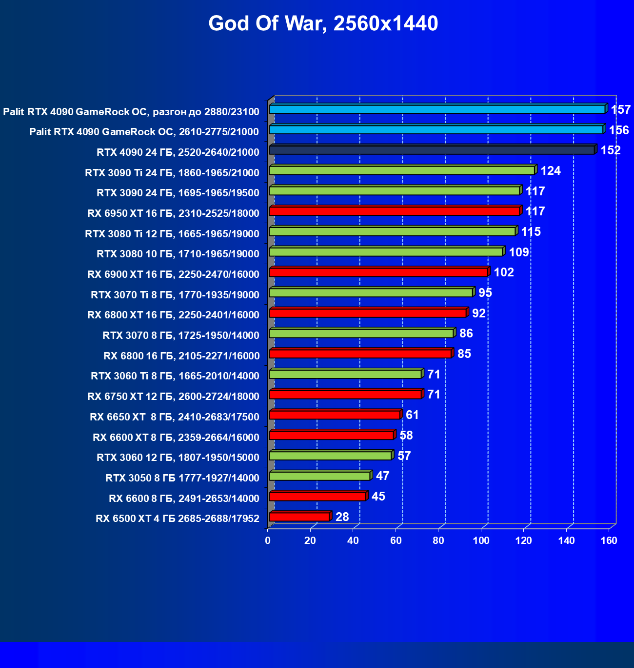 Полагаем, что долгих комментариев не требуется — и так понятно, что RTX 4090 лидер, во всех трех разрешениях его значок наверху. Что касается карты Palit, то она еще чуть быстрее референс-аналога.