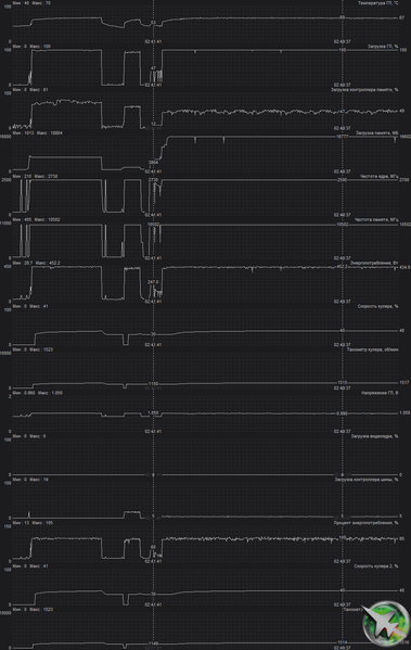 После 2-часового прогона под нагрузкой максимальная температура ядра не превысила 68 градусов, а температура микросхем памяти — 76 градусов, что является великолепным результатом для видеокарт флагманского уровня! Энергопотребление карты доходило до 475 Вт. Напомним, что безопасный предел нагрева памяти GDDR6X — 105 °C.