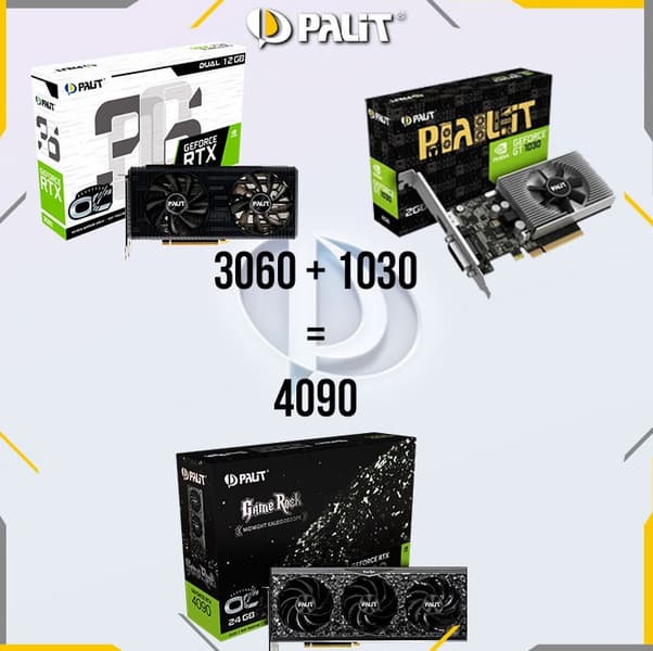 Есть простой рецепт апгрейда для владельцев RTX 3060: вместо того, чтобы тратиться на покупку RTX 4090, им надо лишь приобрести GT 1030 :). Кстати, это равенство вполне справедливо и в жизни… но только в плане количества перекрытых слотов в системном блоке.