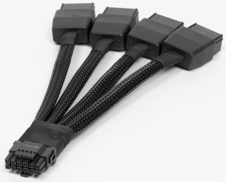 Система охлаждения тихая в обоих режимах BIOS. Карта может потреблять до 475 Вт (теоретически до 500 Вт в BIOS P), она требует четыре 8-контактных разъема питания (которые подключаются к прилагаемому переходнику на 16-контактный разъем на самой плате), так что наличие мощного БП обязательно! Особо надо отметить, что такой переходник питания ни в коем случае нельзя изгибать непосредственно после 16-контактного разъема
