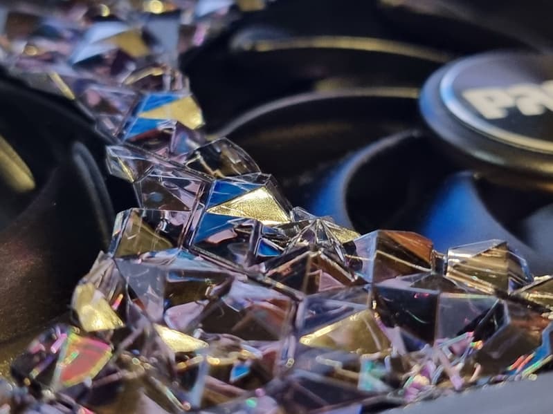 Еще при выпуске поколения ускорителей GeForce RTX 30 в Nvidia решили сделать более компактную PCB и придумали новую систему охлаждения, продувающую радиатор насквозь (при этом частично оставляющую нагретый воздух в объеме корпуса). Здесь мы видим кулер, выполненный именно по этой концепции: его основой является огромный многосекционный пластинчатый никелированный радиатор с восемью тепловыми композитными трубками, распределяющими тепло по ребрам радиатора.