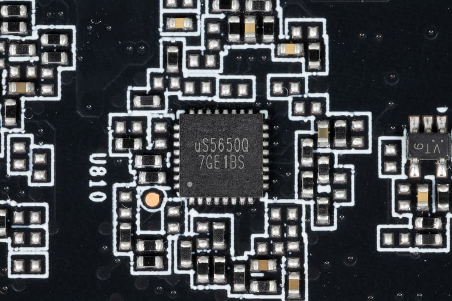 Также на тыльной стороне карты имеется контроллер uS5650Q (uPI Semi), который отвечает за мониторинг карты (отслеживание напряжений и температуры). Опять же, ранее таких контроллеров было два (по одному на каждой стороне карты).