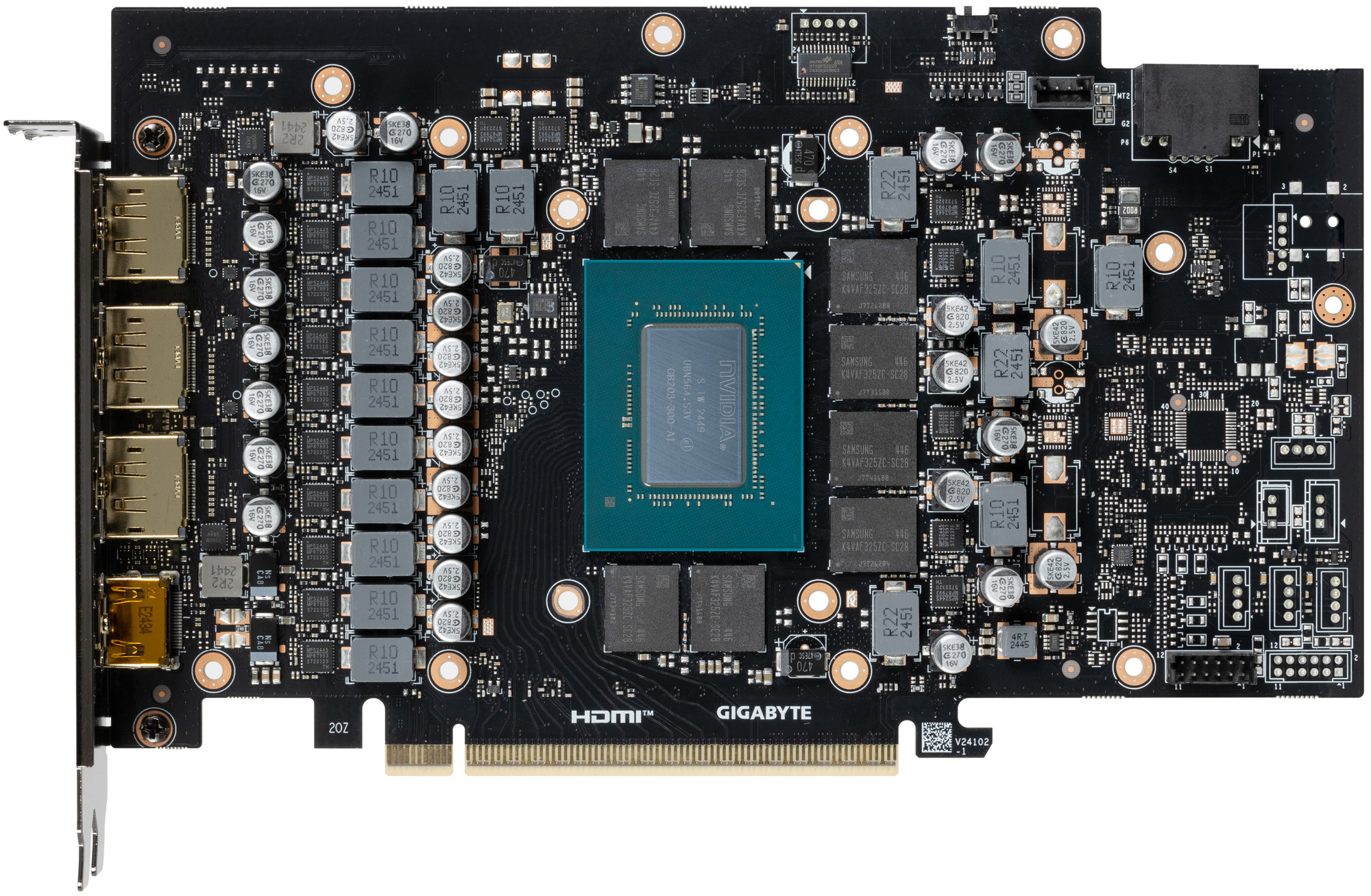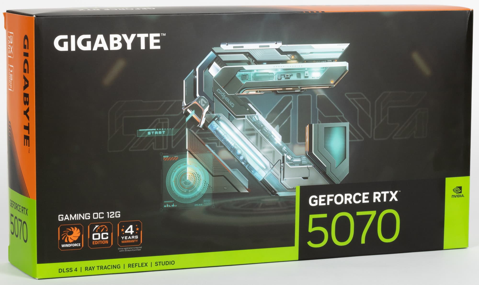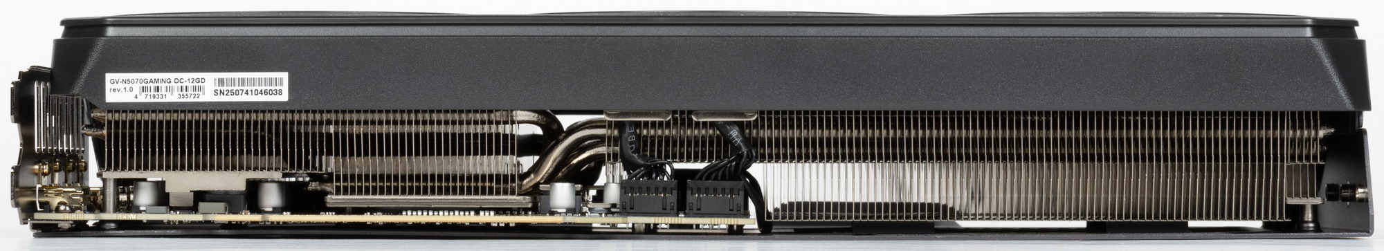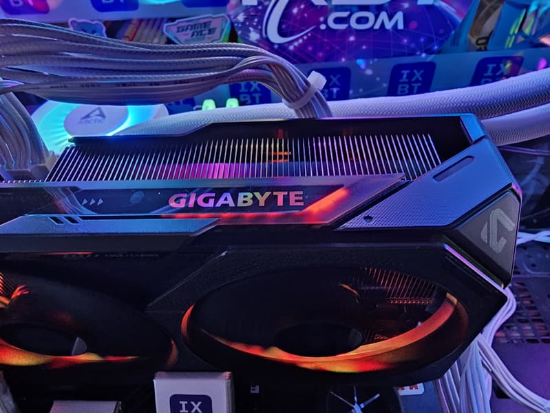 Конкретная протестированная карта Gigabyte GeForce RTX 5070 Gaming OC 12G (12 ГБ) имеет стандартные размеры 33×13 см, занимая 3 слота в системном блоке. Использованный кулер тихий, при этом карта может потреблять до 250 Вт или чуть больше и имеет один 16-контактный разъем питания 12VHPWR (PCIe 5.0). У карты 4 видеовыхода: 1 HDMI 2.1b и 3 DisplayPort 2.1b — последний обеспечивает пропускную способность до 80 Гбит/с в режиме передачи UHBR 20 и позволяет подключить 8K-дисплей с частотой обновления 60 Гц по одному кабелю. Карта имеет фирменную подсветку вентиляторов Halo, которая настраивается и отключается через ПО.