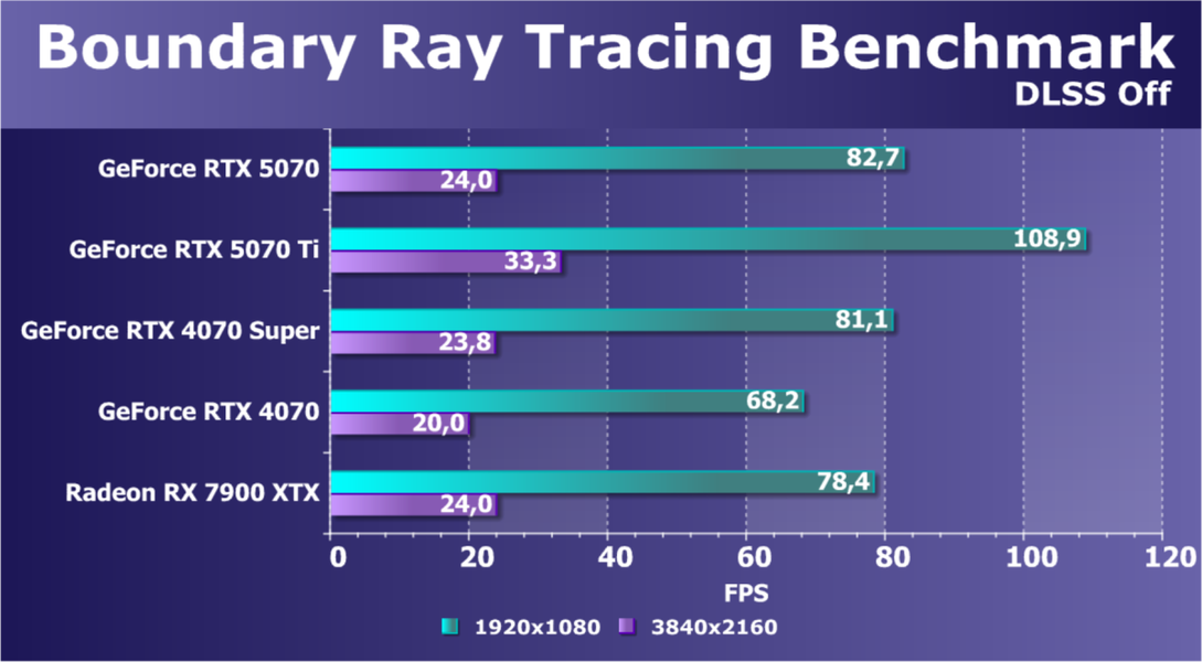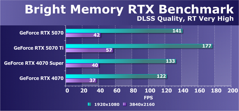 Отметим еще раз, что GeForce RTX 5070 будет обеспечивать хороший комфорт во всех играх на высоких настройках качества при отключенных трассировке лучей и технологиях масштабирования в разрешениях до 2160p (4K) включительно. Однако при использовании RT в разрешении 4K мы все-таки советуем включать DLSS.