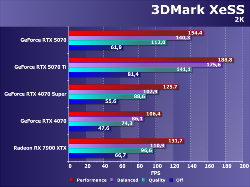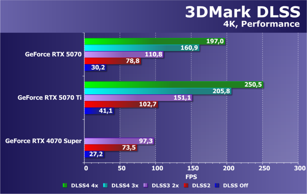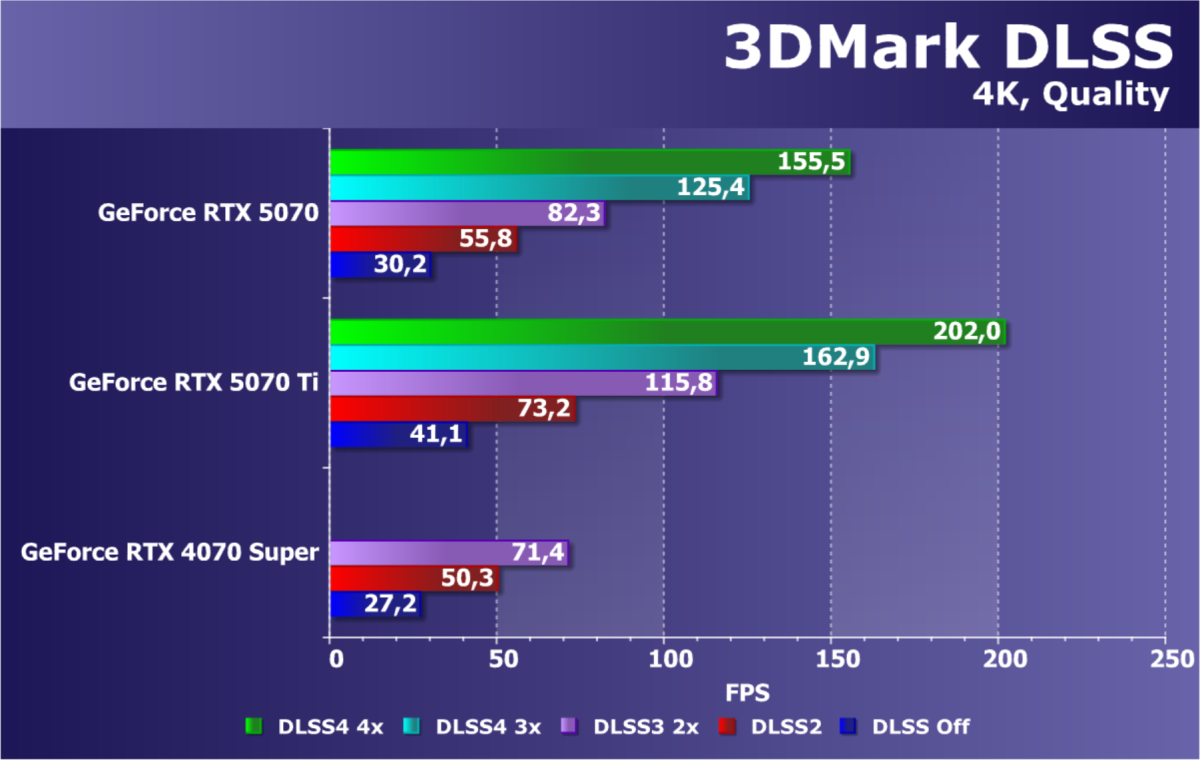 В классических играх без RT, а также в играх с RT и/или с технологиями динамического масштабирования DLSS(1/2/3)/FSR/XeSS новый ускоритель GeForce RTX 5070 находится между GeForce RTX 4070 Super и GeForce RTX 4070 Ti (почти на уровне второго). В играх же, где имеется возможность задействовать DLSS 4 (Multi Frame Generation, MFG), его производительность резко возрастает, и новинка может догнать даже GeForce RTX 4080.