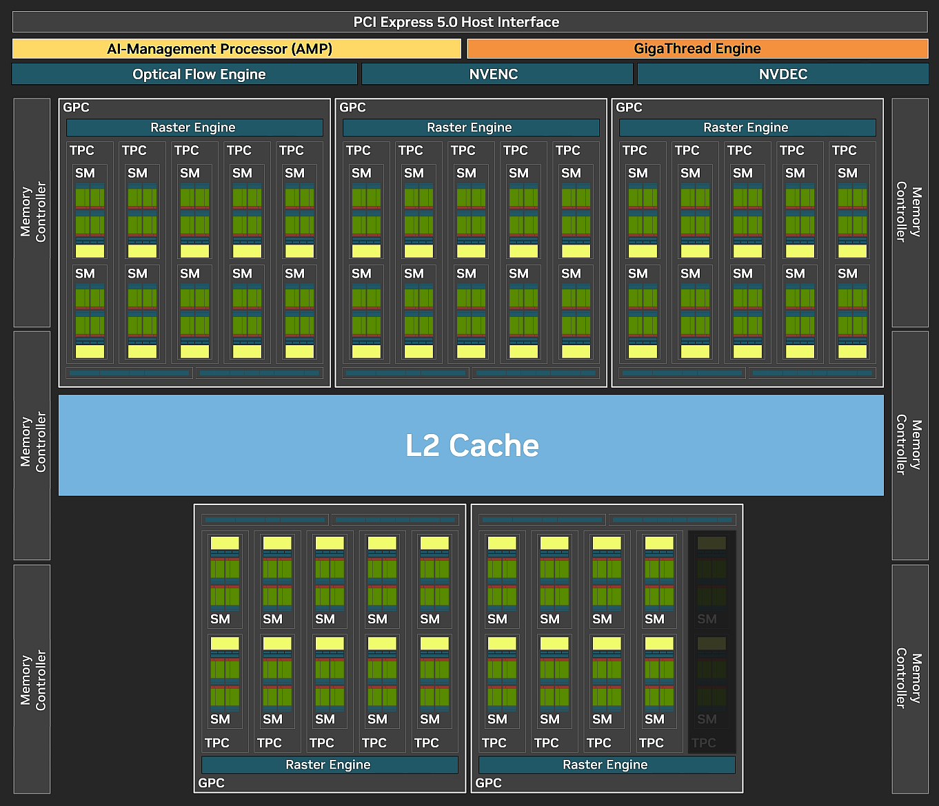 Высокоуровневое строение графических процессоров компании Nvidia не изменяется с Ampere. Как и все графические процессоры компании, GB205 состоит из укрупненных кластеров Graphics Processing Cluster (GPC), которые включают несколько кластеров текстурной обработки Texture Processing Cluster (TPC), содержащих потоковые процессоры Streaming Multiprocessor (SM), блоки растеризации ROP и контроллеры памяти. Кластер GPC самостоятельно производит основные вычисления внутри кластера, и включает свой движок растеризации Raster Engine, несколько кластеров TPC, состоящих из вдвое большего количества мультипроцессоров SM. Рассмотрим блок-схему графического процессора в его урезанной конфигурации (деактивированные блоки затемнены), и так как Nvidia не предоставила публике диаграммы младших чипов, нам пришлось перерисовывать имеющуюся схему GB202, убрав всё лишнее и переформатировав ее.