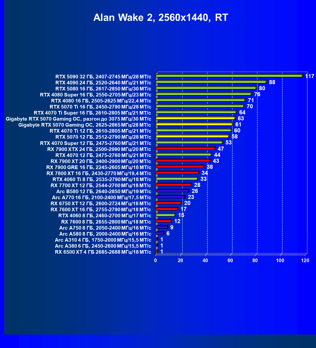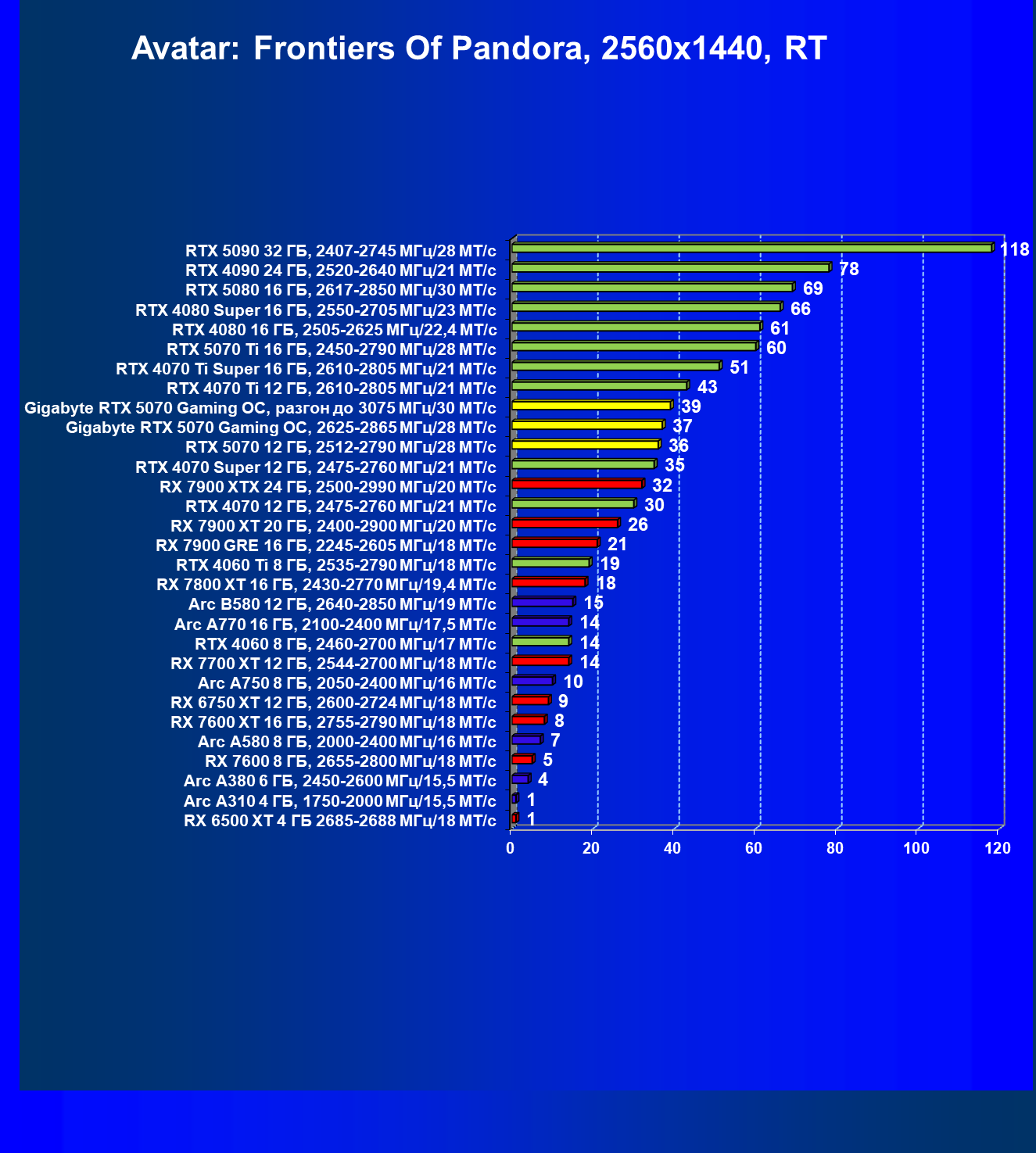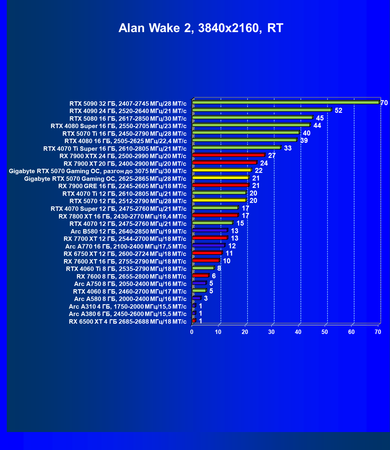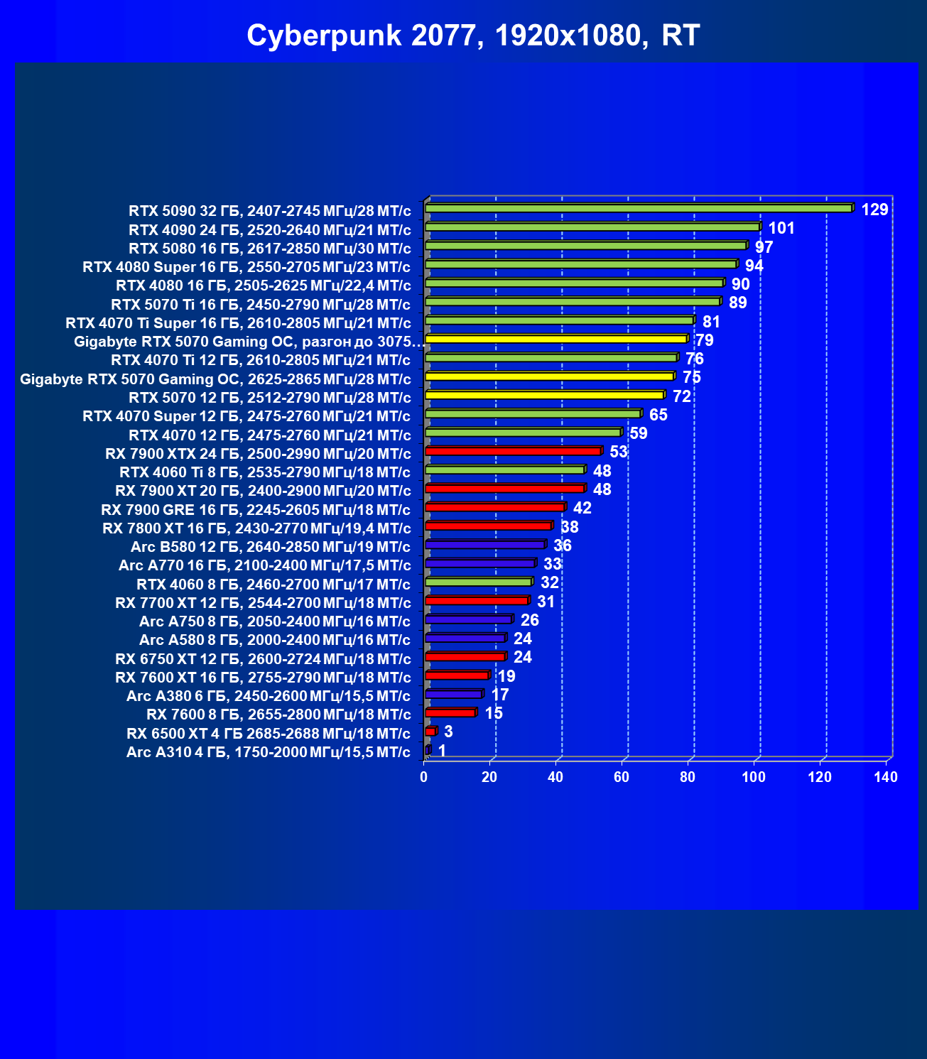 | 08 | Gigabyte RTX 5070 Gaming OC, 2625—2865 МГц/28 ГТ/с | 463 | 4862 | 105 000 |