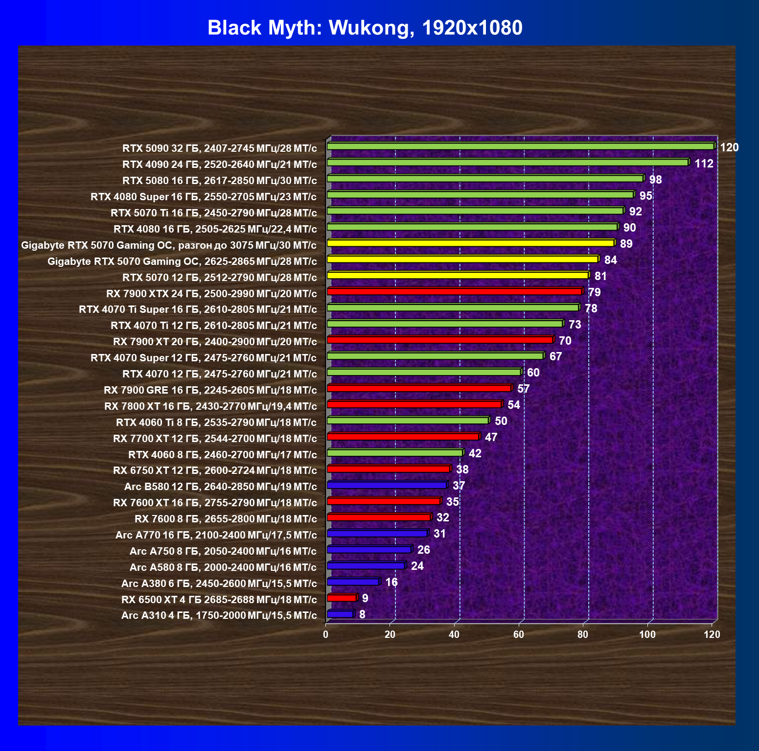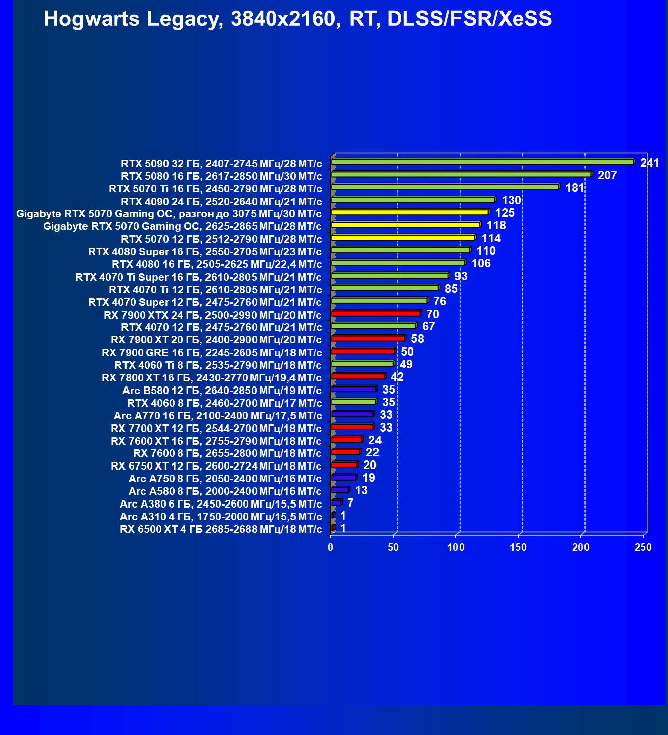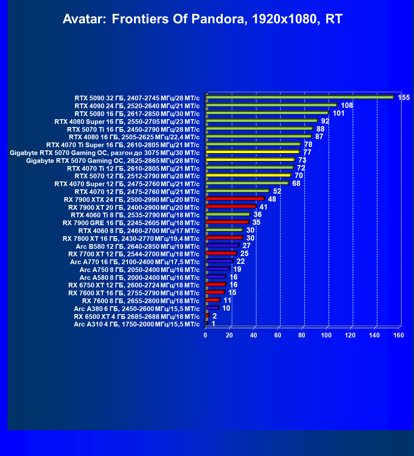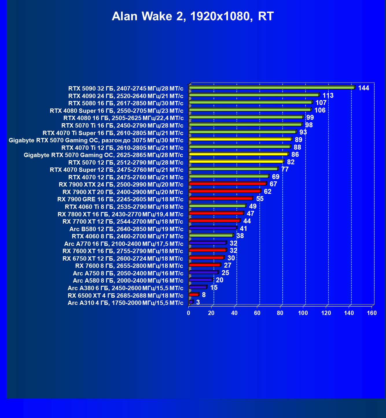 | 08 | Gigabyte RTX 5070 Gaming OC, 2625—2865 МГц/28 ГТ/с | 463 | 4862 | 105 000 |