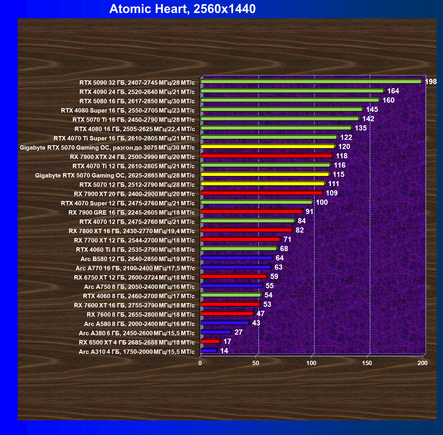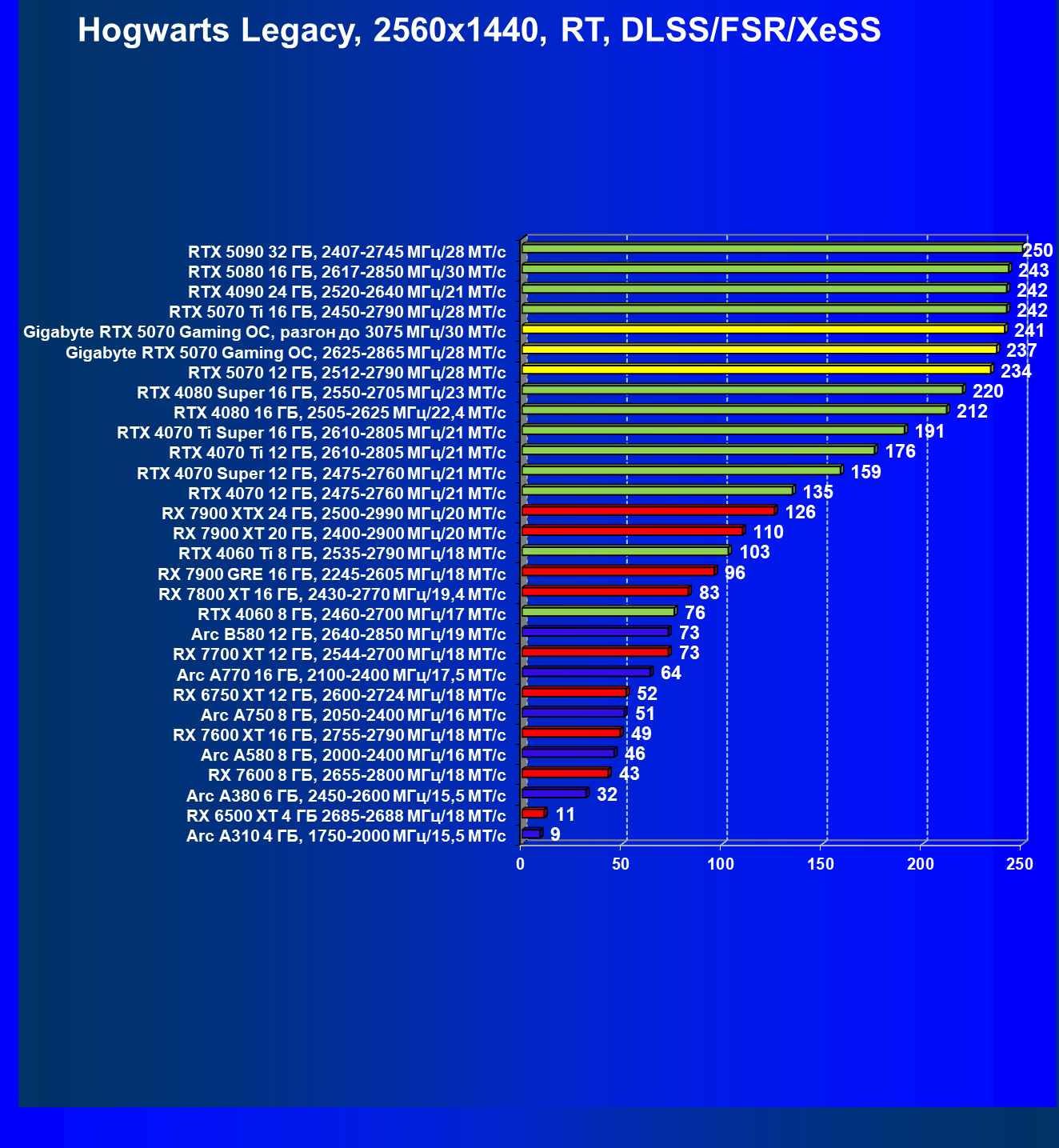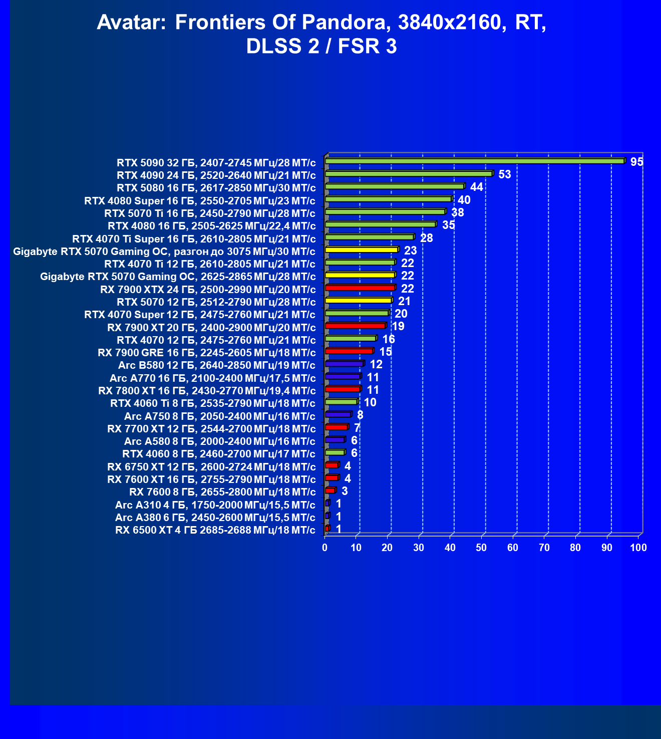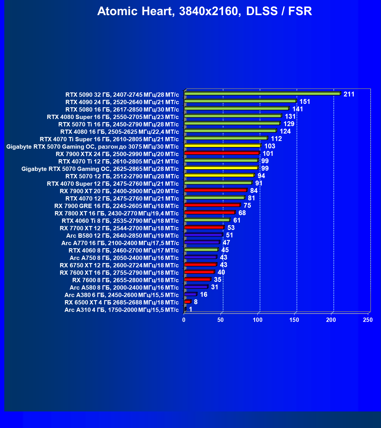 | 08 | Gigabyte RTX 5070 Gaming OC, 2625—2865 МГц/28 ГТ/с | 463 | 4862 | 105 000 |