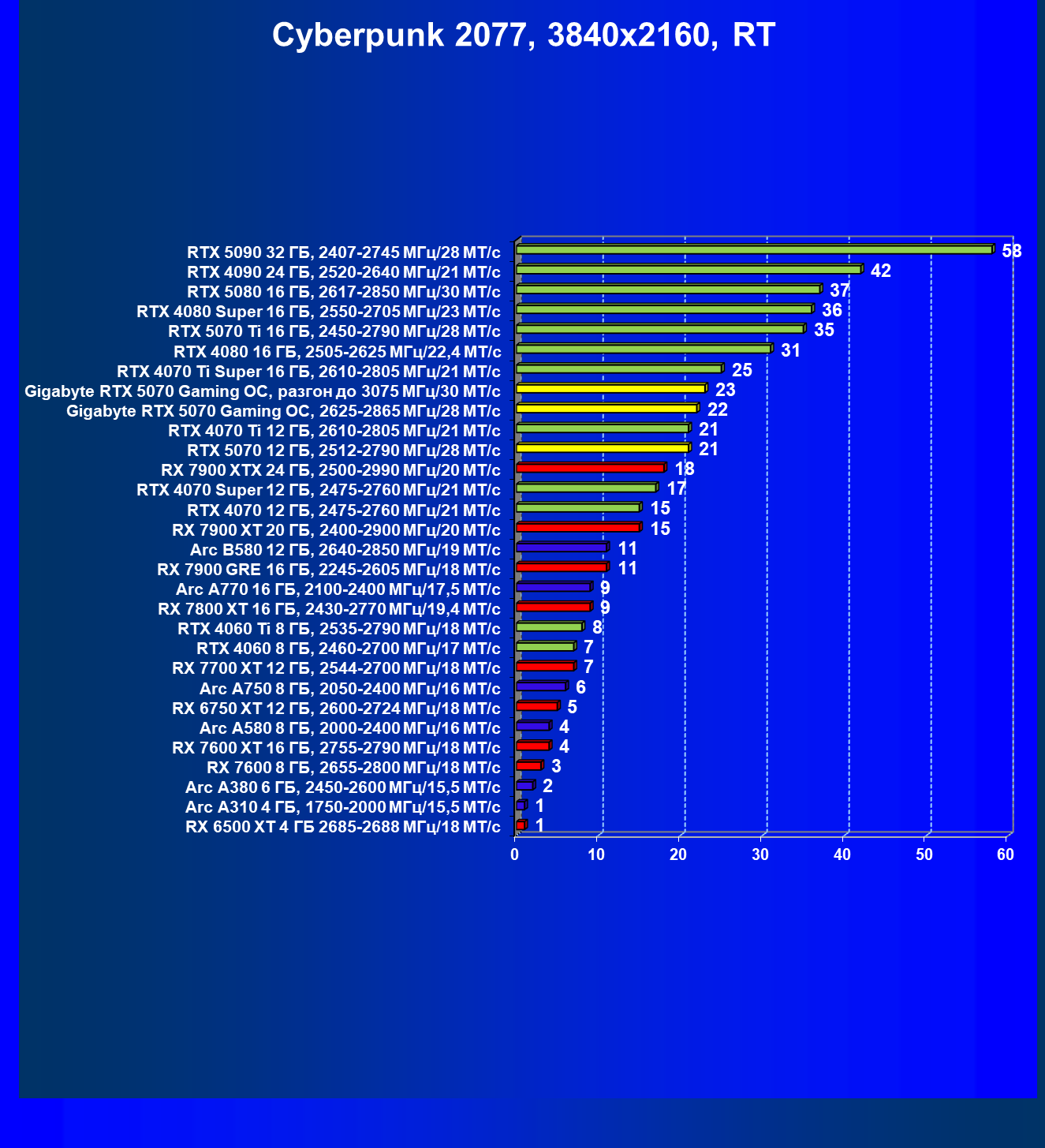 | 19 | RX 7900 XT 20 ГБ, 2400—2900 МГц/20 ГТ/с | 342 | 3041 | 89 000 |