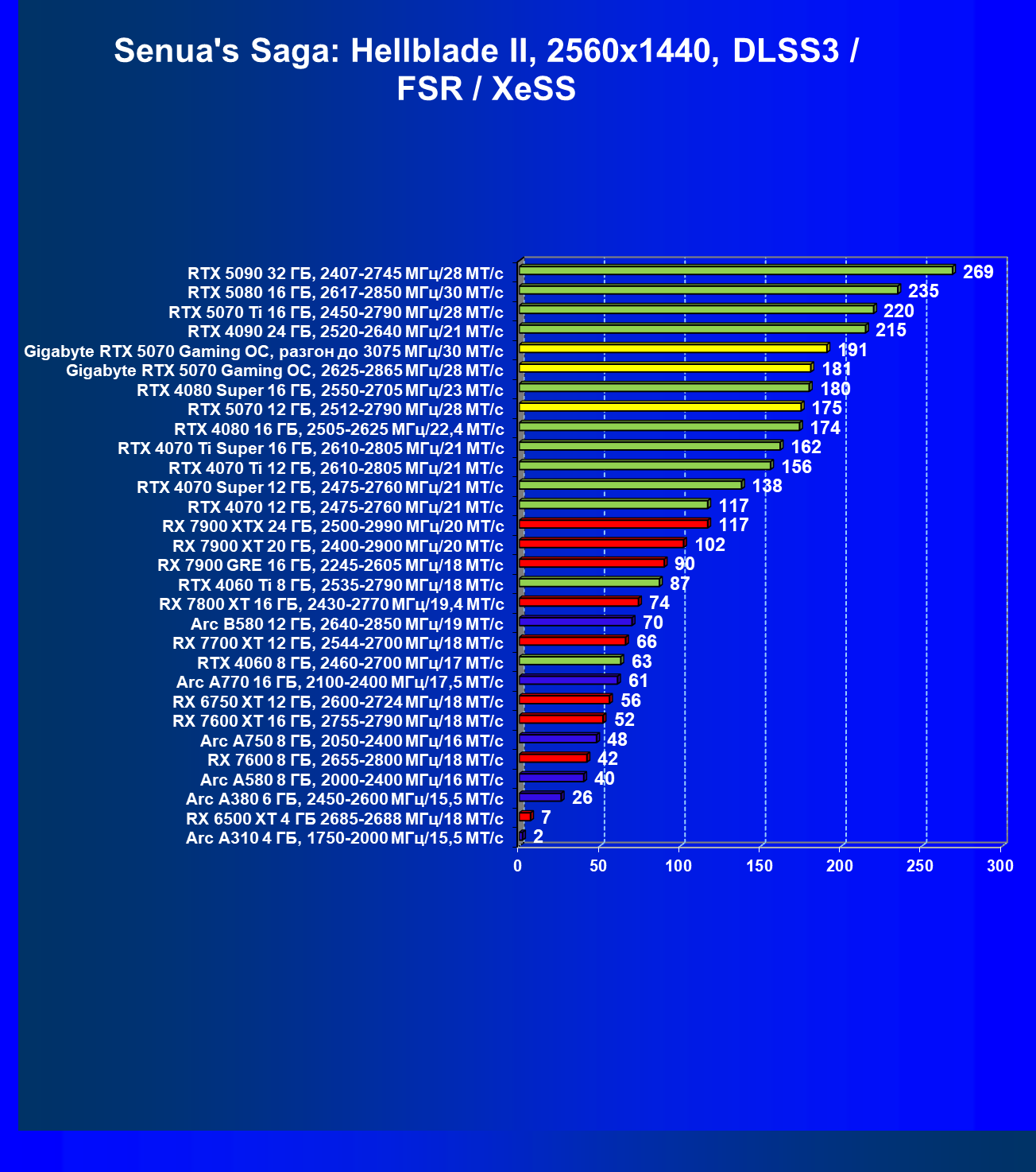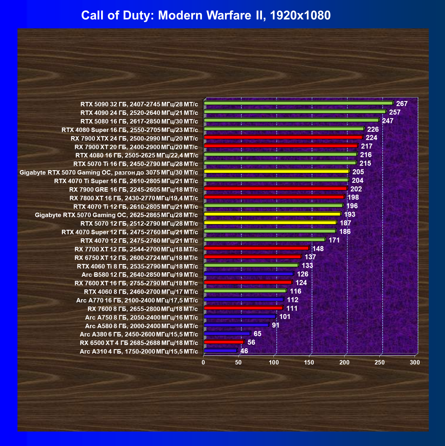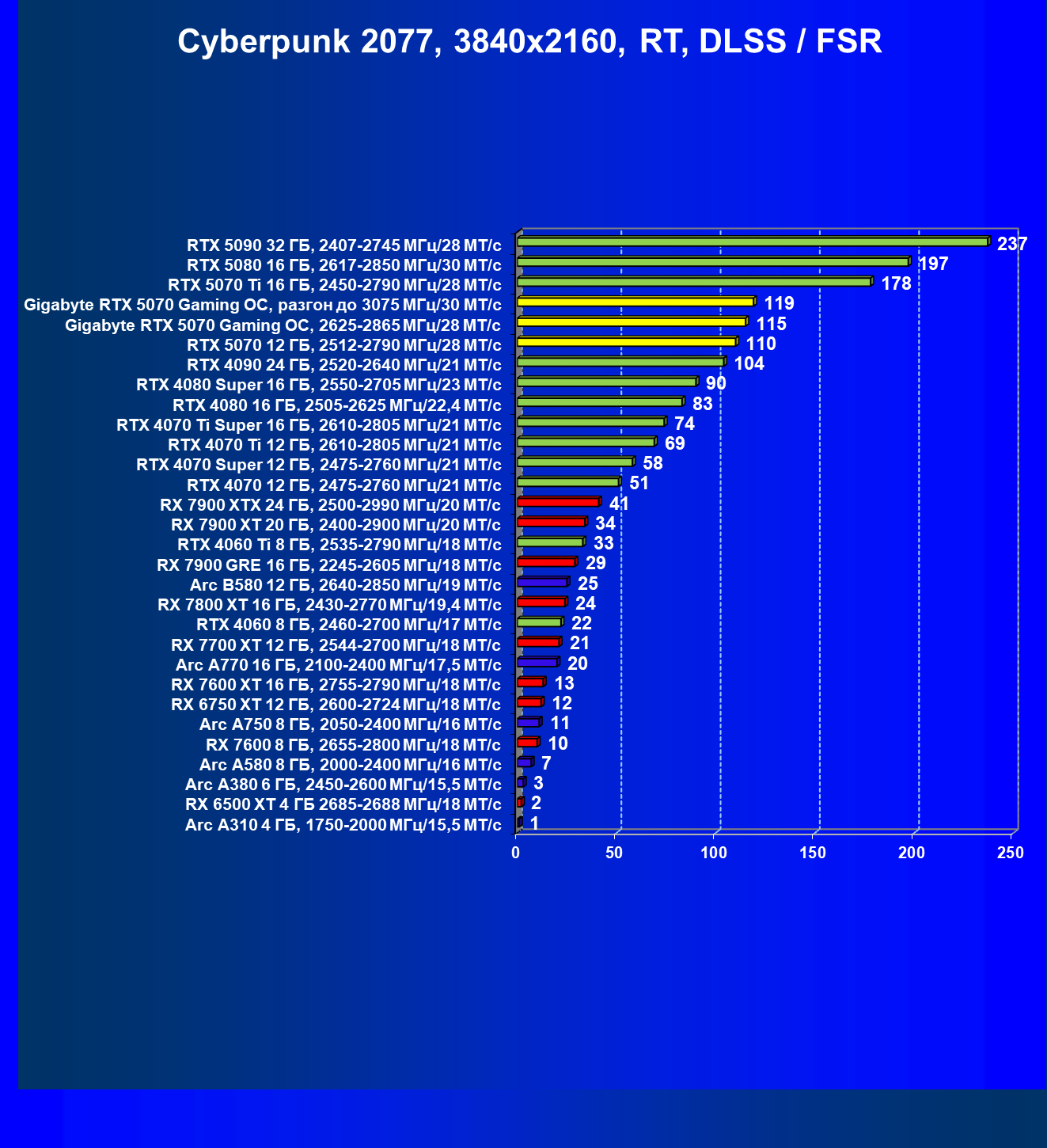 | 21 | RX 7900 GRE 16 ГБ, 2245—2605 МГц/18 ГТ/с | 317 | 2603 | 82 000 |