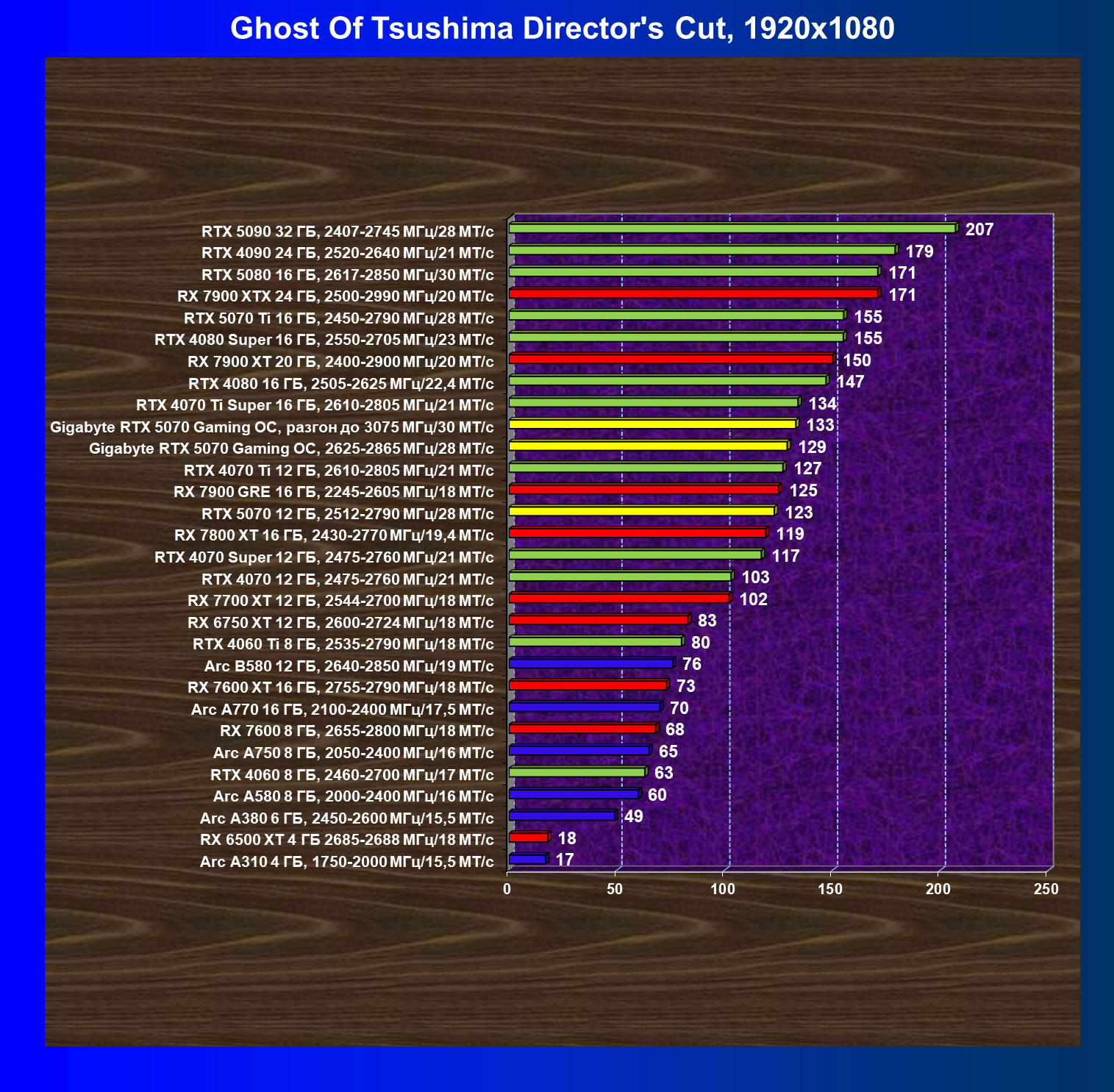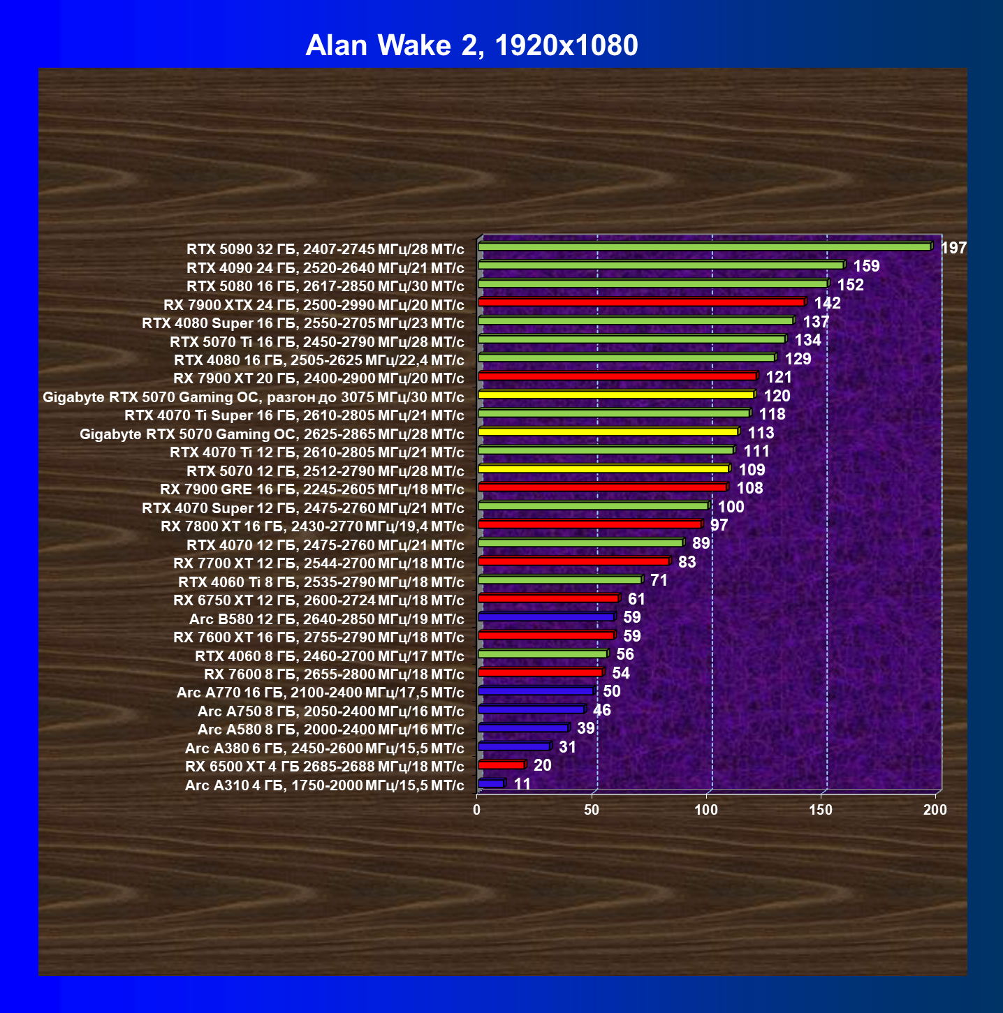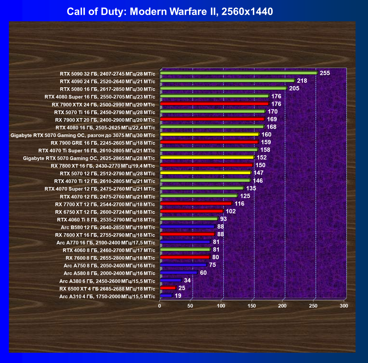 | 21 | RX 7900 GRE 16 ГБ, 2245—2605 МГц/18 ГТ/с | 317 | 2603 | 82 000 |
