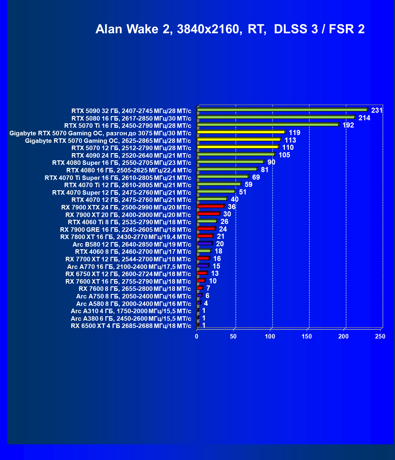 | 21 | Gigabyte RTX 5070 Gaming OC, 2625—2865 МГц/28 ГТ/с | 145 | 1520 | 105 000 |