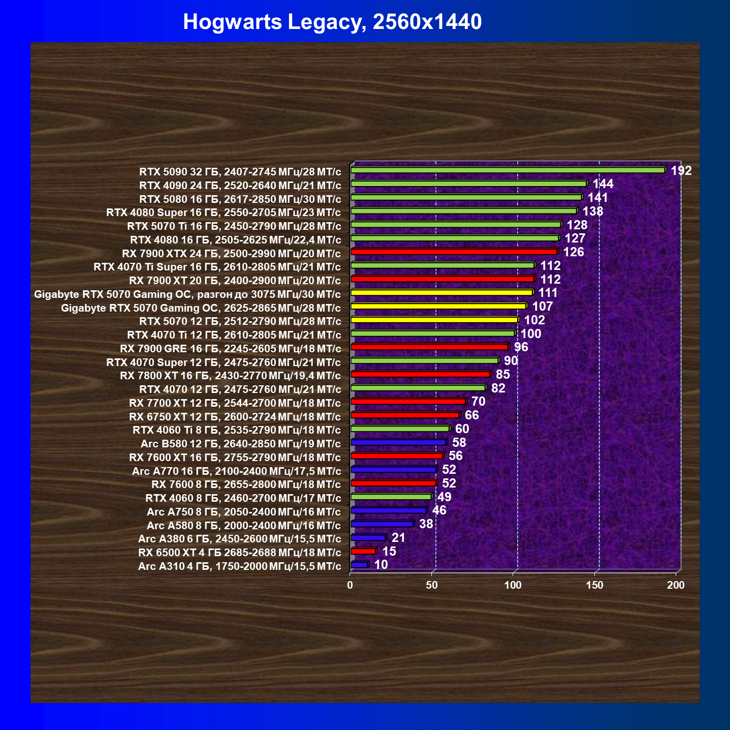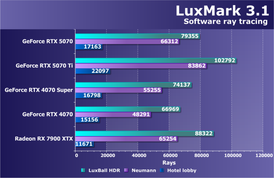 | 19 | RTX 5070 12 ГБ, 2512—2790 МГц/28 ГТ/с | 148 | 1463 | 99 000 |