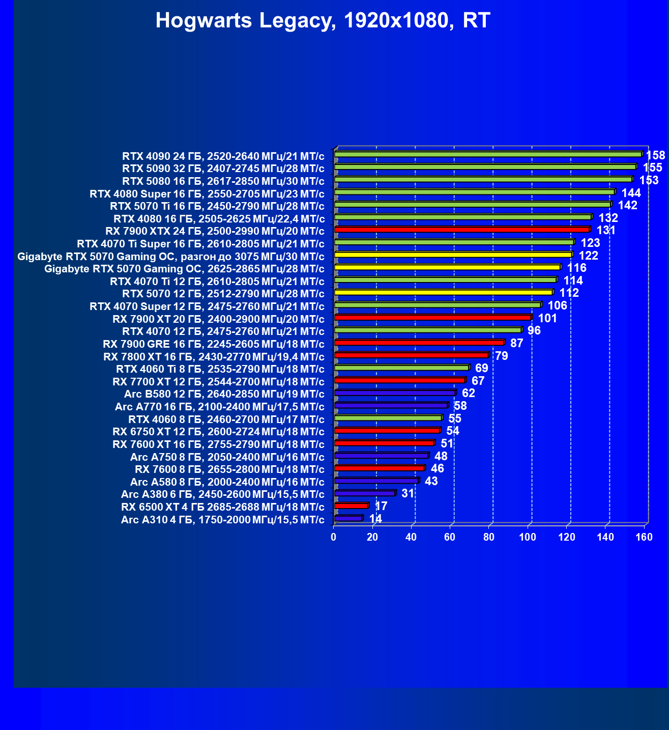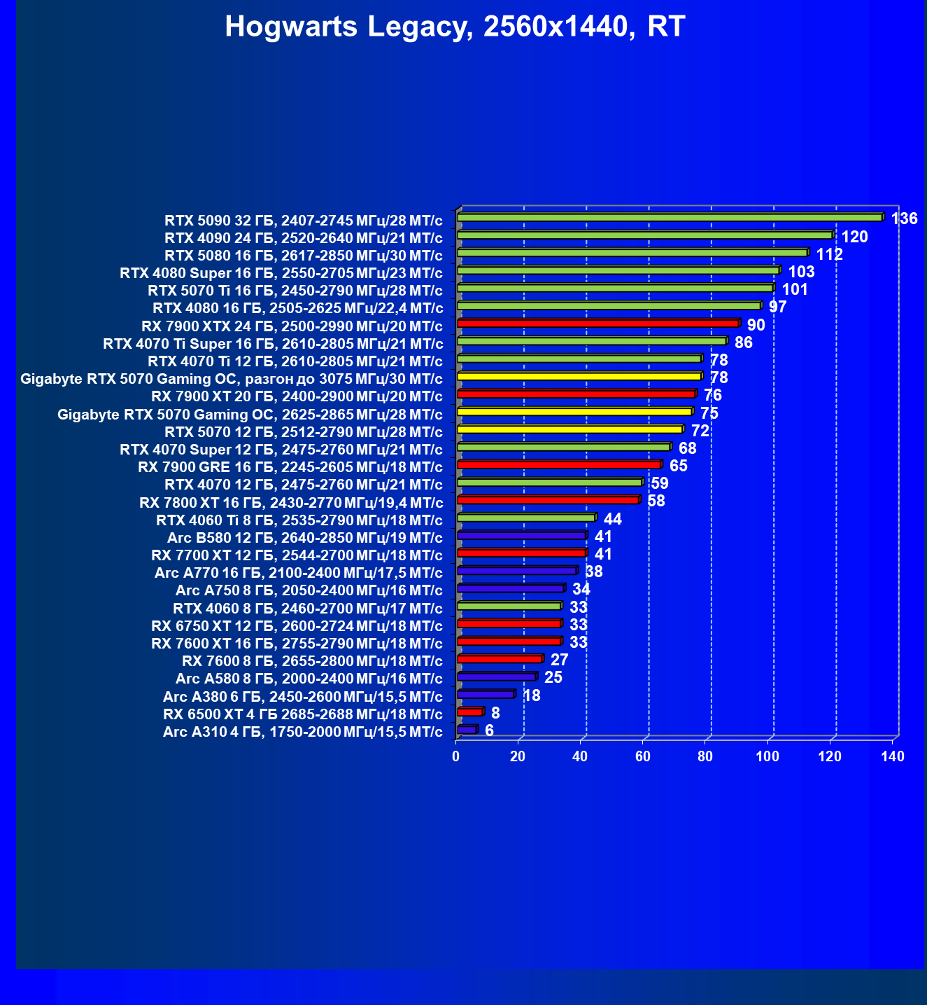 | 15 | RX 7900 GRE 16 ГБ, 2245—2605 МГц/18 ГТ/с | 161 | 1323 | 82 000 |