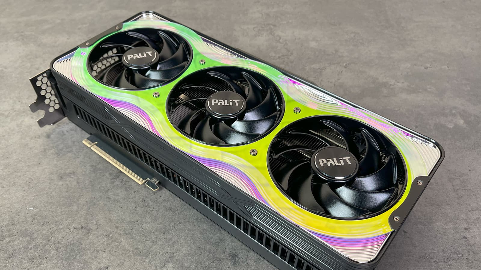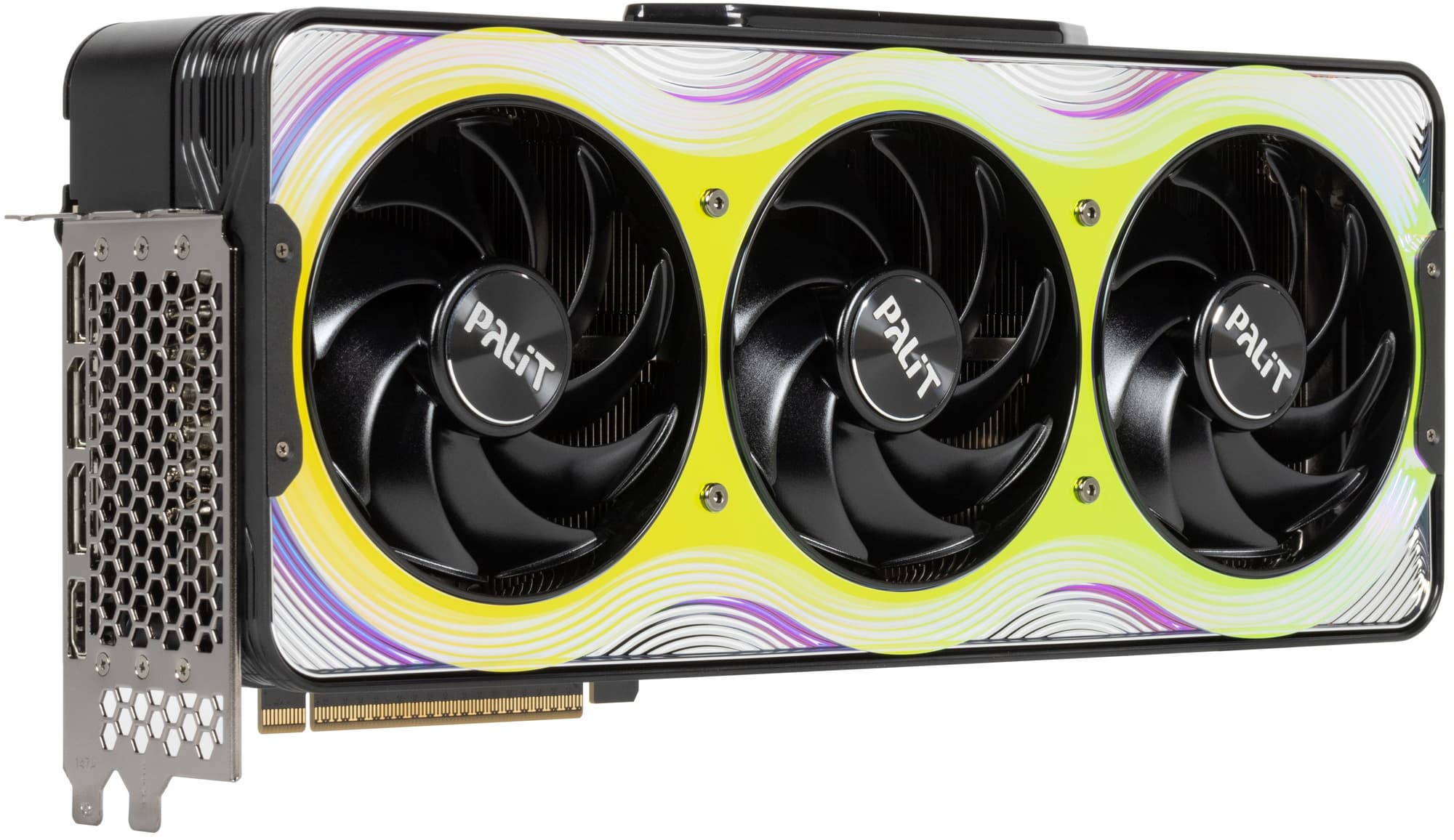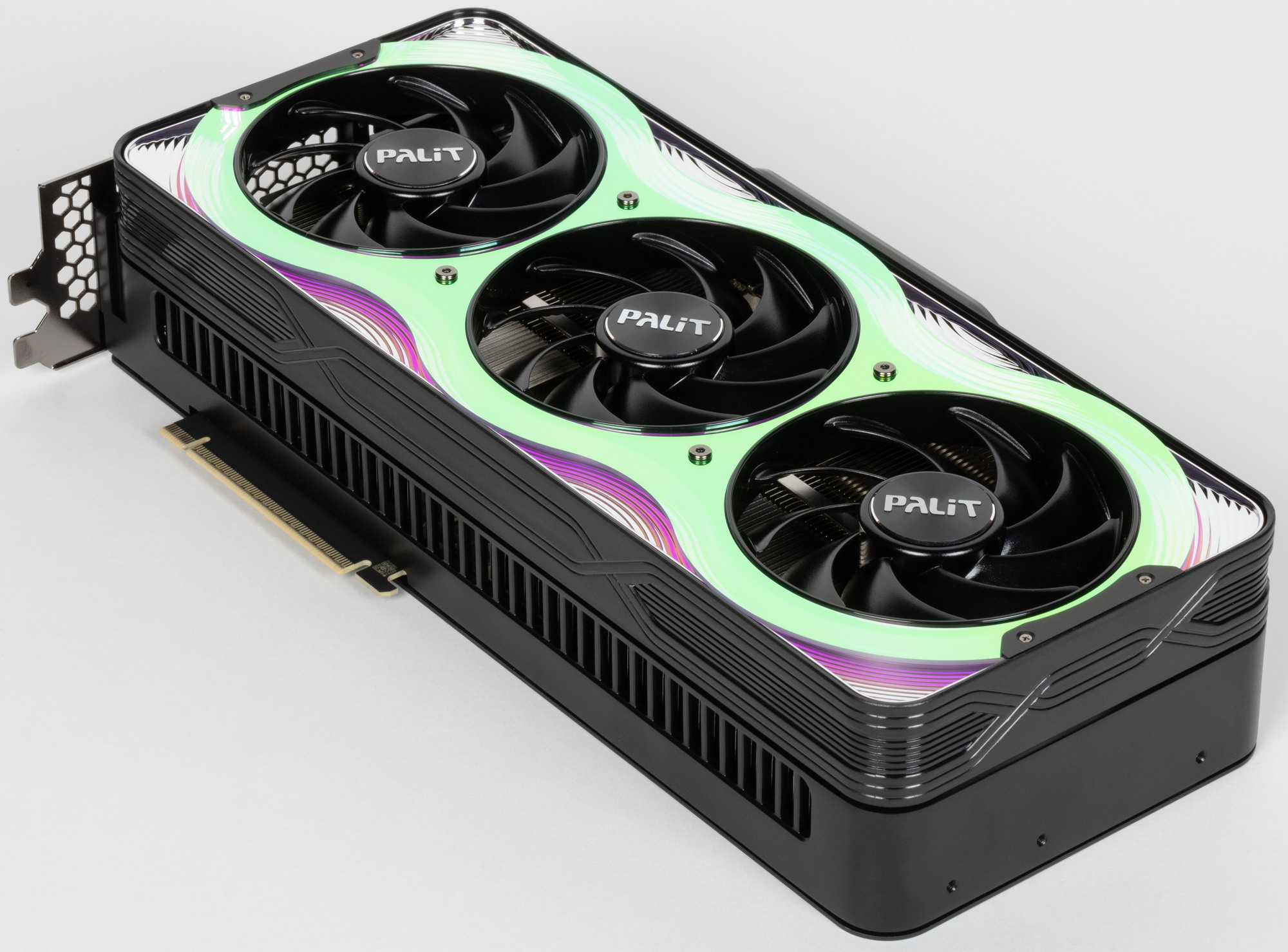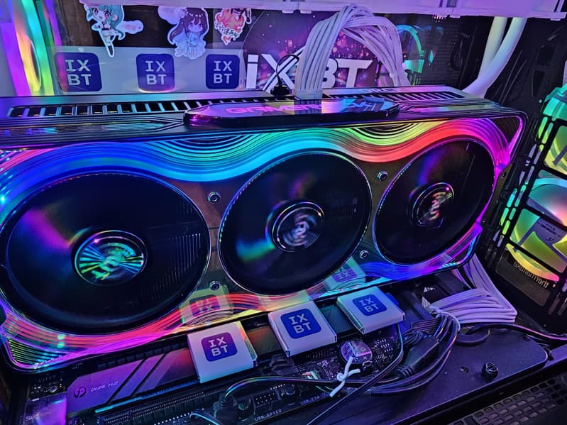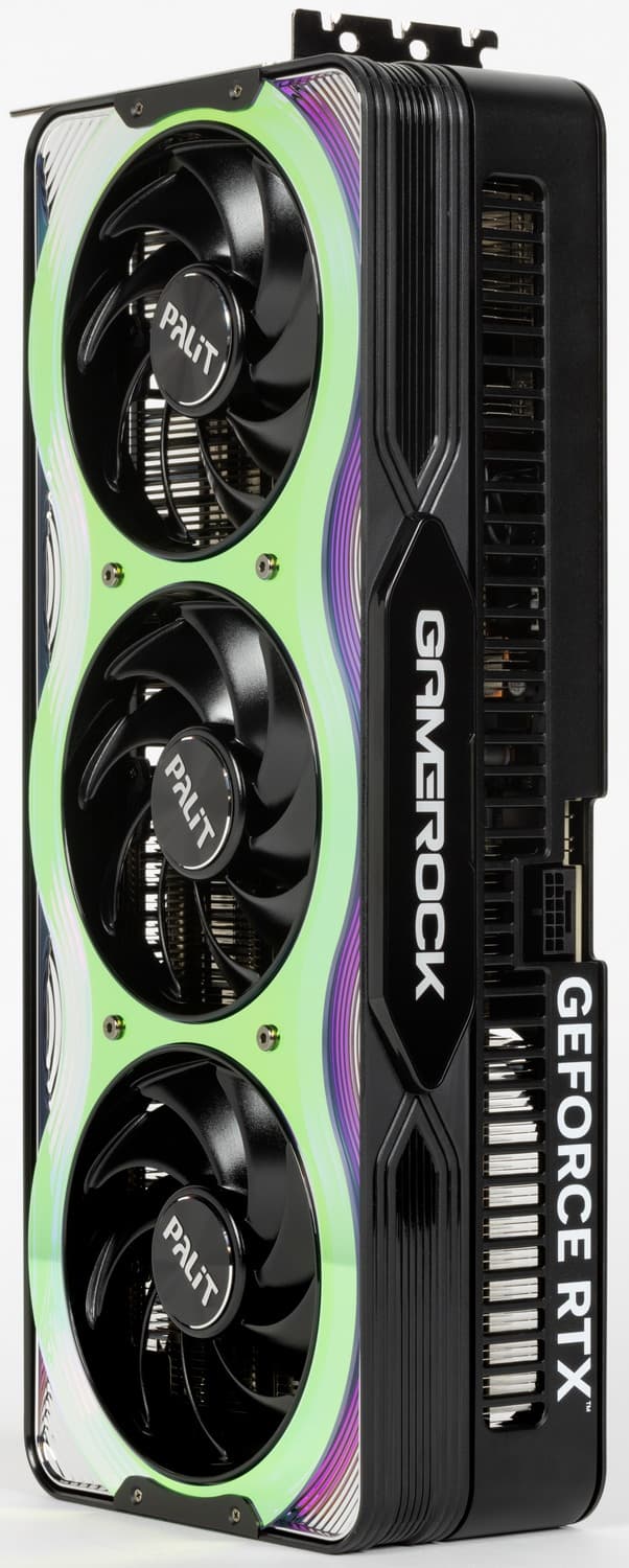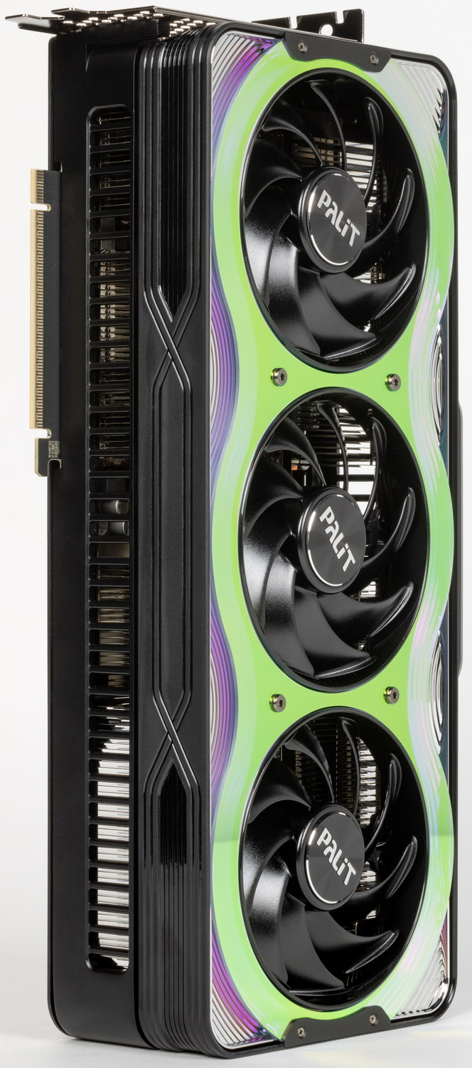 Карта Palit может потреблять до 575 Вт (это официальный лимит Nvidia) и имеет один 16-контактный разъем питания 12VHPWR (PCIe 5.0). У нее 4 видеовыхода: 1 HDMI 2.1b и 3 DisplayPort 2.1b, обеспечивающие пропускную способность до 80 Гбит/с в режиме передачи UHBR 20 и позволяющие подключить 8K-дисплей с частотой обновления 60 Гц по одному кабелю. Красивый кожух кулера, названный производителем «хамелеоном», впечатляет даже без подсветки. У визуальной стороны этого решения есть лишь один минус — сильно контрастирующие черные круги вентиляторов: как минимум лопасти надо было сделать полупрозрачными, чтобы часть свечения подсветки попадала на них.