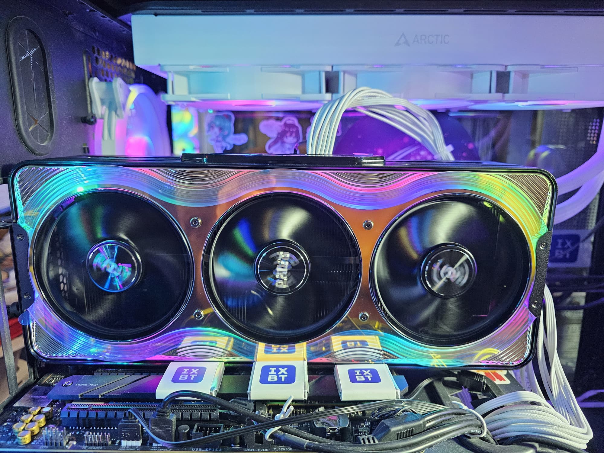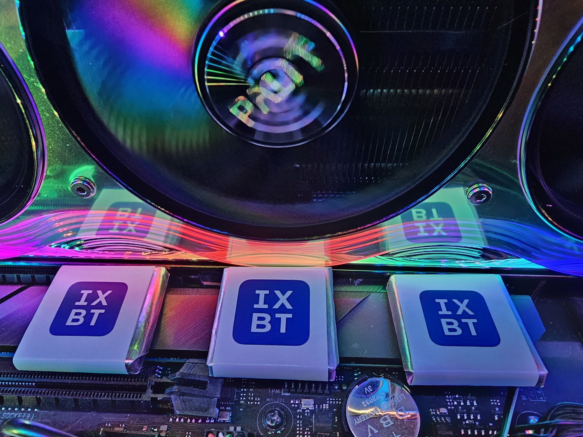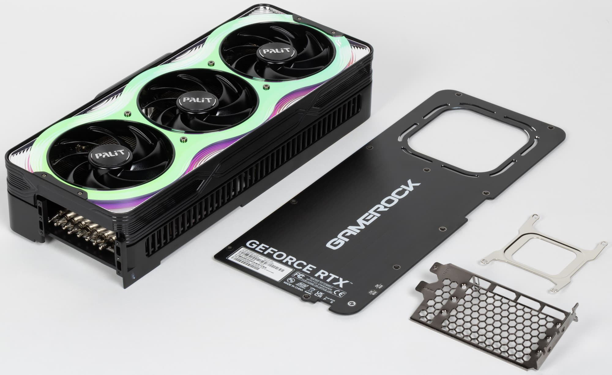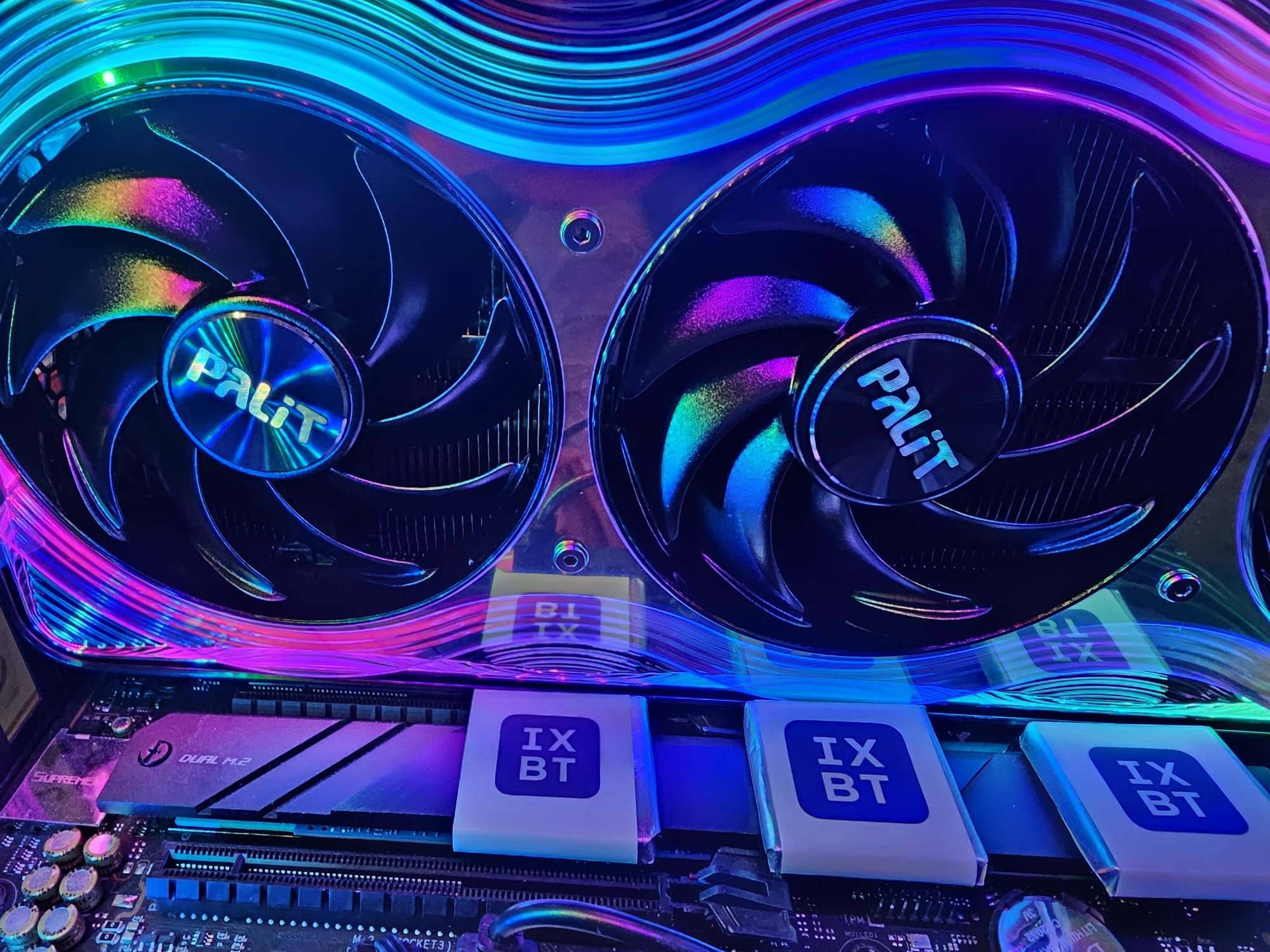 Карта Palit может потреблять до 575 Вт (это официальный лимит Nvidia) и имеет один 16-контактный разъем питания 12VHPWR (PCIe 5.0). У нее 4 видеовыхода: 1 HDMI 2.1b и 3 DisplayPort 2.1b, обеспечивающие пропускную способность до 80 Гбит/с в режиме передачи UHBR 20 и позволяющие подключить 8K-дисплей с частотой обновления 60 Гц по одному кабелю. Красивый кожух кулера, названный производителем «хамелеоном», впечатляет даже без подсветки. У визуальной стороны этого решения есть лишь один минус — сильно контрастирующие черные круги вентиляторов: как минимум лопасти надо было сделать полупрозрачными, чтобы часть свечения подсветки попадала на них.
