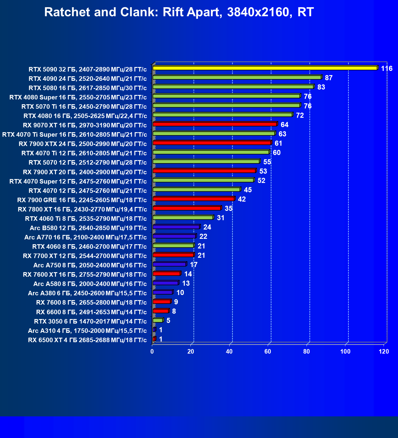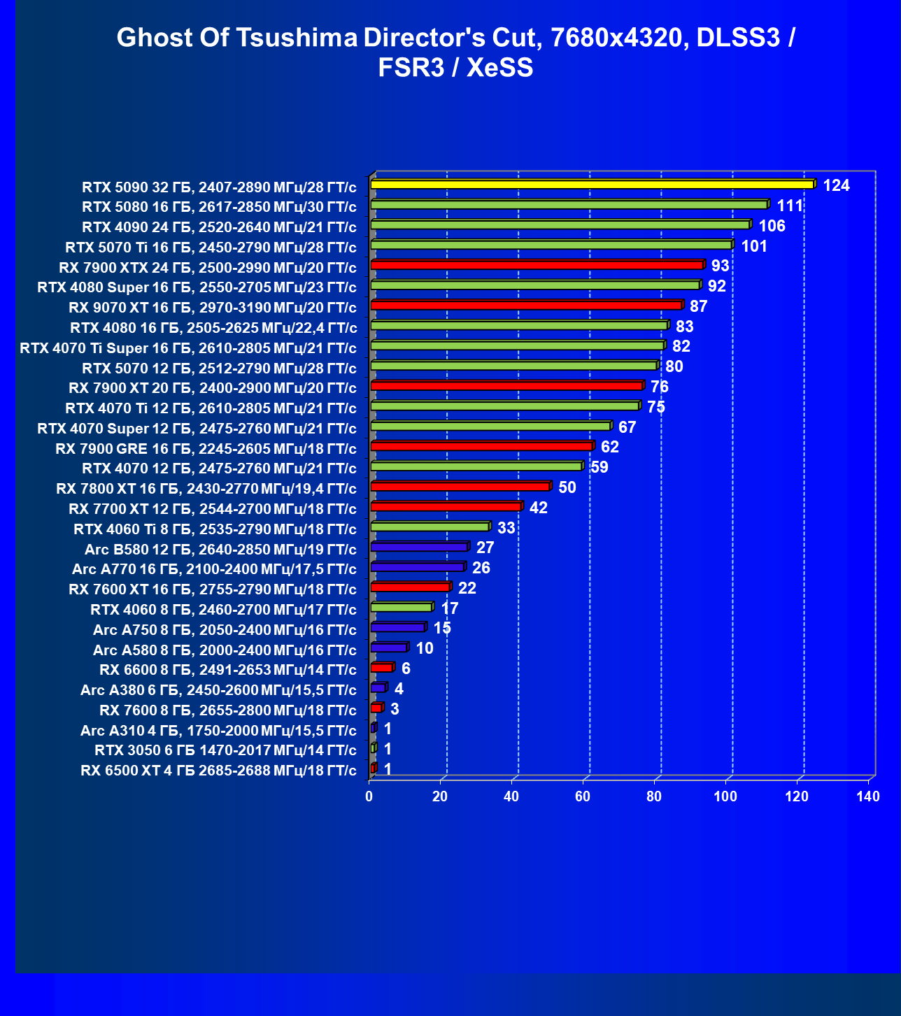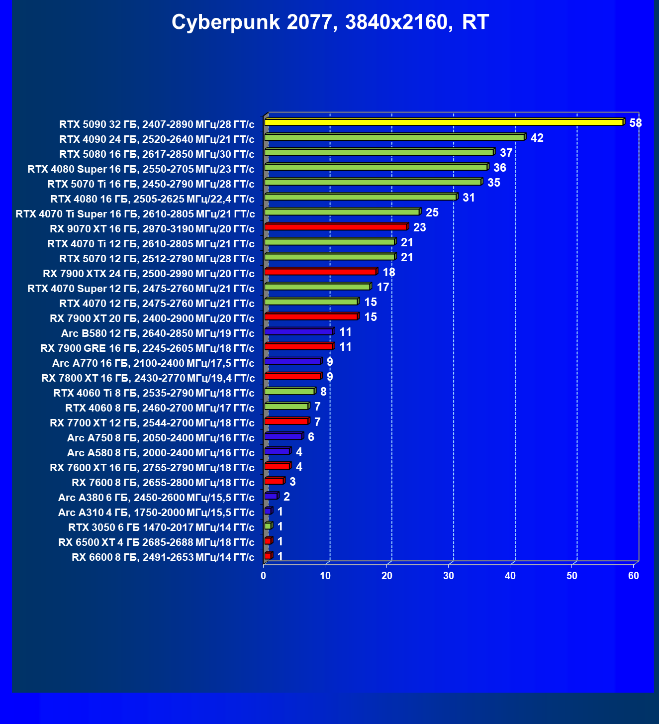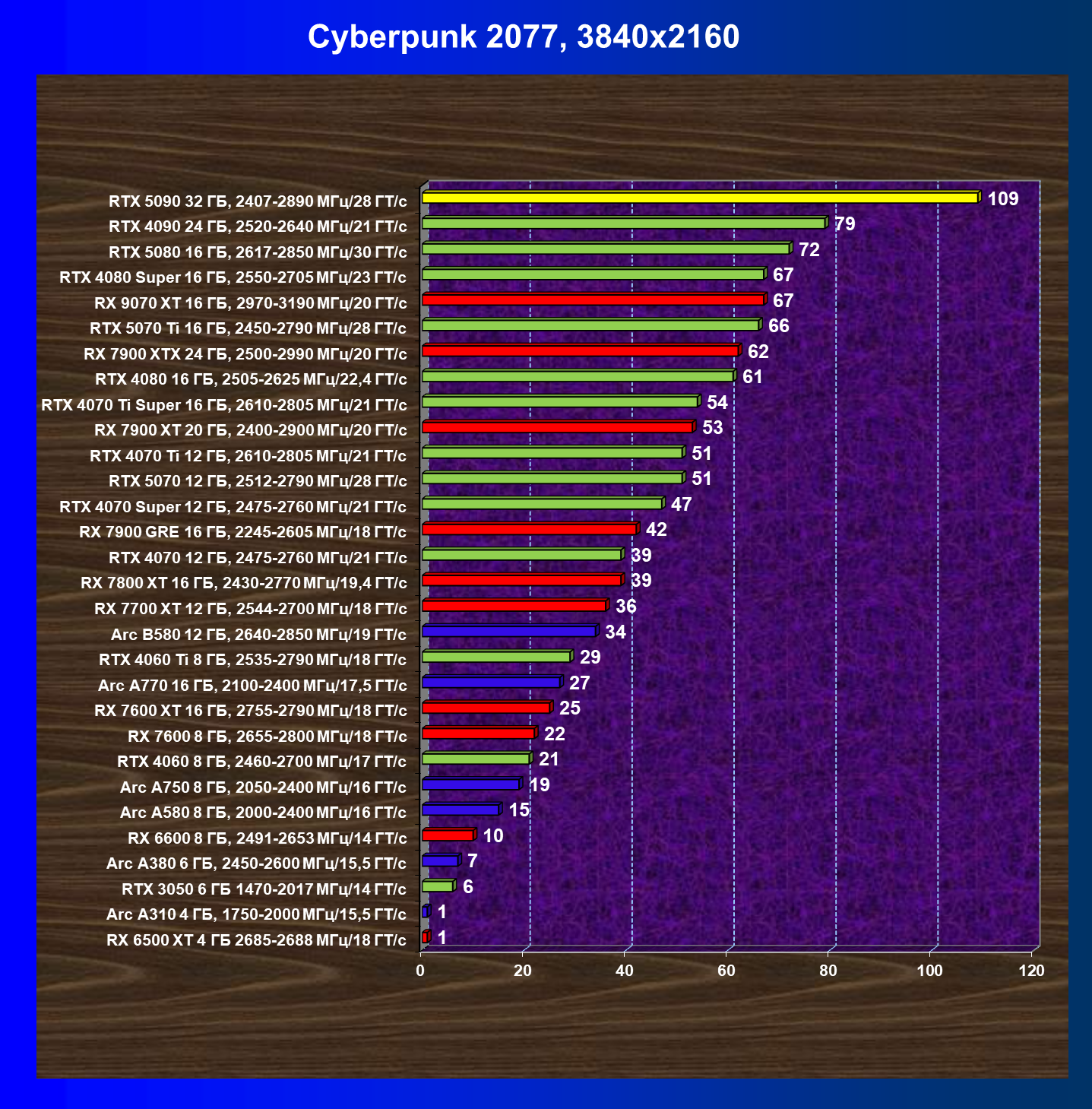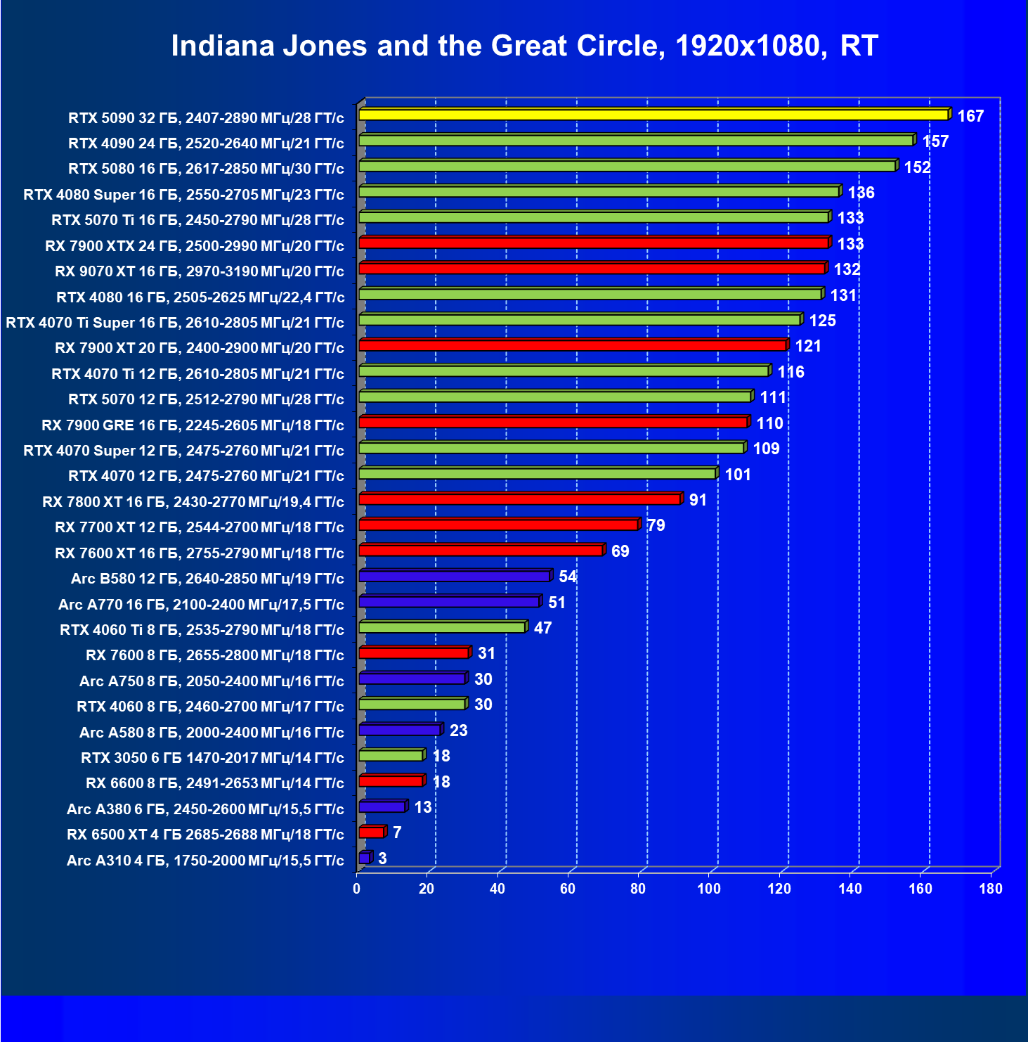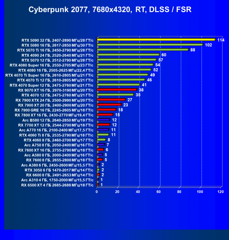 | 11 | RX 7900 XTX 24 ГБ, 2500—2990 МГц/20 ГТ/с | 6254 | 526 | 119 000 |