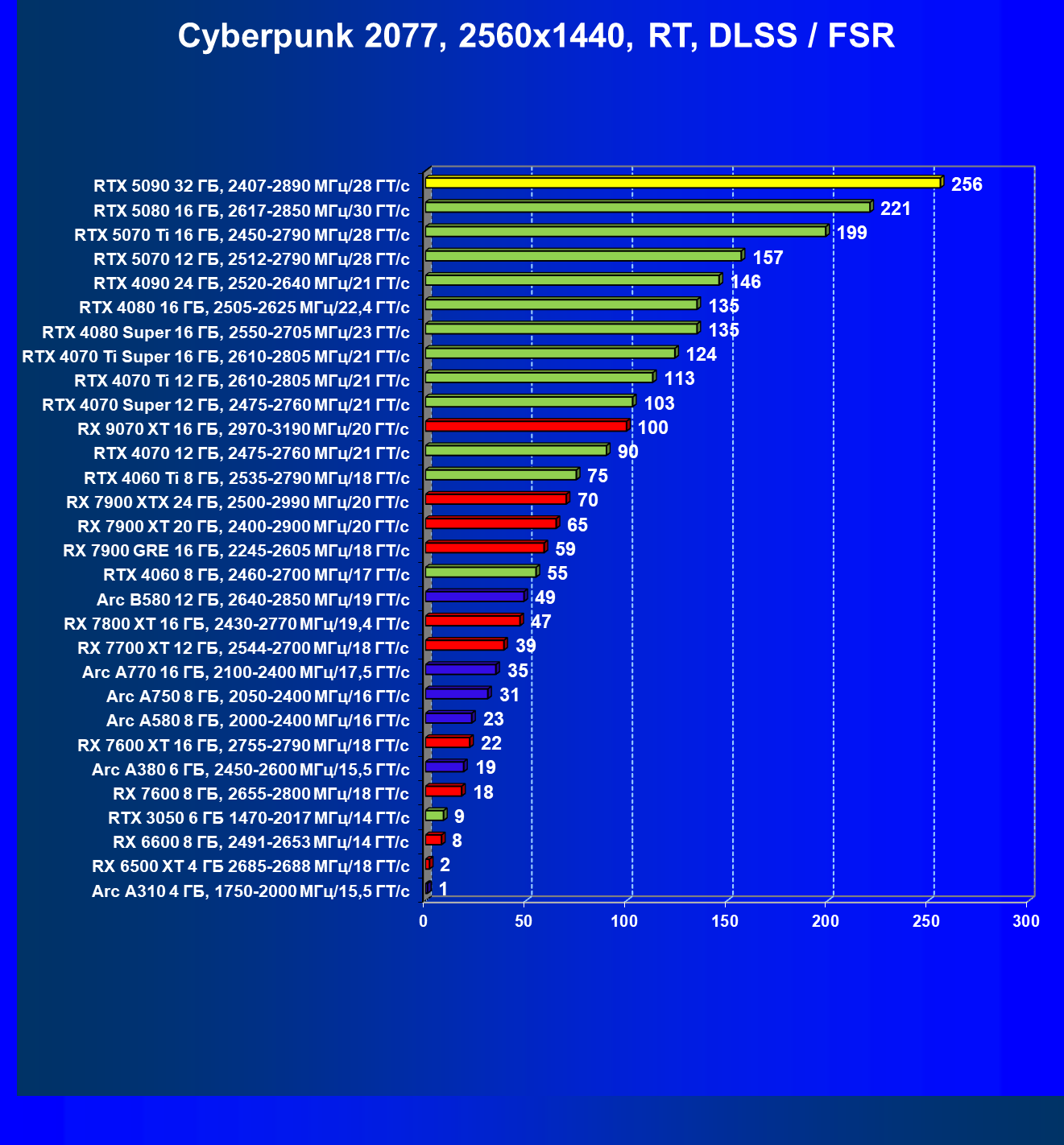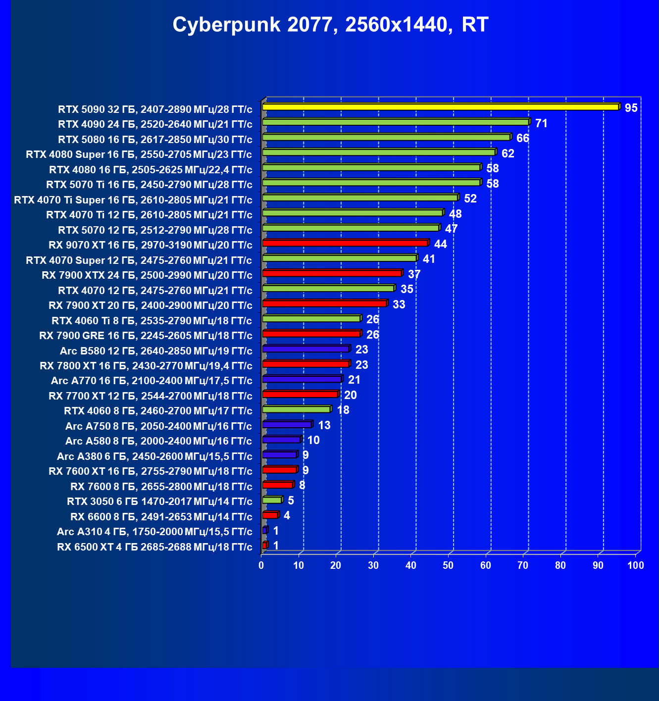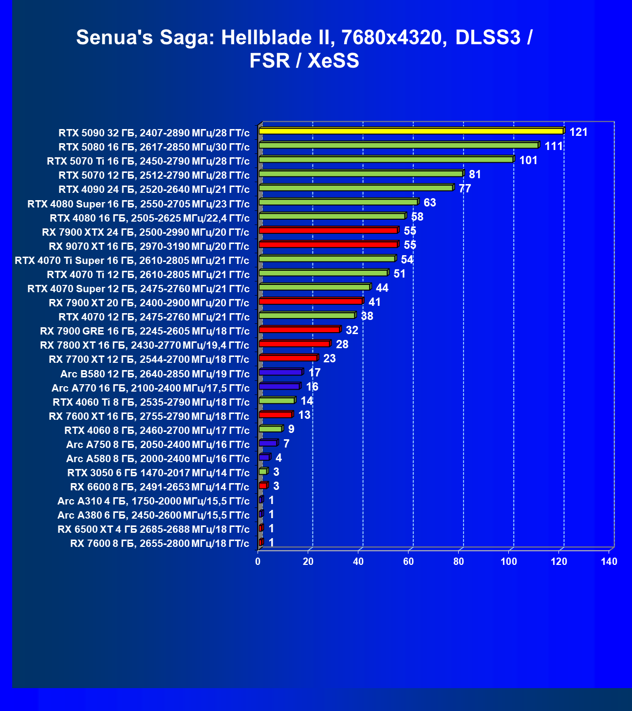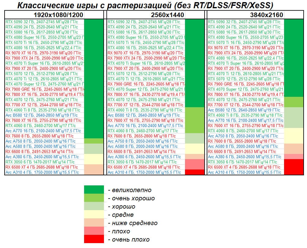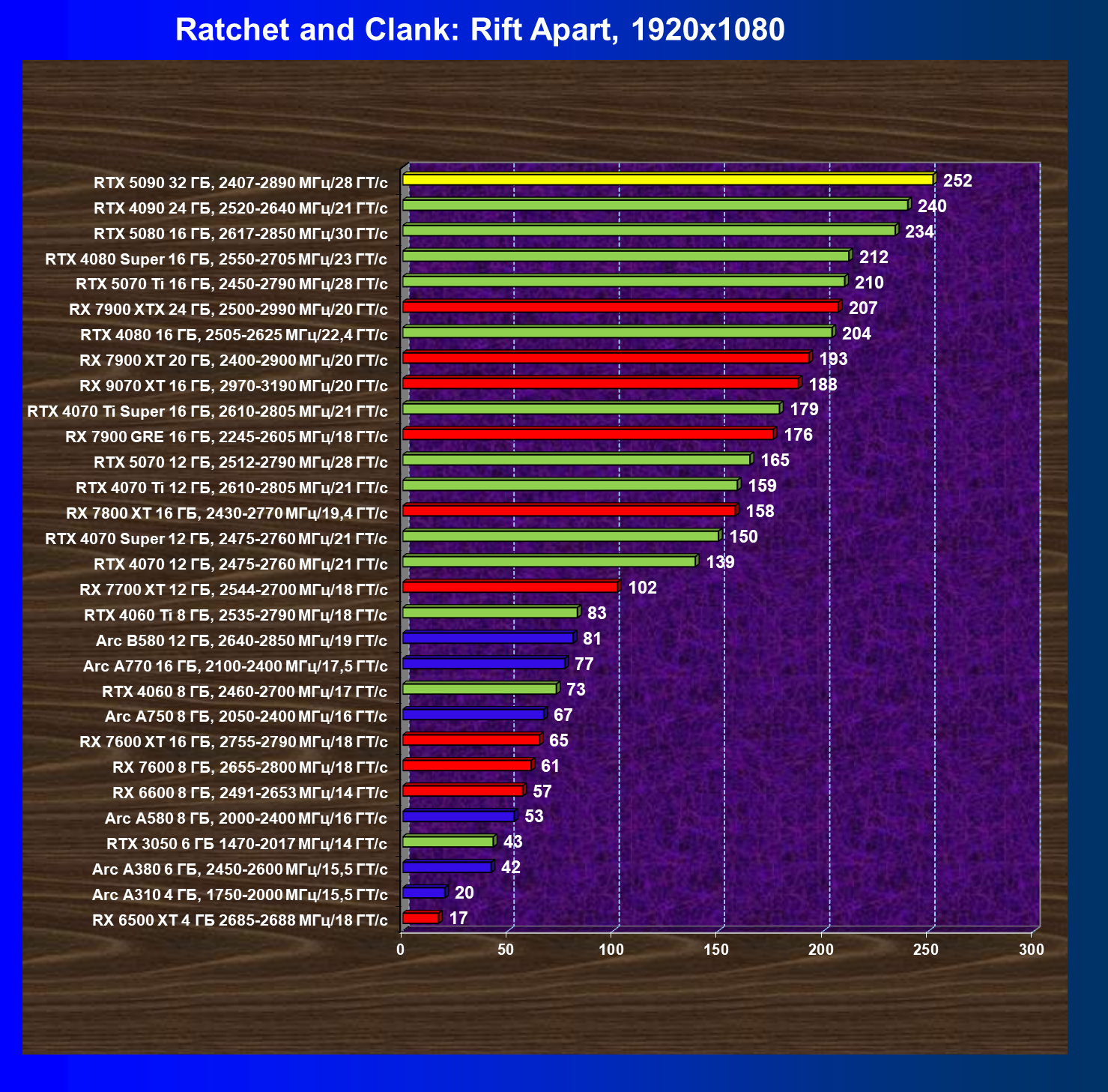 | 11 | RX 7900 XTX 24 ГБ, 2500—2990 МГц/20 ГТ/с | 6254 | 526 | 119 000 |