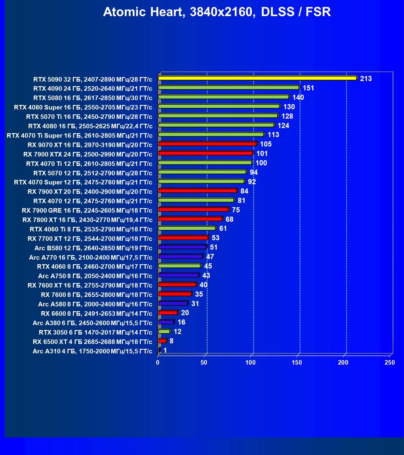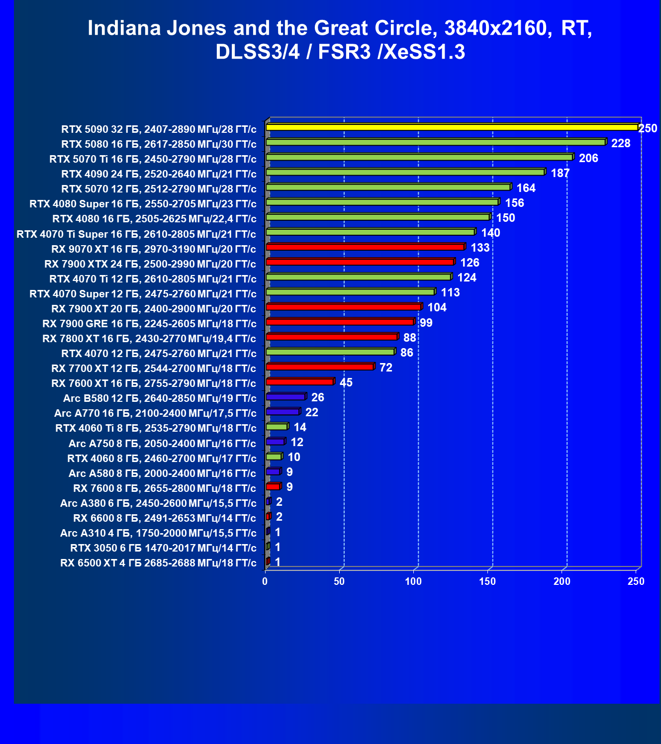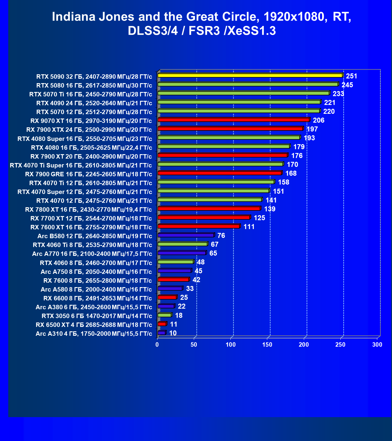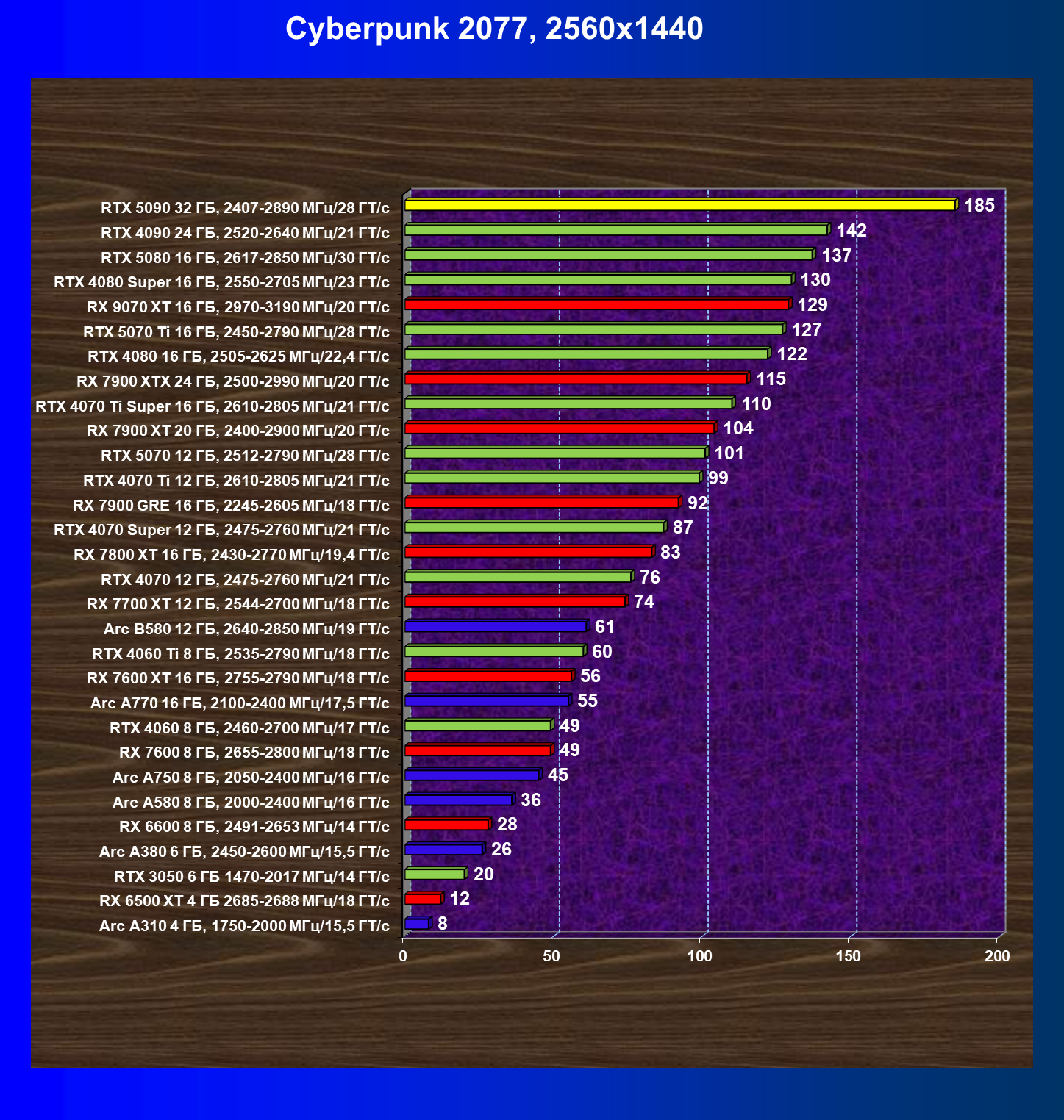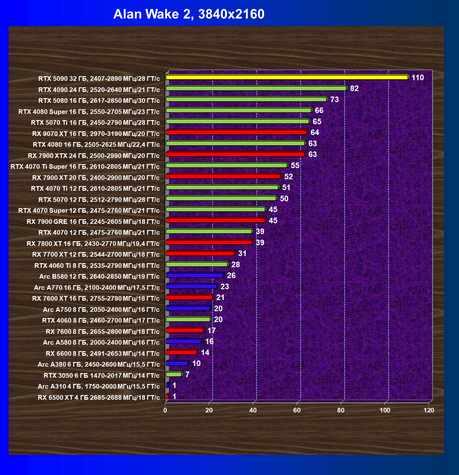 | 11 | RX 7900 XTX 24 ГБ, 2500—2990 МГц/20 ГТ/с | 6254 | 526 | 119 000 |