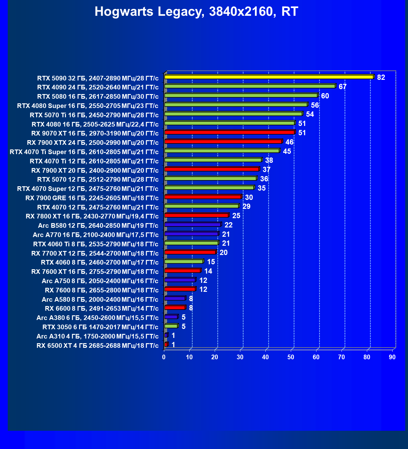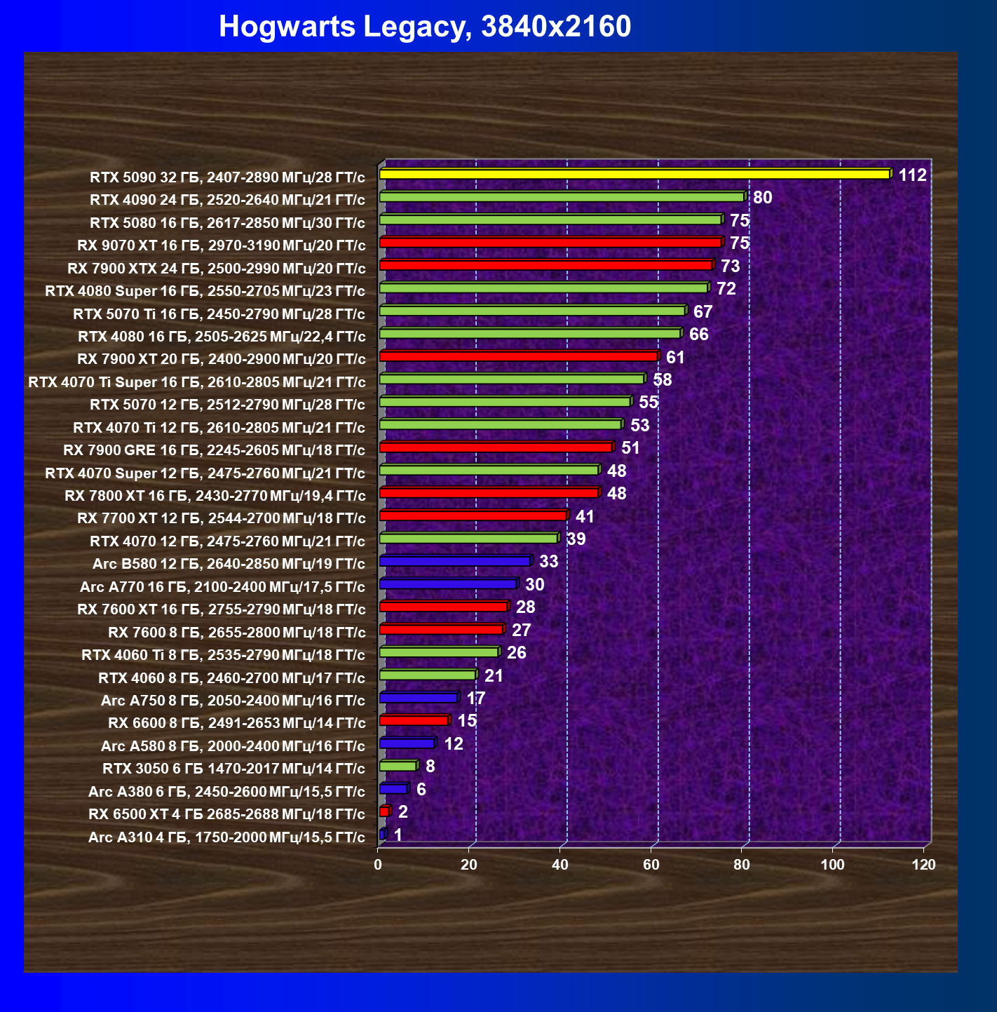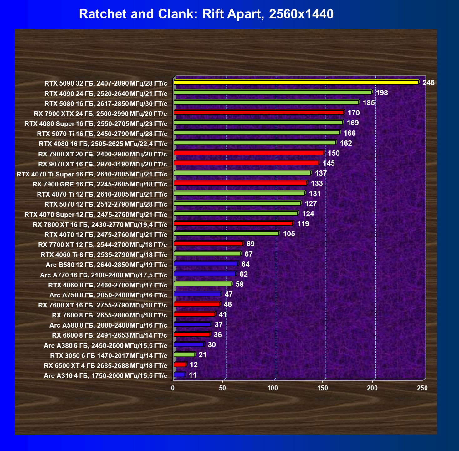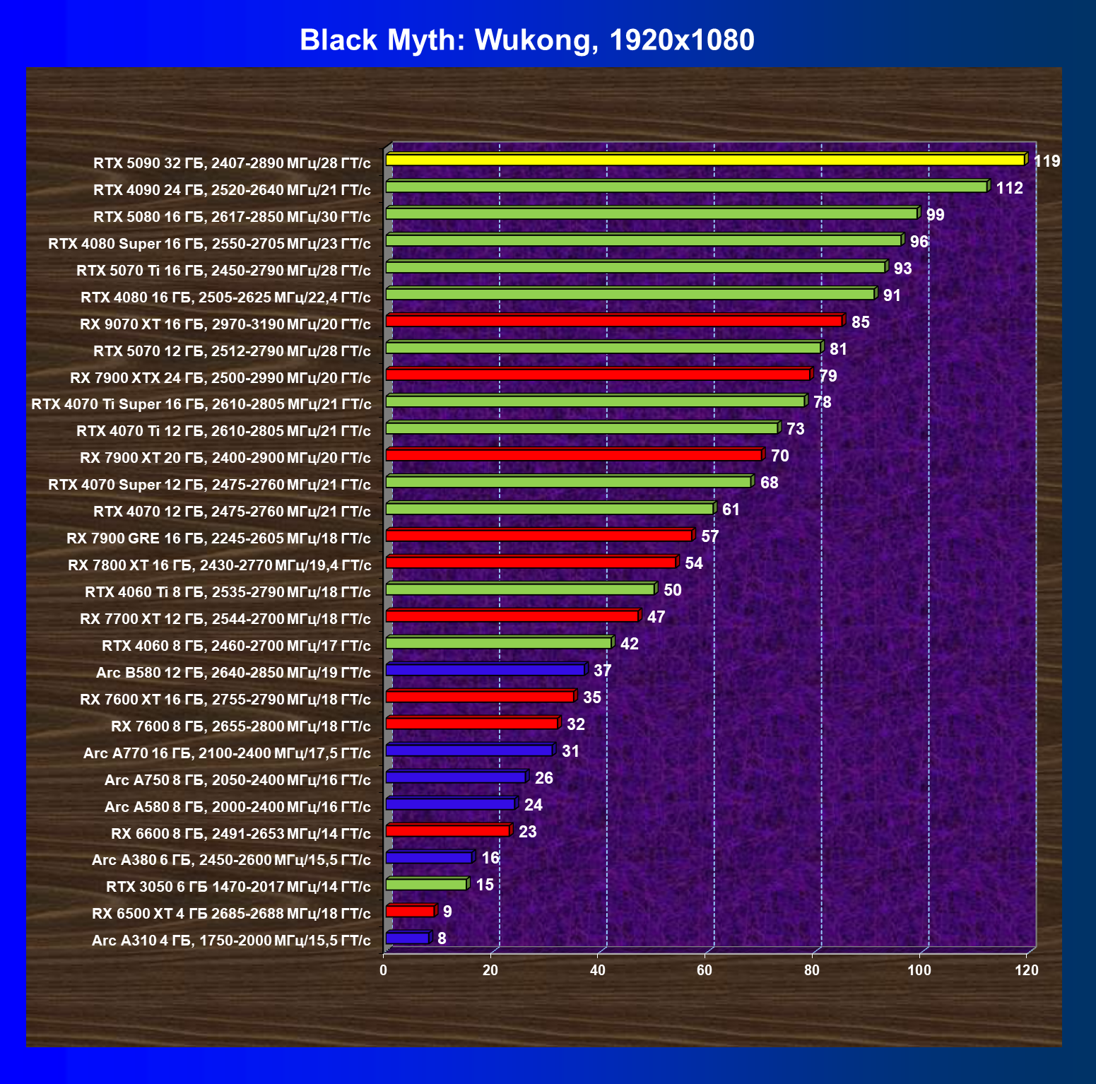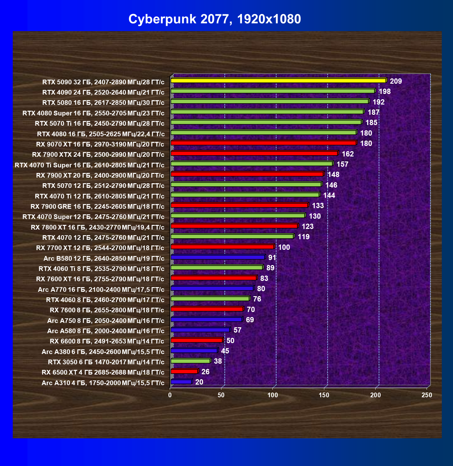 | 11 | RX 7900 XTX 24 ГБ, 2500—2990 МГц/20 ГТ/с | 6254 | 526 | 119 000 |