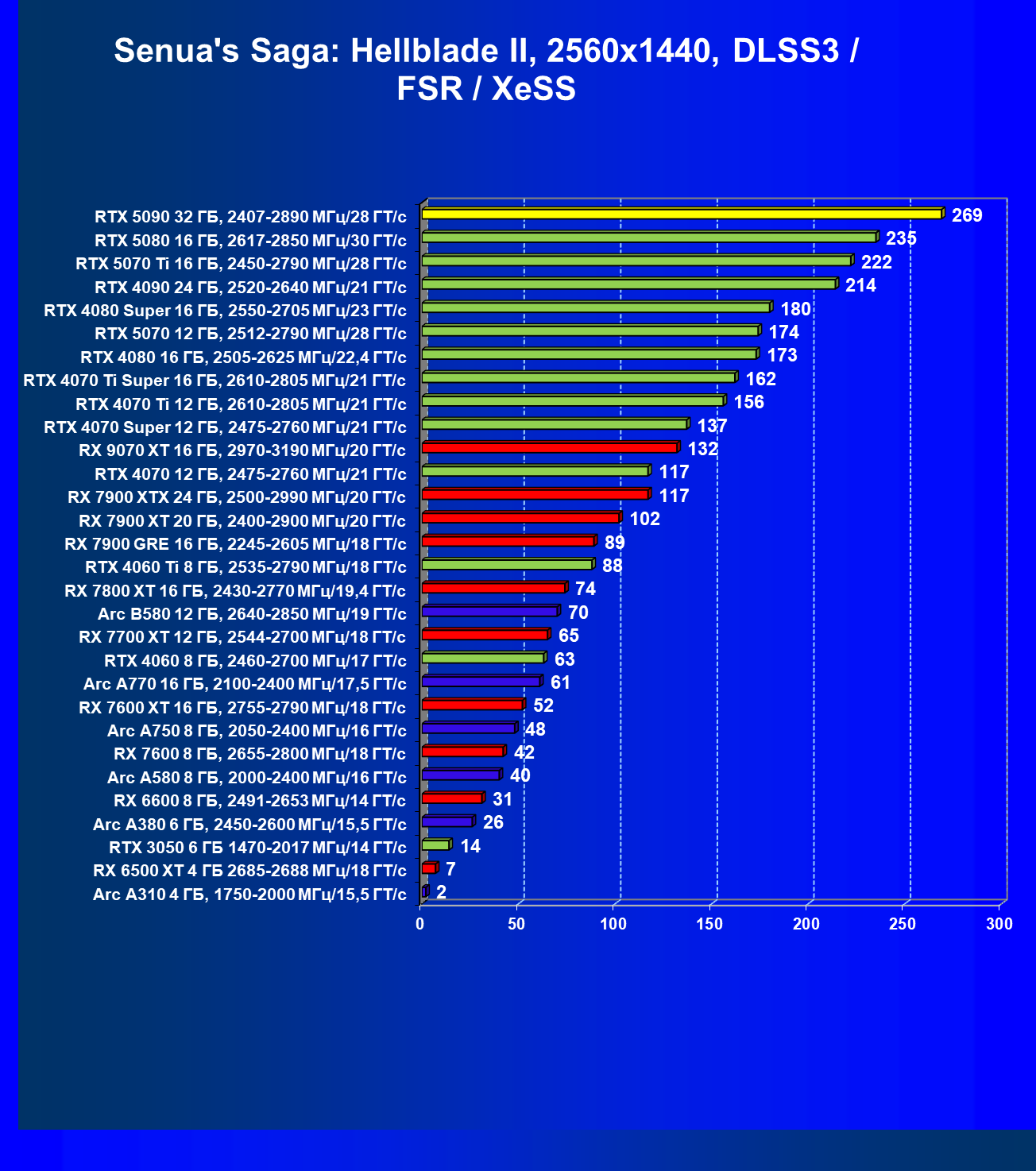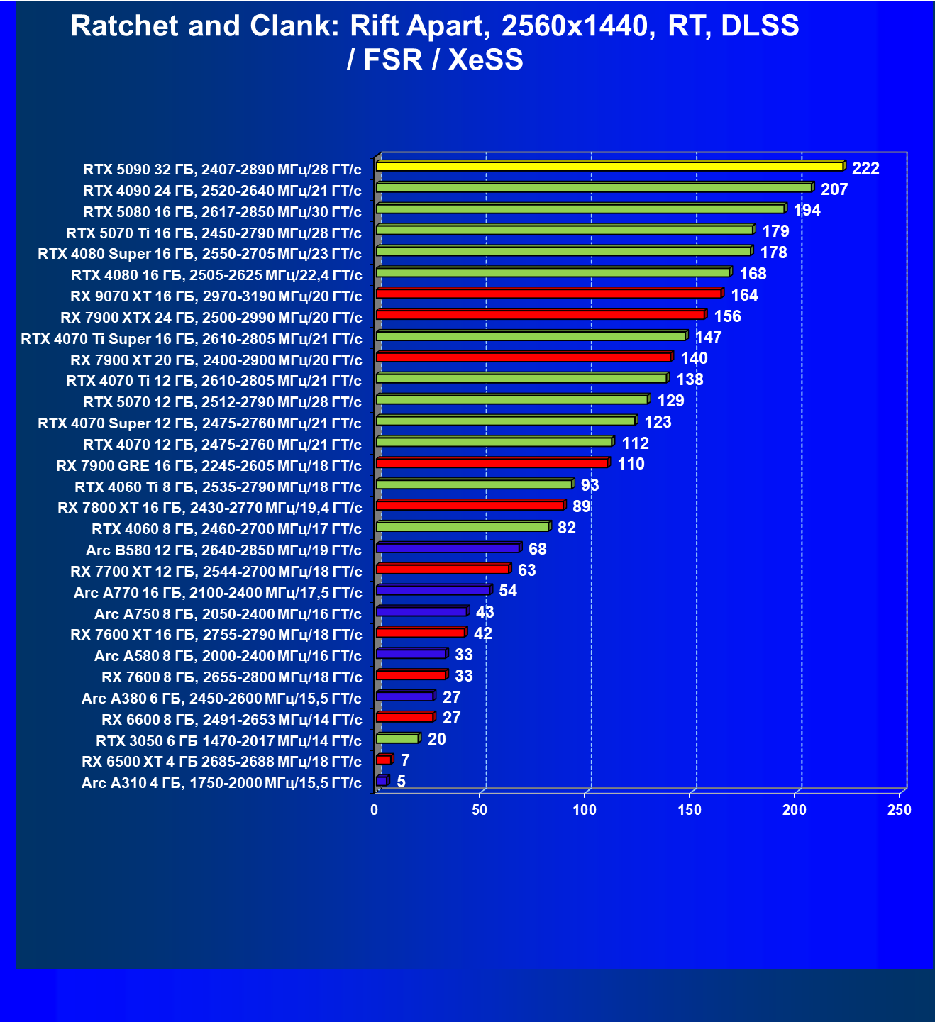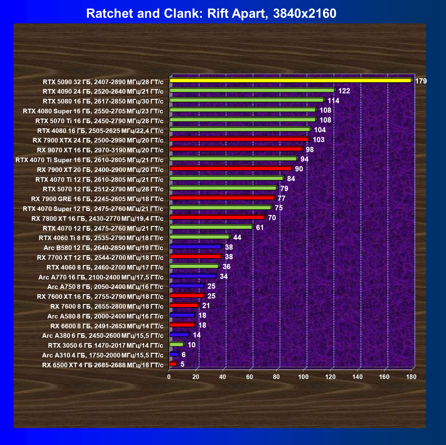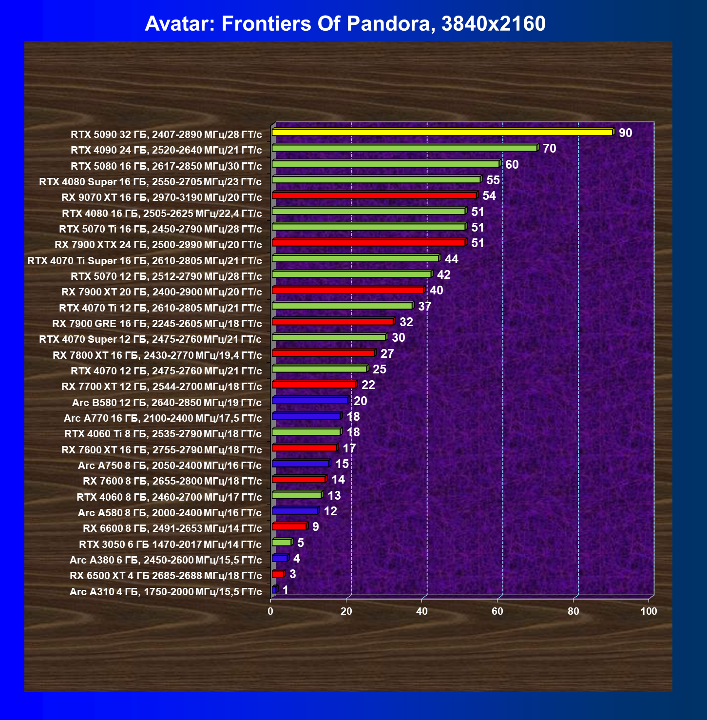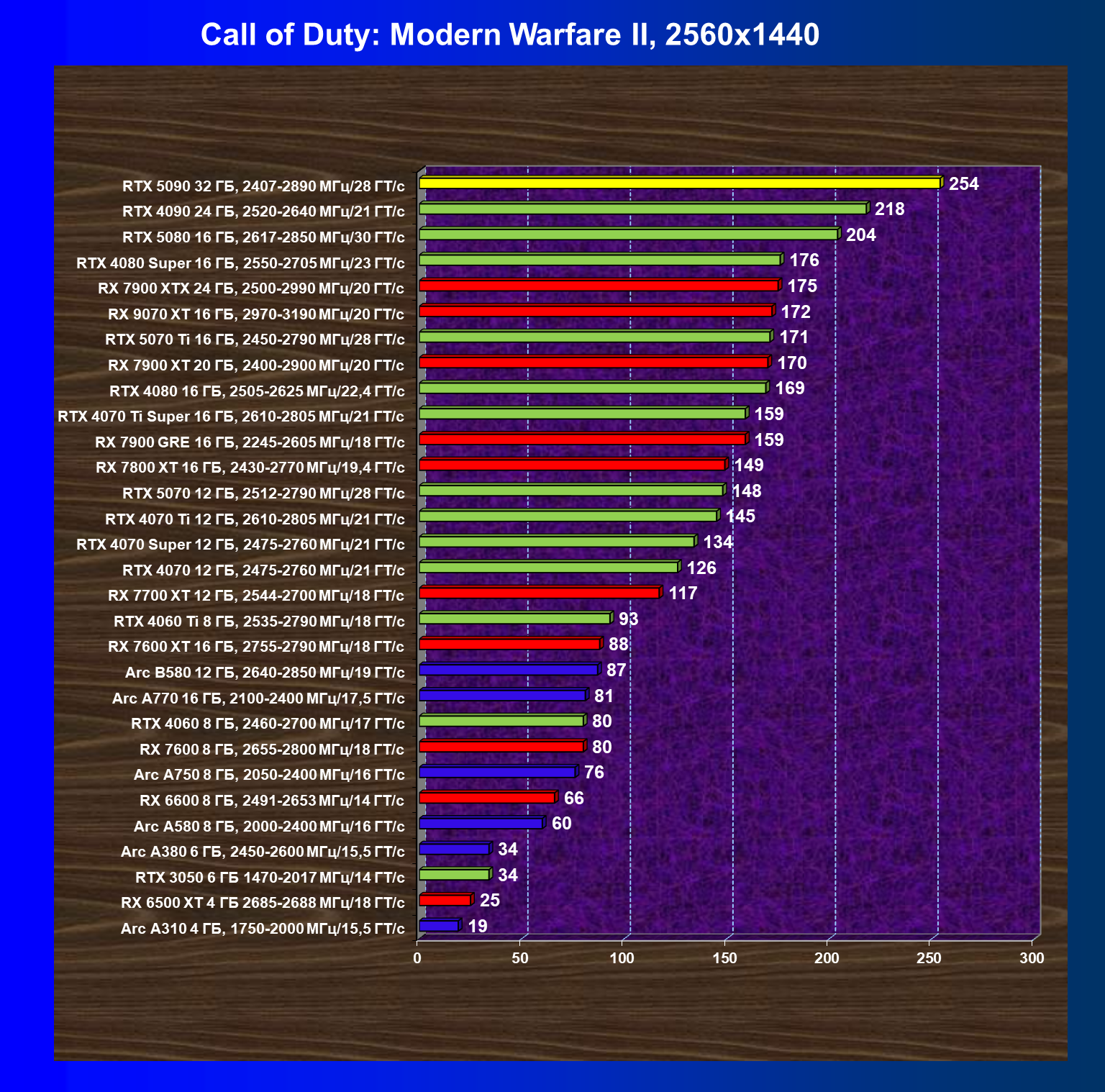 | 11 | RX 7900 XTX 24 ГБ, 2500—2990 МГц/20 ГТ/с | 6254 | 526 | 119 000 |