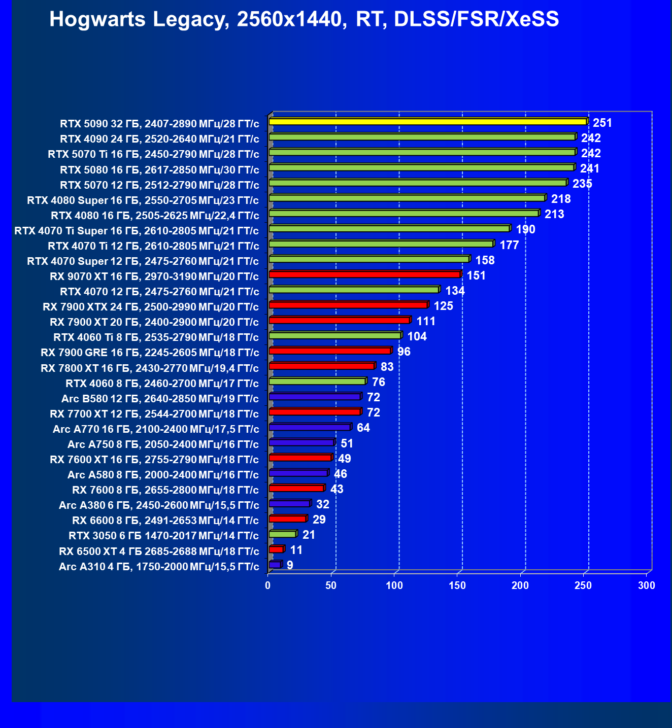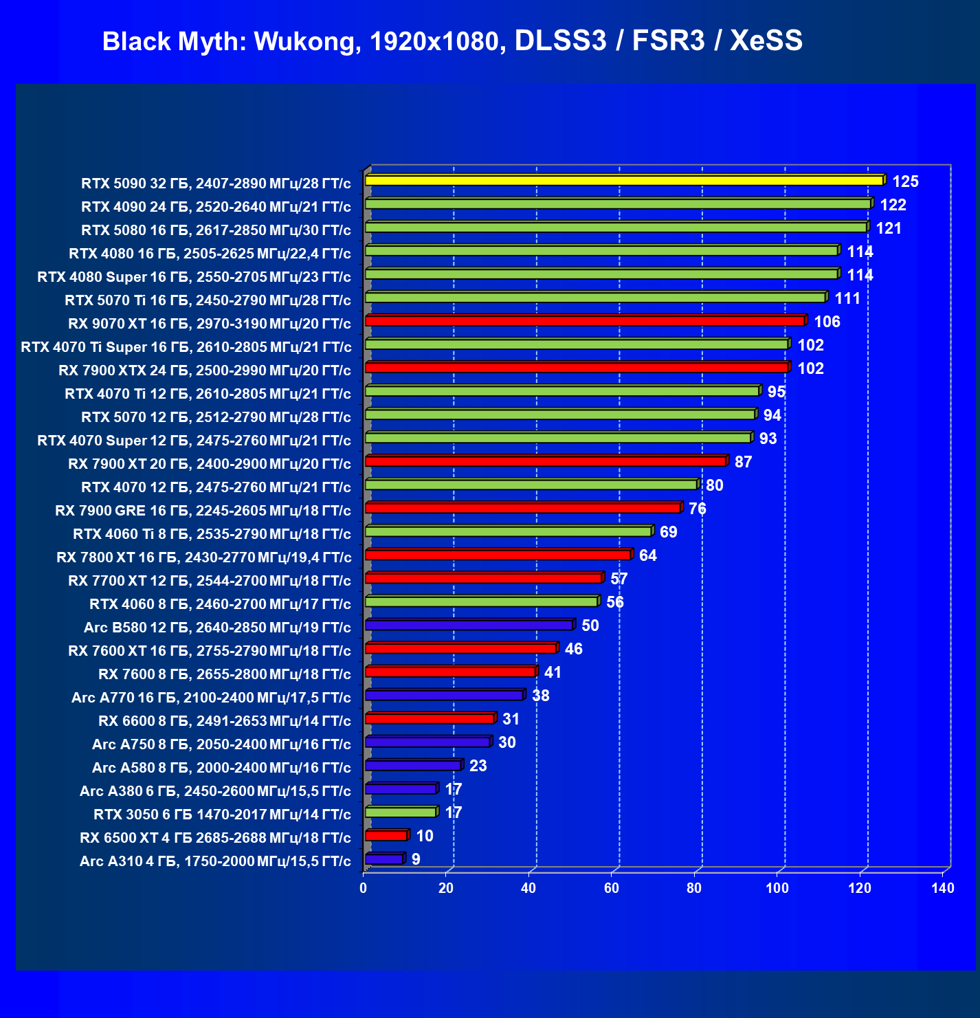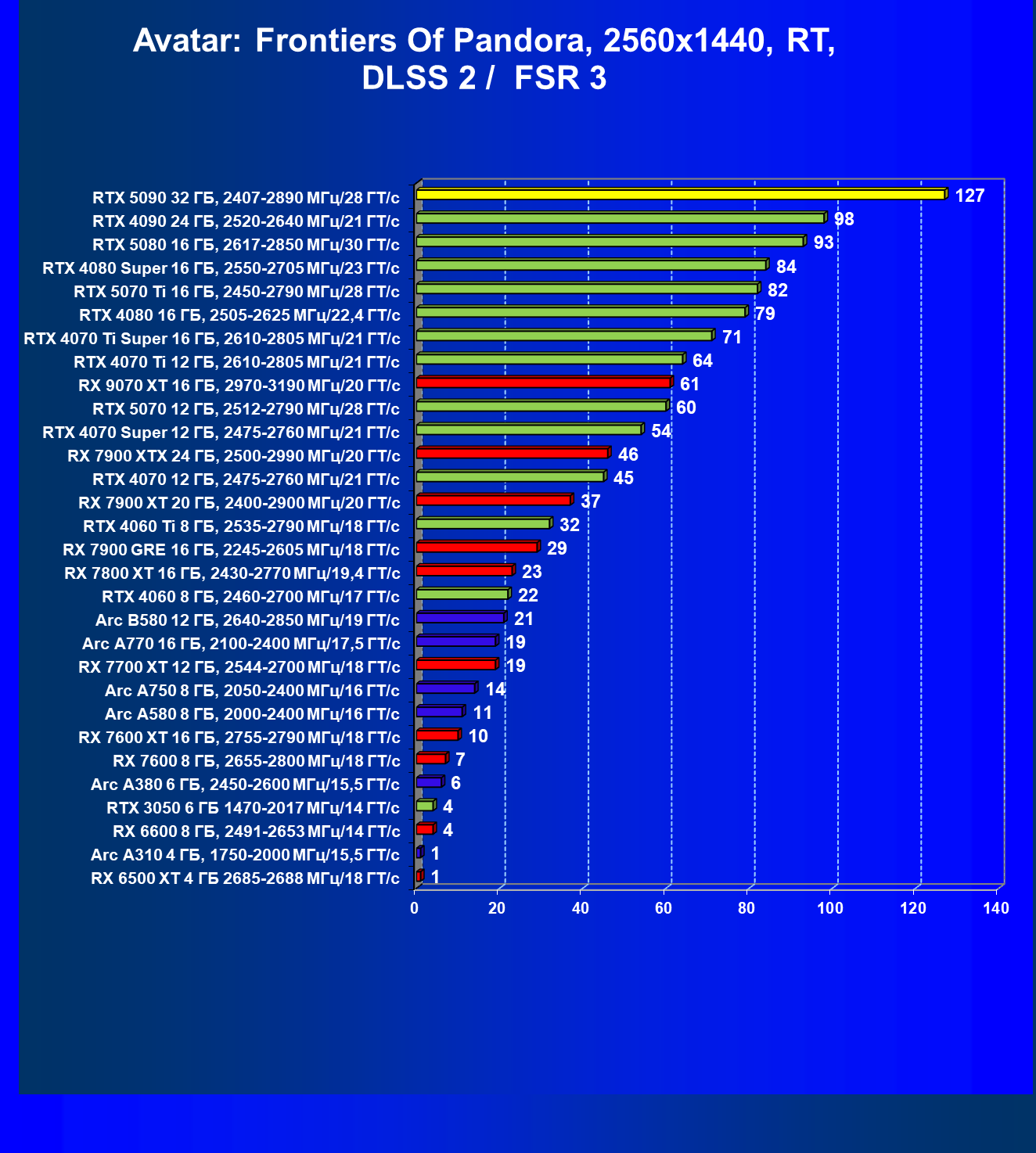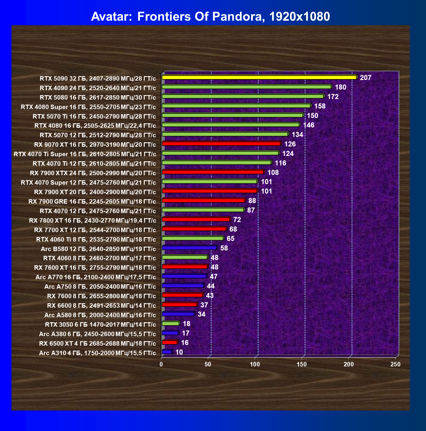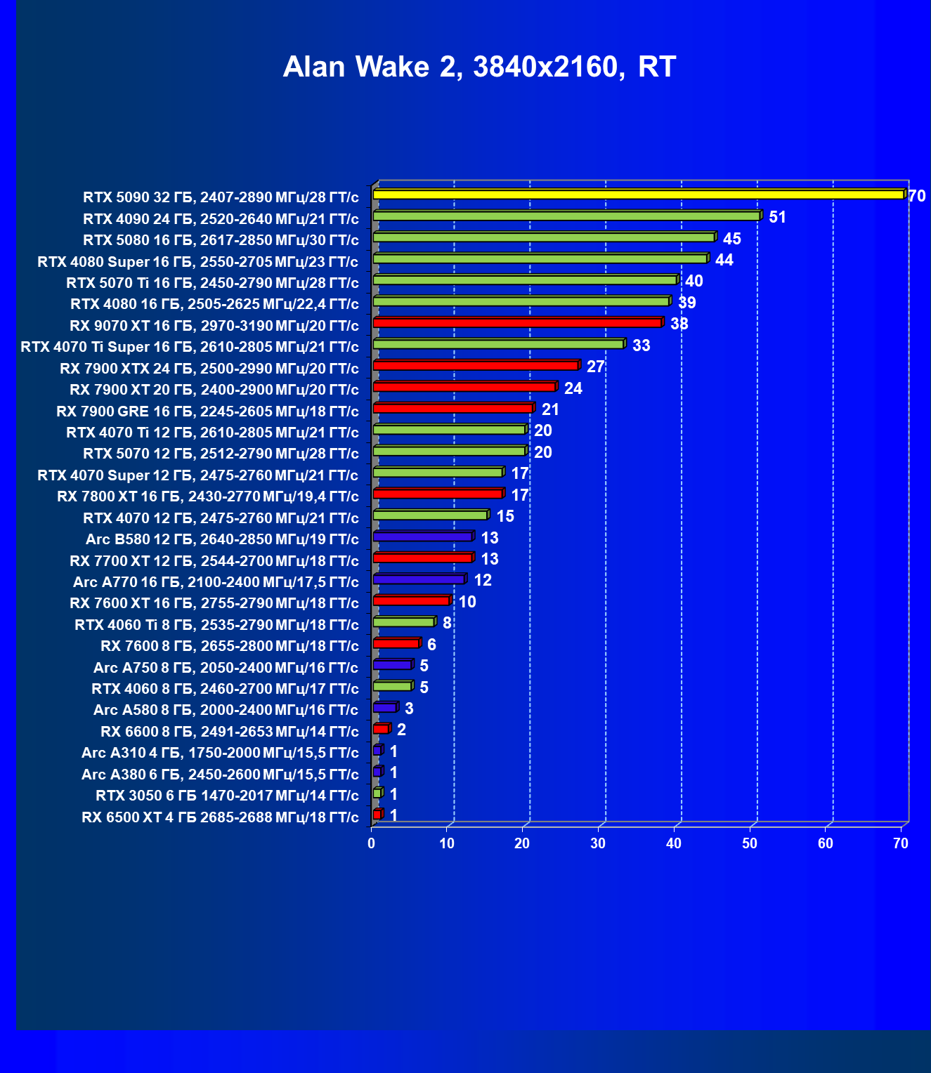 | 11 | RX 7900 XTX 24 ГБ, 2500—2990 МГц/20 ГТ/с | 6254 | 526 | 119 000 |