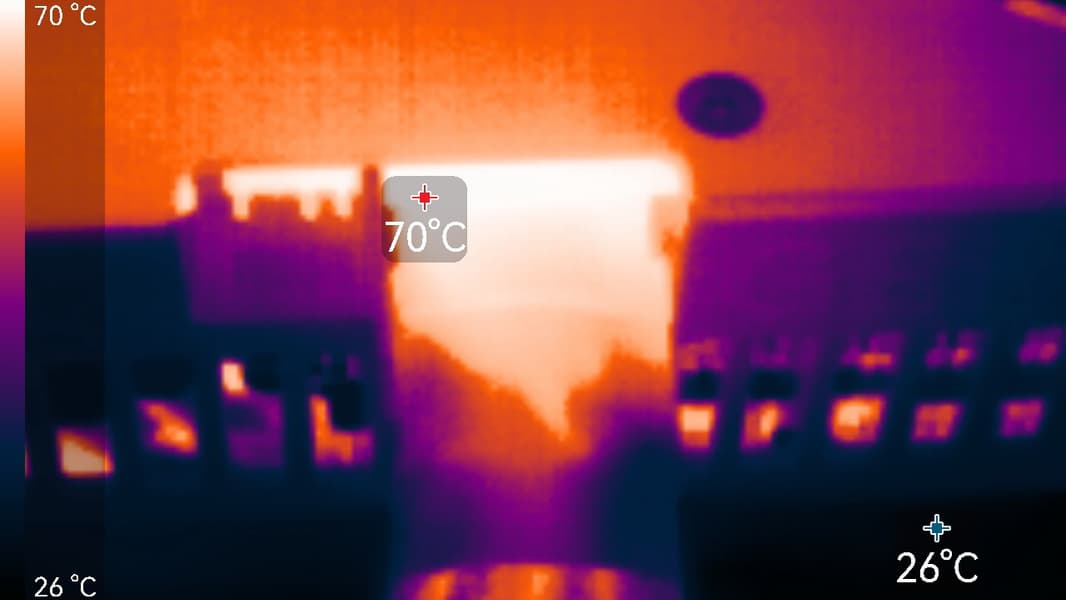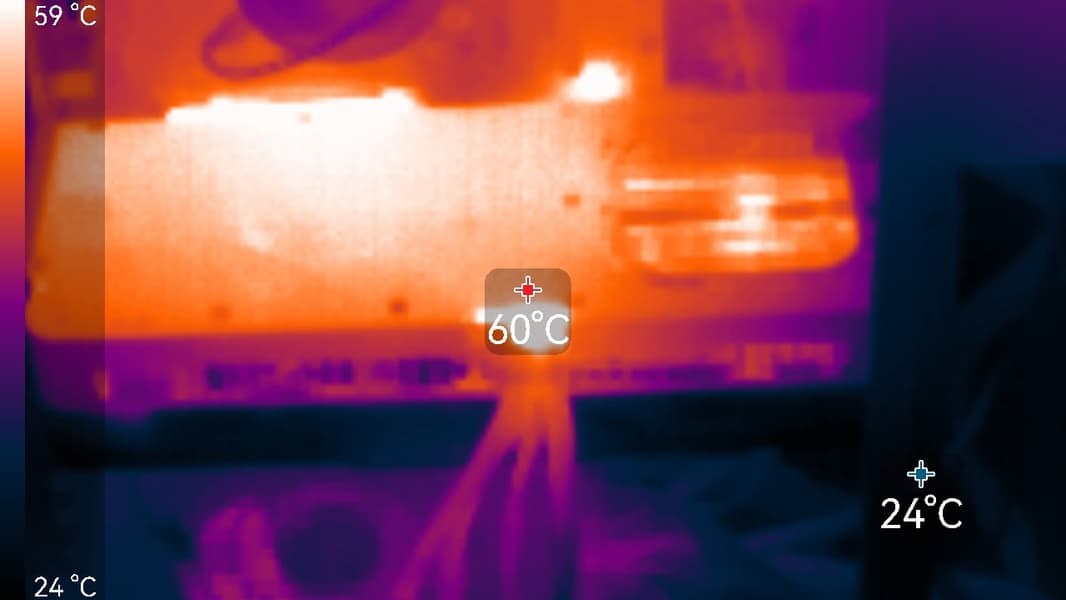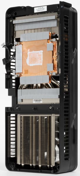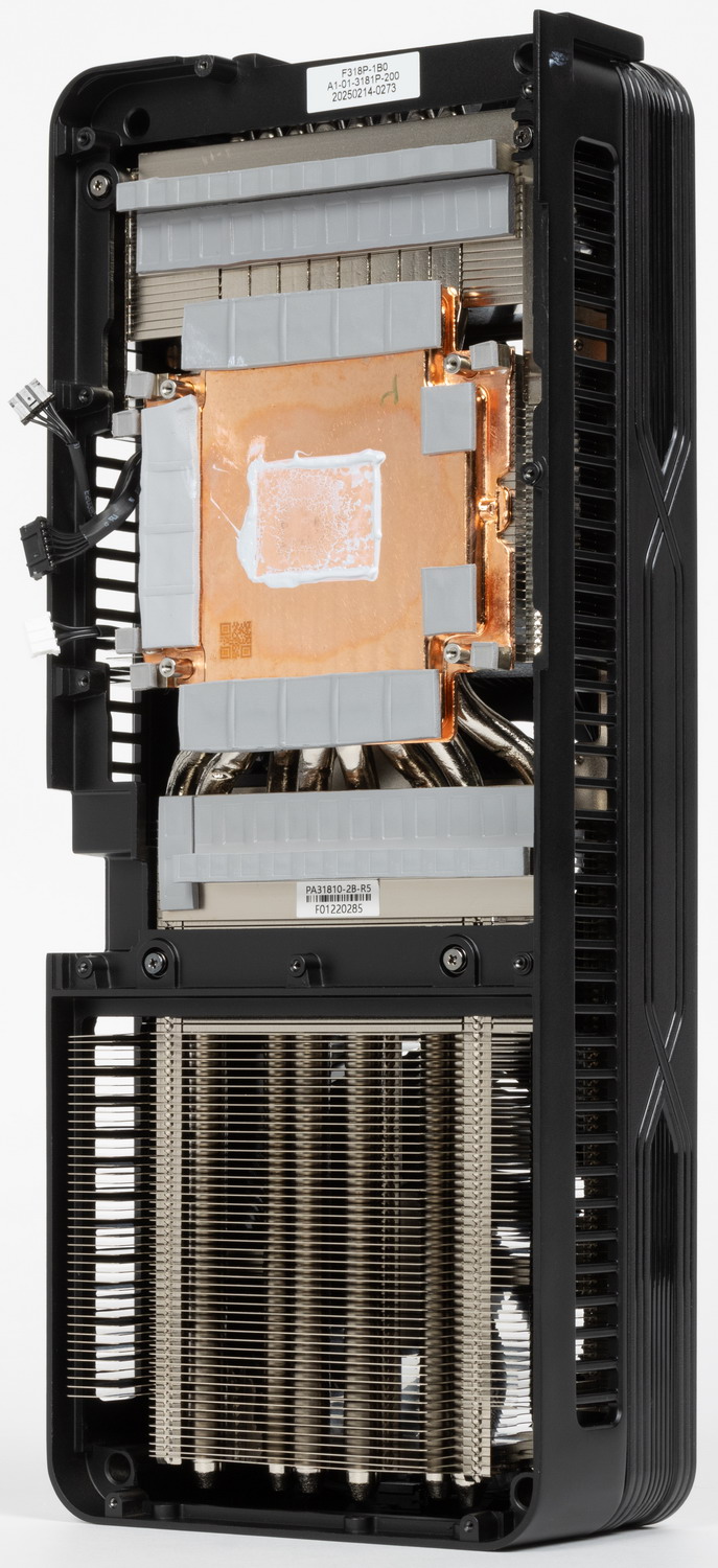Благодаря переработанному дизайну системы охлаждения, несмотря на приличное увеличение максимального потребления энергии с 450 Вт до 575 Вт, для GeForce RTX 5090 FE удалось уменьшить общую толщину с трех слотов до двух — помогла система двойного сквозного продува воздуха Double Flow Through, в которой воздушные потоки проходят через радиаторы насквозь. Система охлаждения использует испарительную камеру и пять тепловых трубок, отводящих тепло от GPU к радиатору, также в GeForce RTX 5090 FE был впервые применен жидкий металл для передачи тепла. В итоге при максимальной нагрузке GPU нагревается до температуры порядка 80 °C, что не слишком много для такого уровня, хотя уровень шума от вентиляторов при этом не назвать низким, он явно выше, чем у топовых Founders Edition предыдущих поколений. Nvidia пришлось пойти на компромиссное решение, решив создать двухслотовую видеокарту с потреблением под 600 Вт. Ну хотя бы в режиме без 3D-нагрузки видеокарта работает бесшумно, так как вентиляторы полностью останавливаются.
