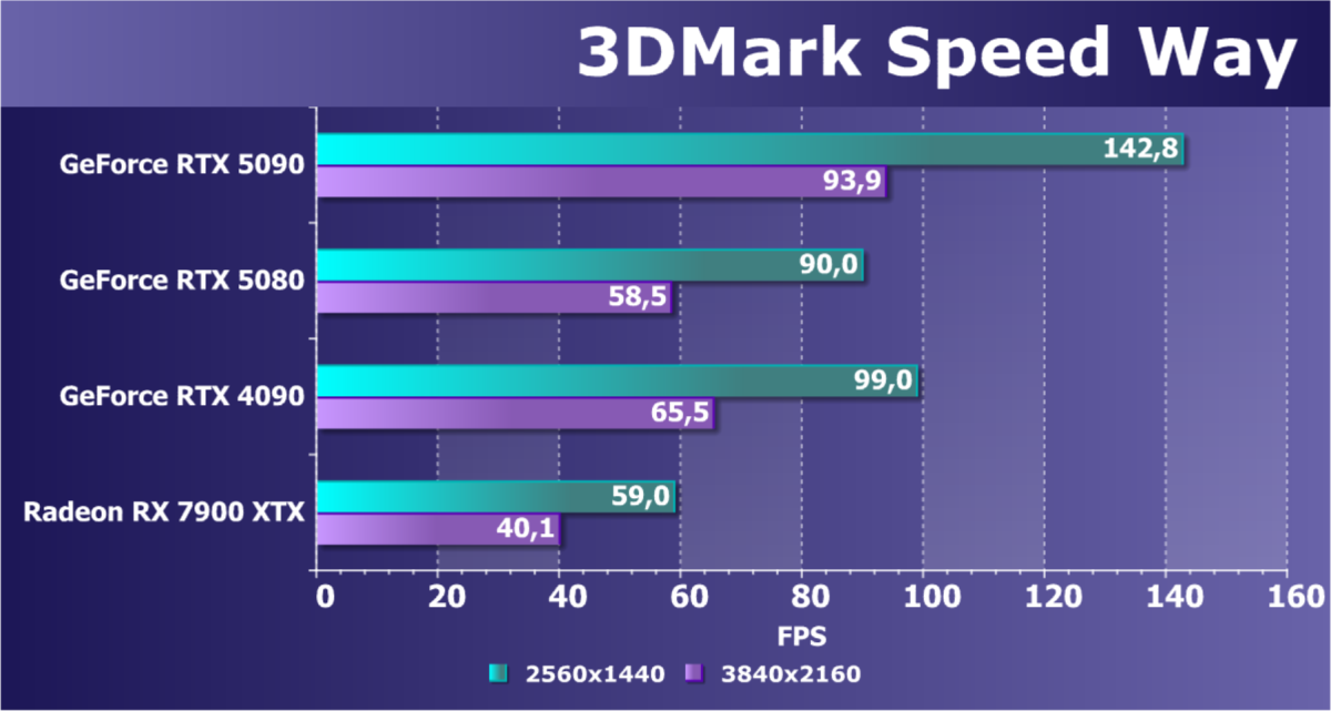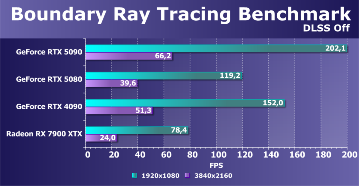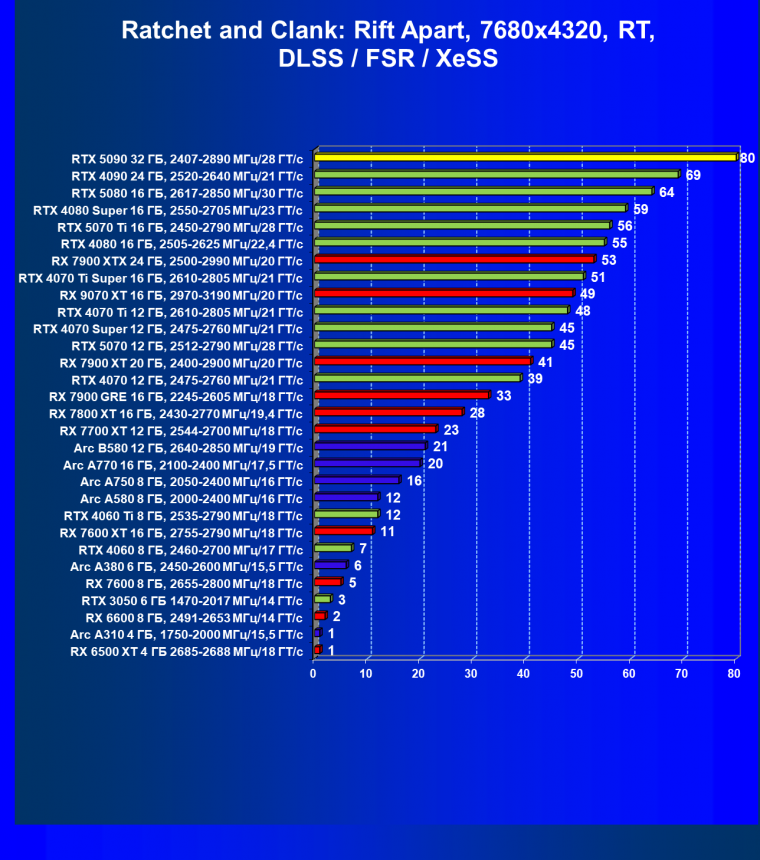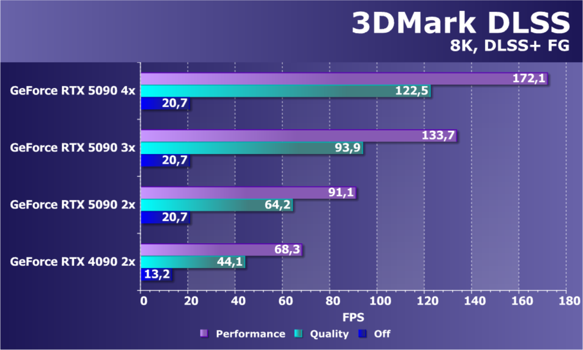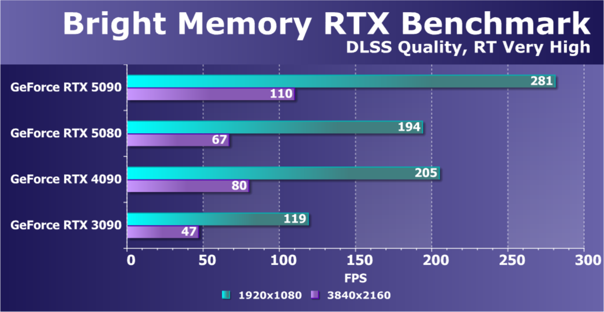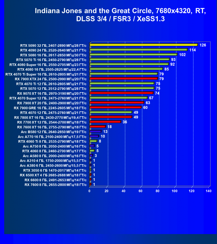 Отметим еще раз, что GeForce RTX 5090 будет обеспечивать отменный комфорт во всех играх на максимальных настройках качества при отключенных и включенных трассировке лучей и технологиях масштабирования в разрешениях до 2160p (4K) включительно. Во многих играх при использовании тех же технологий DLSS/FSR/XeSS (а подчас и без них) можно получить хороший комфорт и в разрешении 8K.