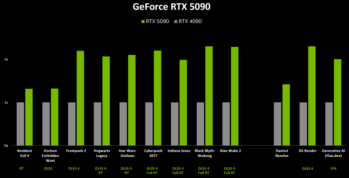 Сама Nvidia указывает преимущество новинки над GeForce RTX 4090 в два и более раза, но если присмотреться к диаграмме внимательнее, то видно, что такой прирост производительности почти всегда учитывает многокадровую генерацию. И хотя она действительно увеличивает частоту кадров, сравнивать так не совсем корректно, это лукавство. Справедливости ради, компания привела и пару игр и ПО без учета DLSS 4, а также ускоренных FP4-вычислений тензорными ядрами. Естественно, что GeForce RTX 5090 предназначена исключительно для 4K-разрешения и выше (8K во многих случаях наконец-то становится играбельным не номинально), никто не будет тестировать новинку в меньшем разрешении, это глупо.
