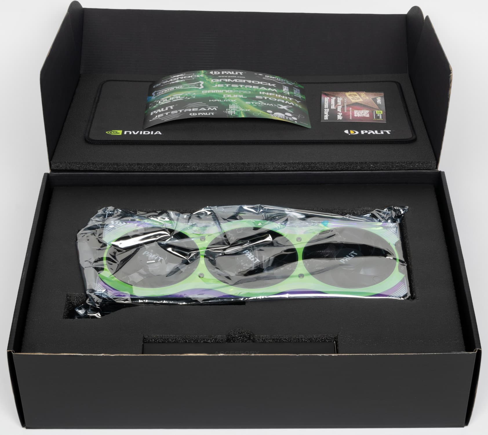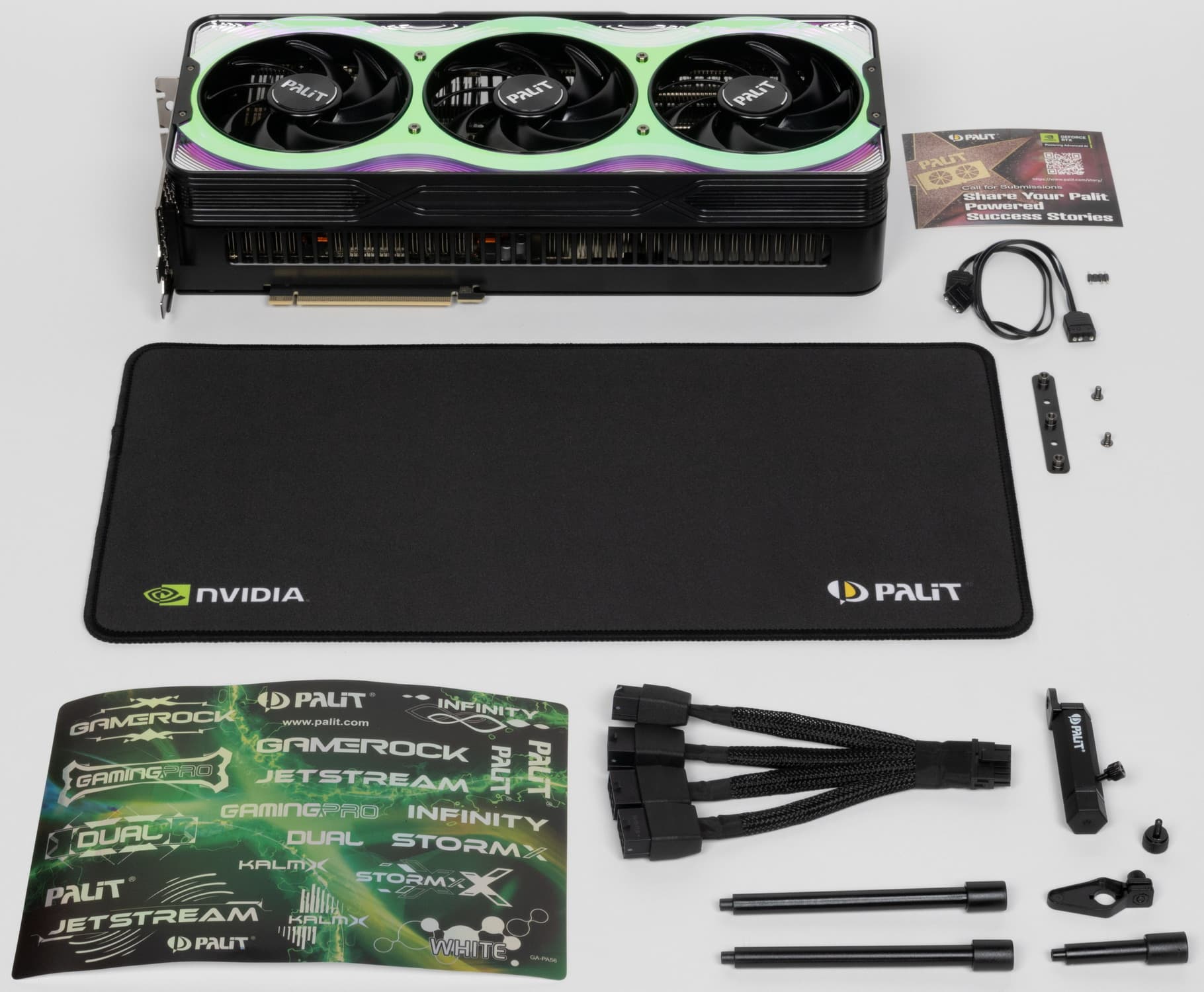 Можно снова похвалить компанию Palit за комплект поставки, где кроме видеокарты имеются переходник питания, адаптер для синхронизации подсветки, прикручиваемая к карте раздвижная подставка, бонусные стикеры и коврик для мыши.