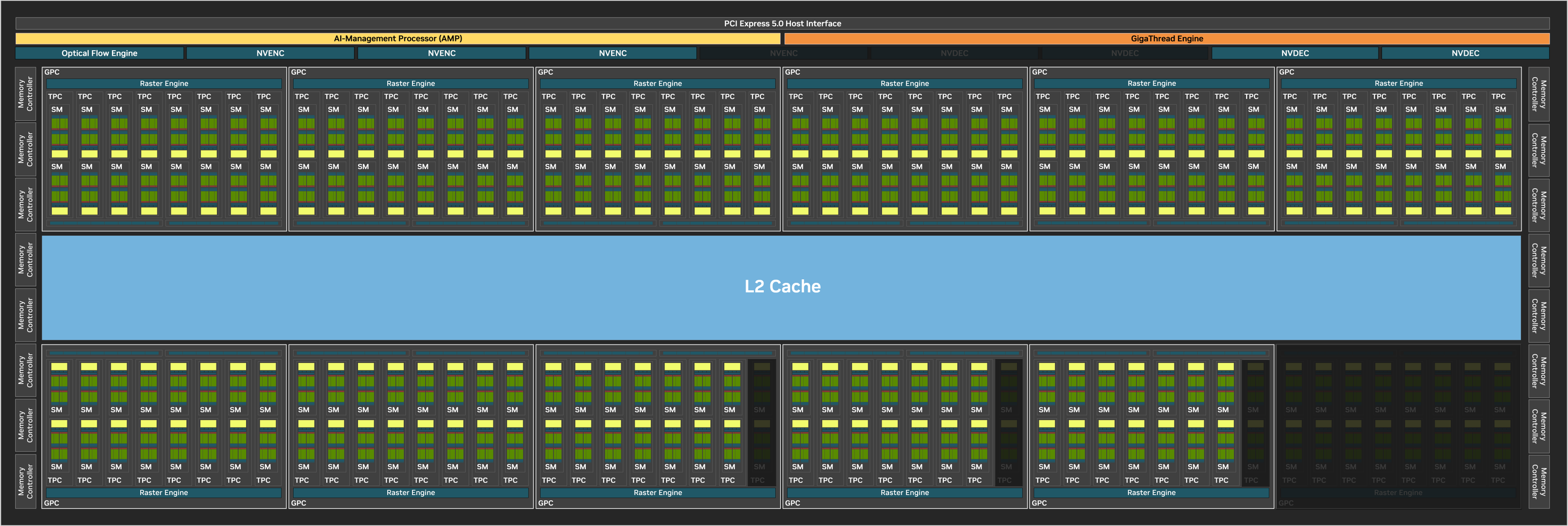 Высокоуровневое строение графических процессоров компании Nvidia не изменяется с Ampere. Как и остальные графические процессоры компании, чип GB202 состоит из укрупненных кластеров Graphics Processing Cluster (GPC), которые включают несколько кластеров текстурной обработки Texture Processing Cluster (TPC), содержащих потоковые процессоры Streaming Multiprocessor (SM), блоки растеризации ROP и контроллеры памяти. Кластер GPC самостоятельно производит основные вычисления внутри кластера, и включает свой движок растеризации Raster Engine, несколько кластеров TPC, состоящих из вдвое большего количества мультипроцессоров SM. Рассмотрим блок-схему графического процессора в его урезанной конфигурации: