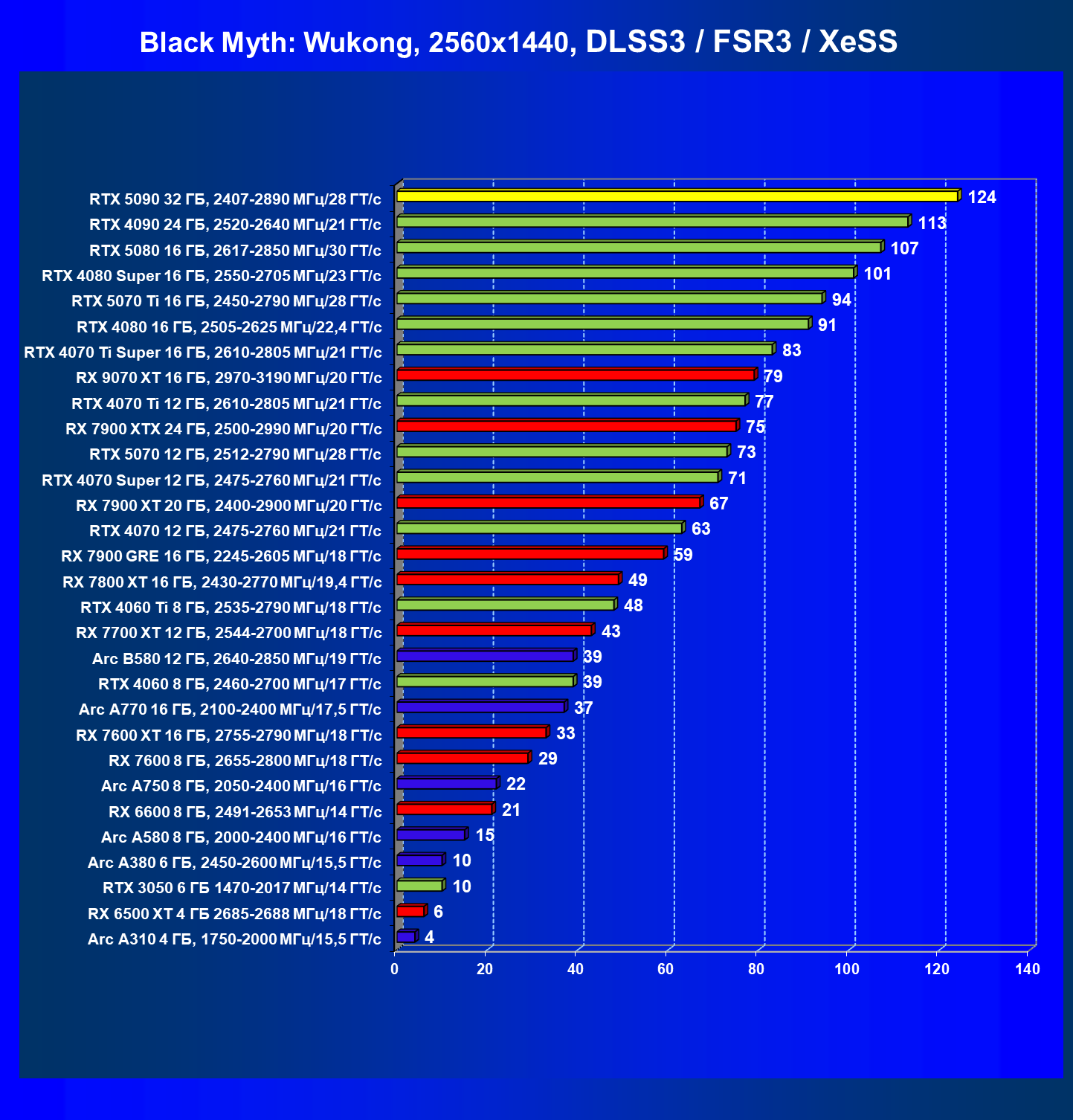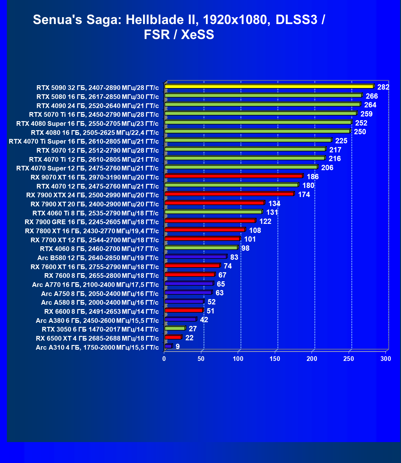 | 17 | RX 7900 XTX 24 ГБ, 2500—2990 МГц/20 ГТ/с | 372 | 4424 | 119 000 |
