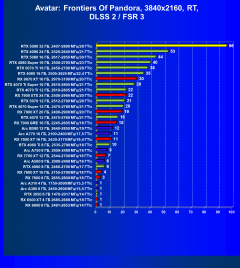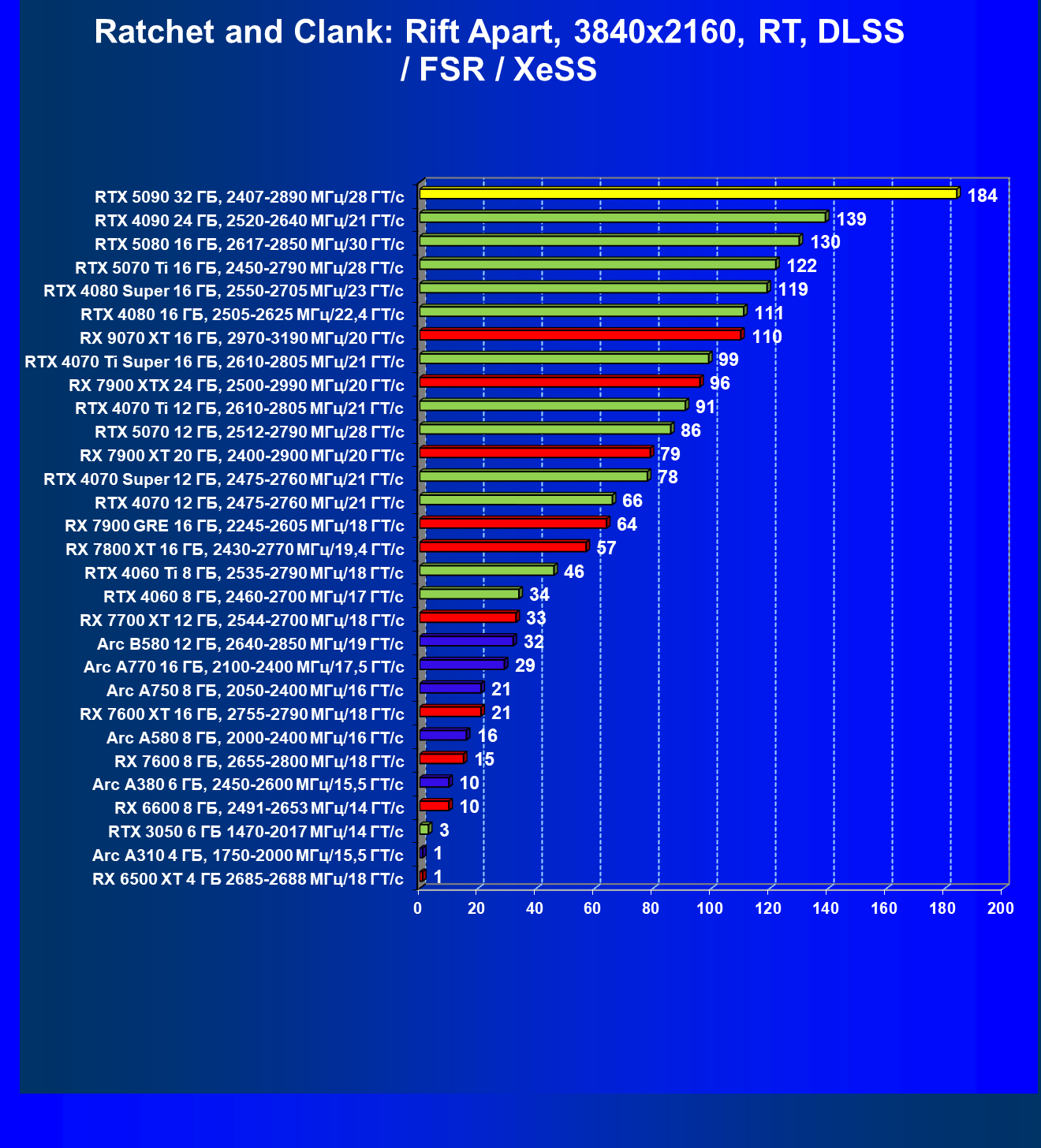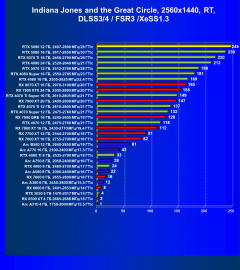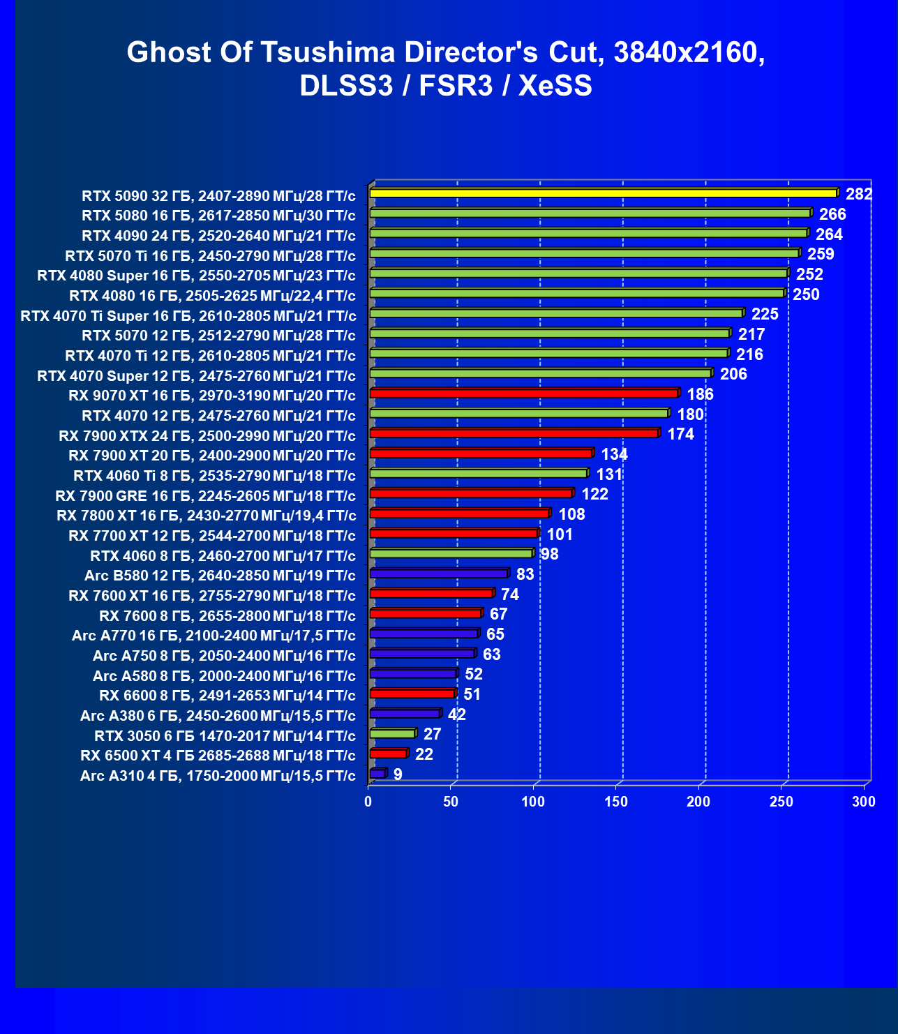 Если же посмотреть на энергоэффективность, то GeForce RTX 5090 по этому показателю ожидаемо находится где-то в середине списка (в классических играх — ближе к концу, в играх с RT/DLSS/XeSS/FSR — ближе к началу), ибо карта с потреблением 575 Вт должна выдавать чудеса производительности, чтобы быть в лидерах по этому показателю. Даже GeForce RTX 4090 находится выше в рейтинге за счет гораздо меньшего потребления (450 Вт). А ведь на заре выхода таких карт мы тоже видели потребление около 600 Вт, но затем Nvidia программным путем смогла оптимизировать потребление без ущерба для производительности.